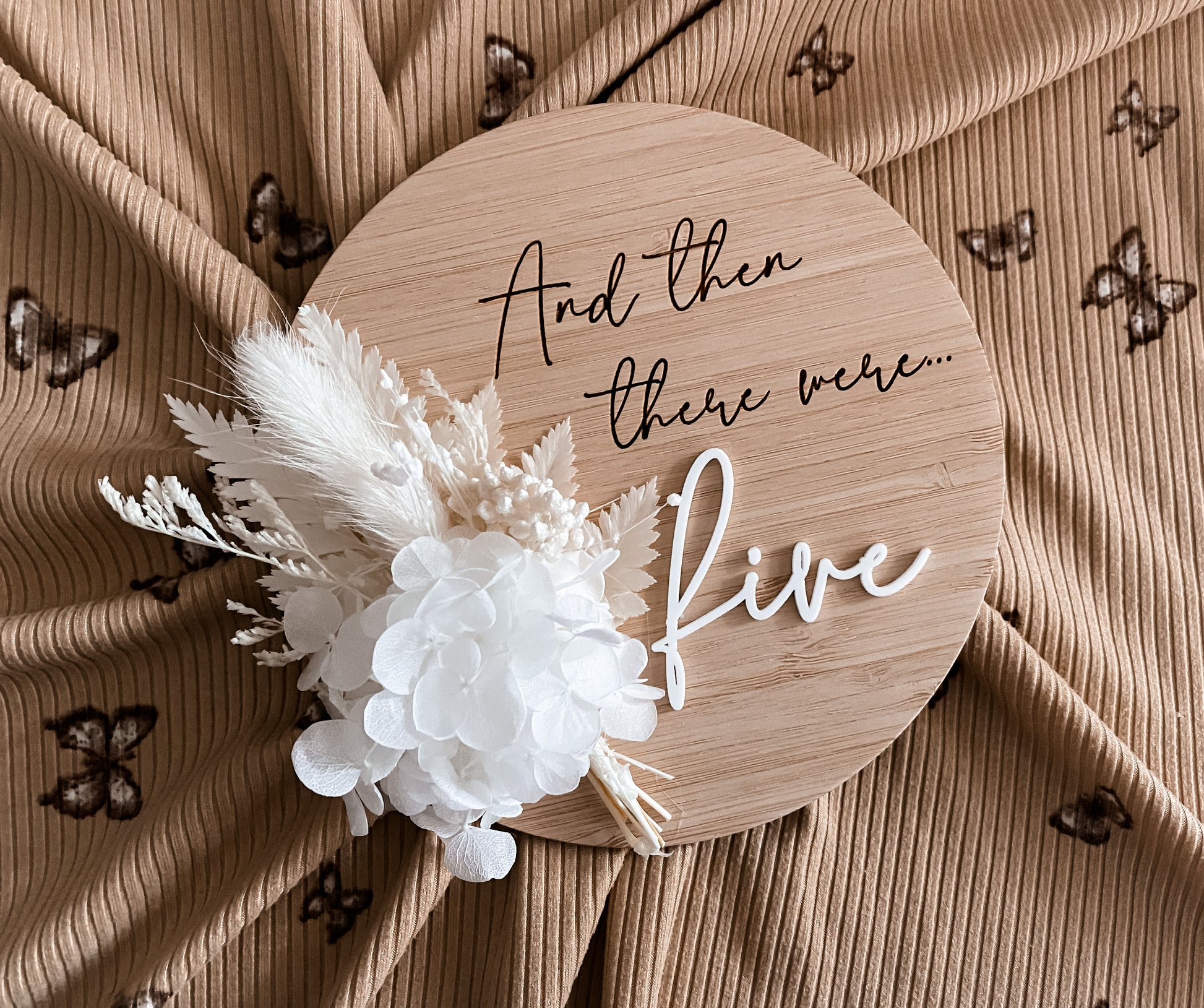What a beautiful way to announce the newest addition to your family! Just let us know what number you’d like on there! It will be spelt out example: five NOT 5 this comes with a white bunch but please leave me a note at the checkout if you’d like it changed for any other colour we do! Made on bamboo and 15cm