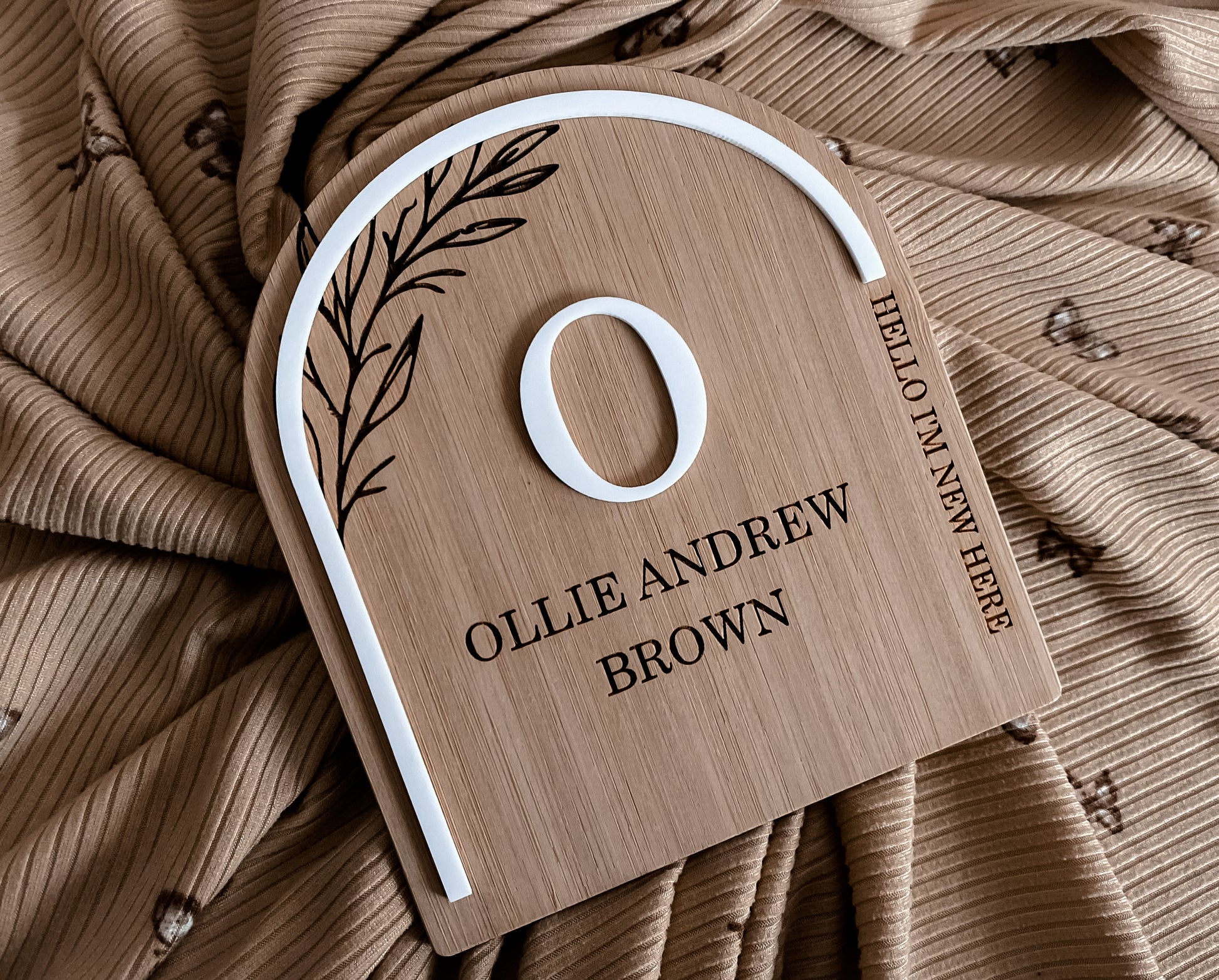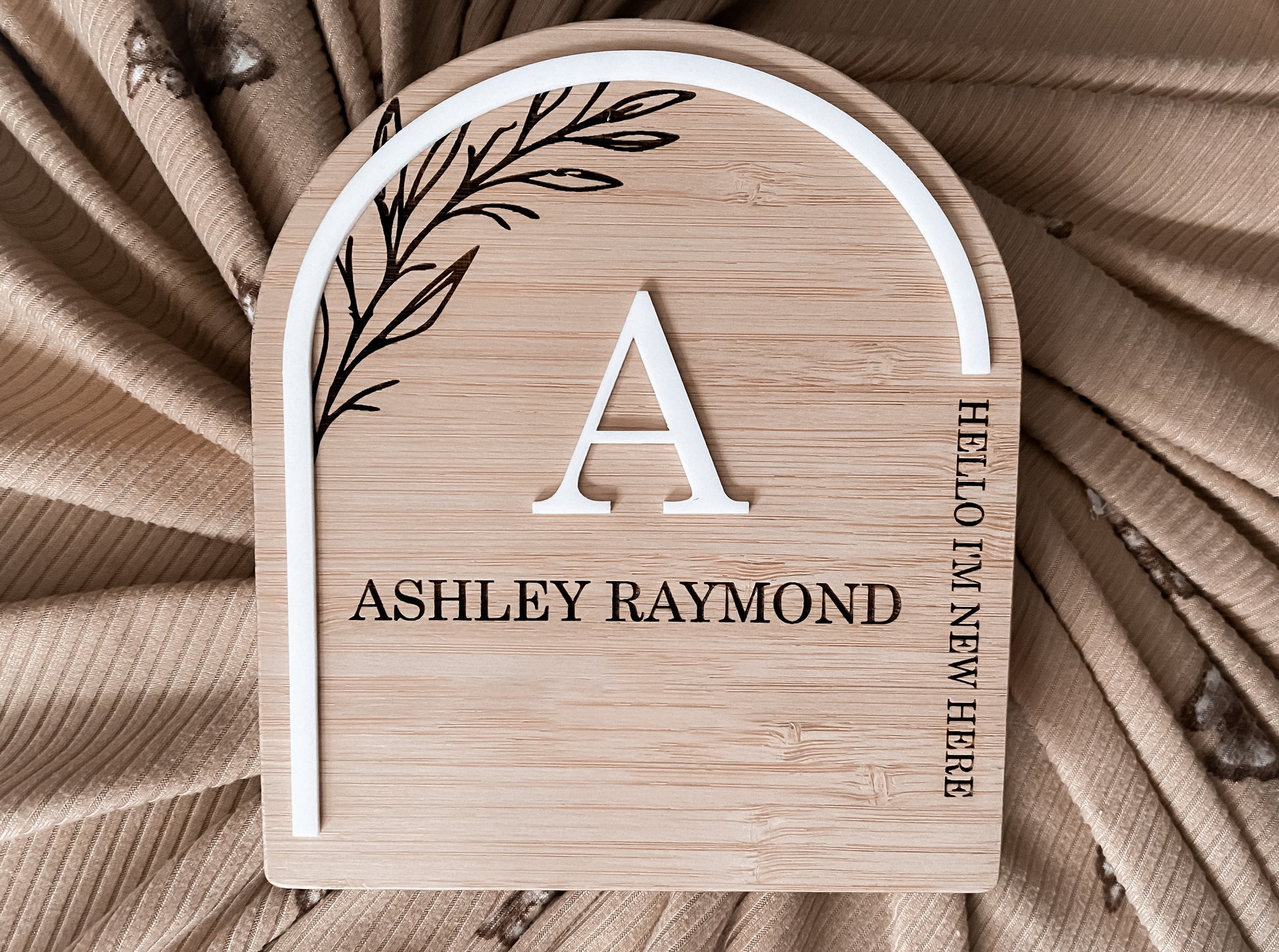 This unique style of announcement is a show stopping piece. This is the neutral leaf design, which has an acrylic letter above the name (the first letter of their first name) and underneath in capitals is the name/full name. On the side it’ll say hello I’m new here!