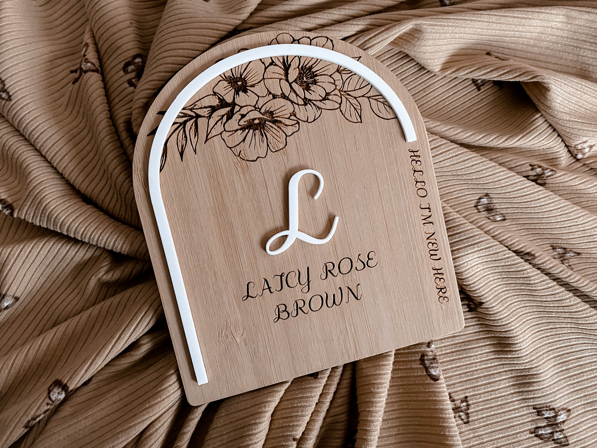 This unique style of announcement is a show stopping piece. This is the engraved floral design, which has an acrylic letter above the name (the first letter of their first name) and underneath in capitals is the name/full name. On the side it’ll say hello I’m new here! Arch is roughly 14cm high