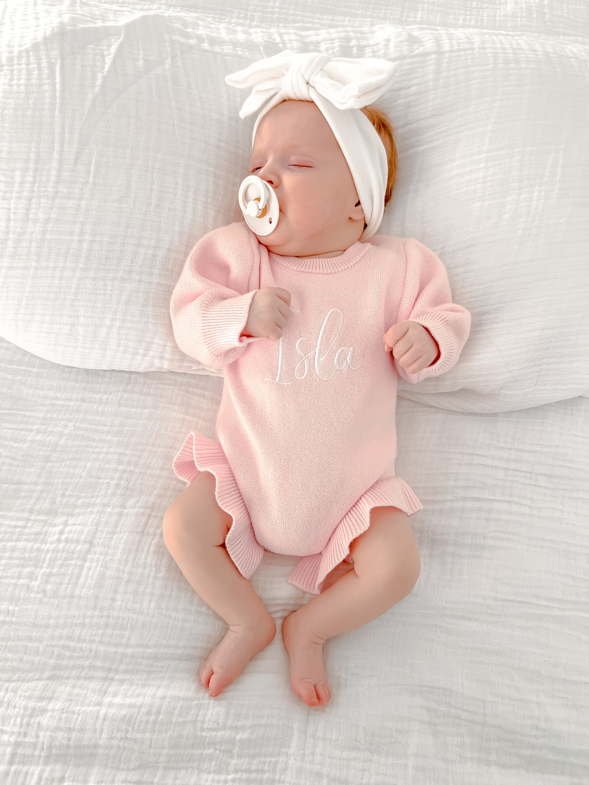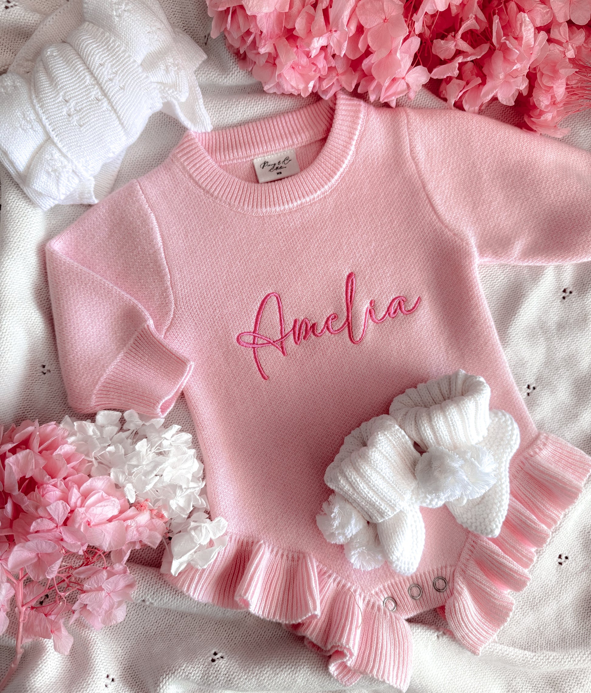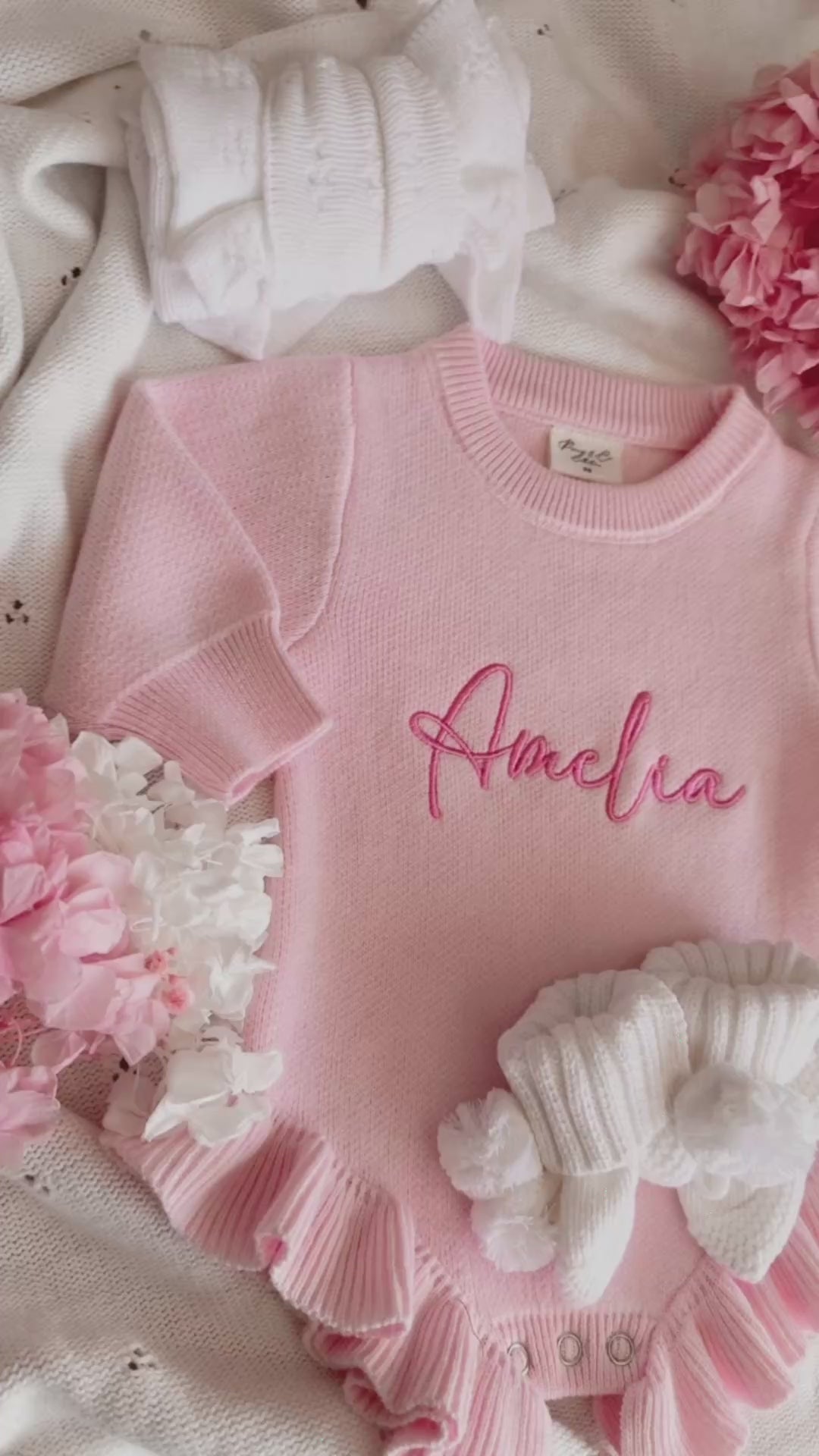 Our beautiful pink frill leg romper is made from the finest quality cotton! The gorgeous touch of being able to personalised it with your little ones name makes it the perfect way to announce their name or you can have hello world or shes here etc as the wording!