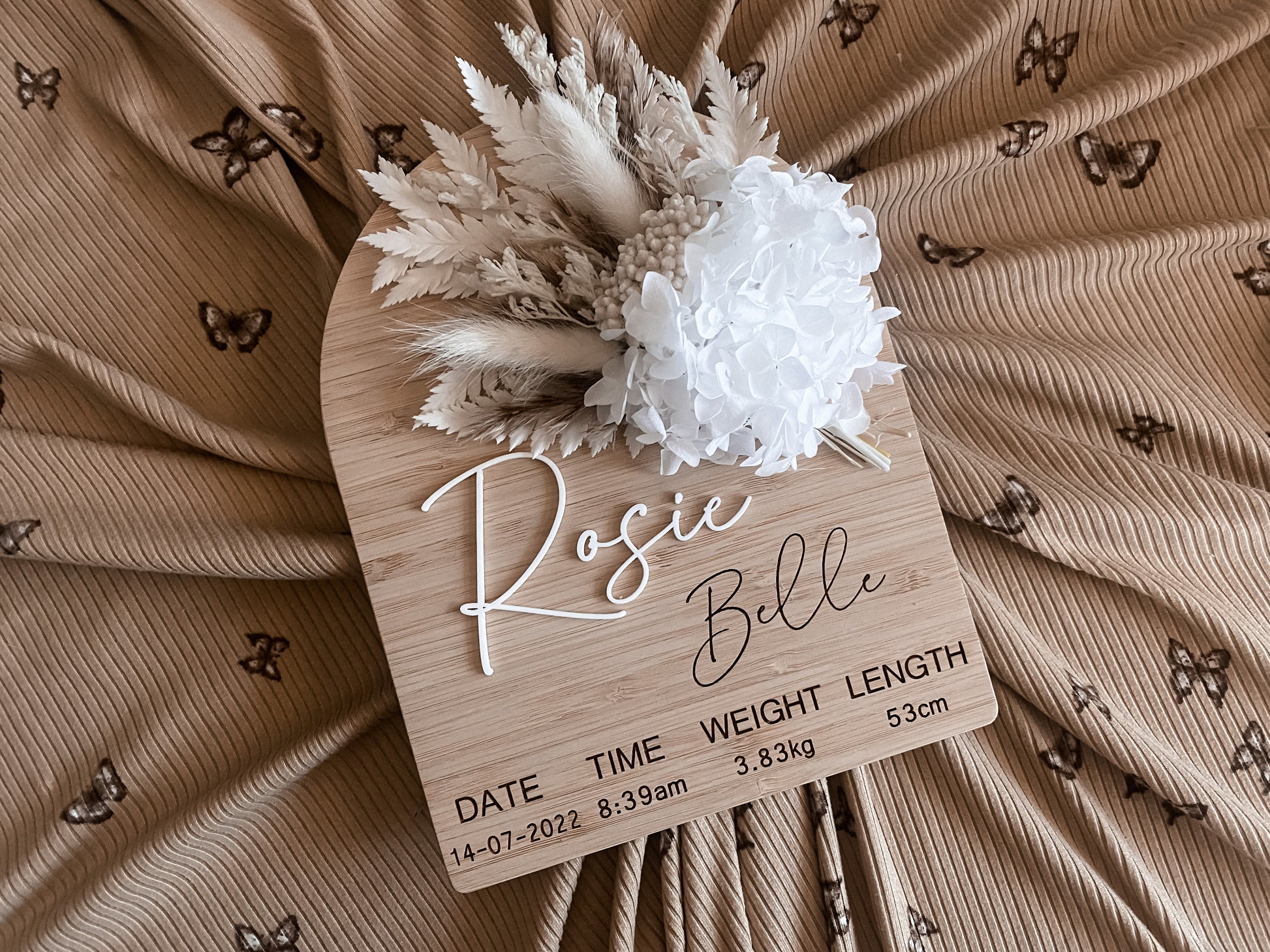 These are a stunning piece to have in your baby’s nursery with all their birth details engraved onto the arch.