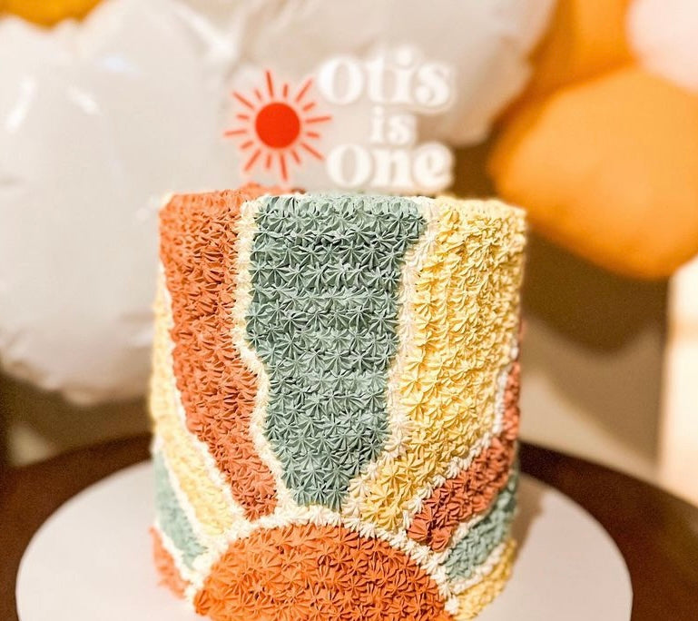 Made on frosted acrylic with an orange sun and white lettering this sweet cake topper is the perfect piece for a boho themed birthday!