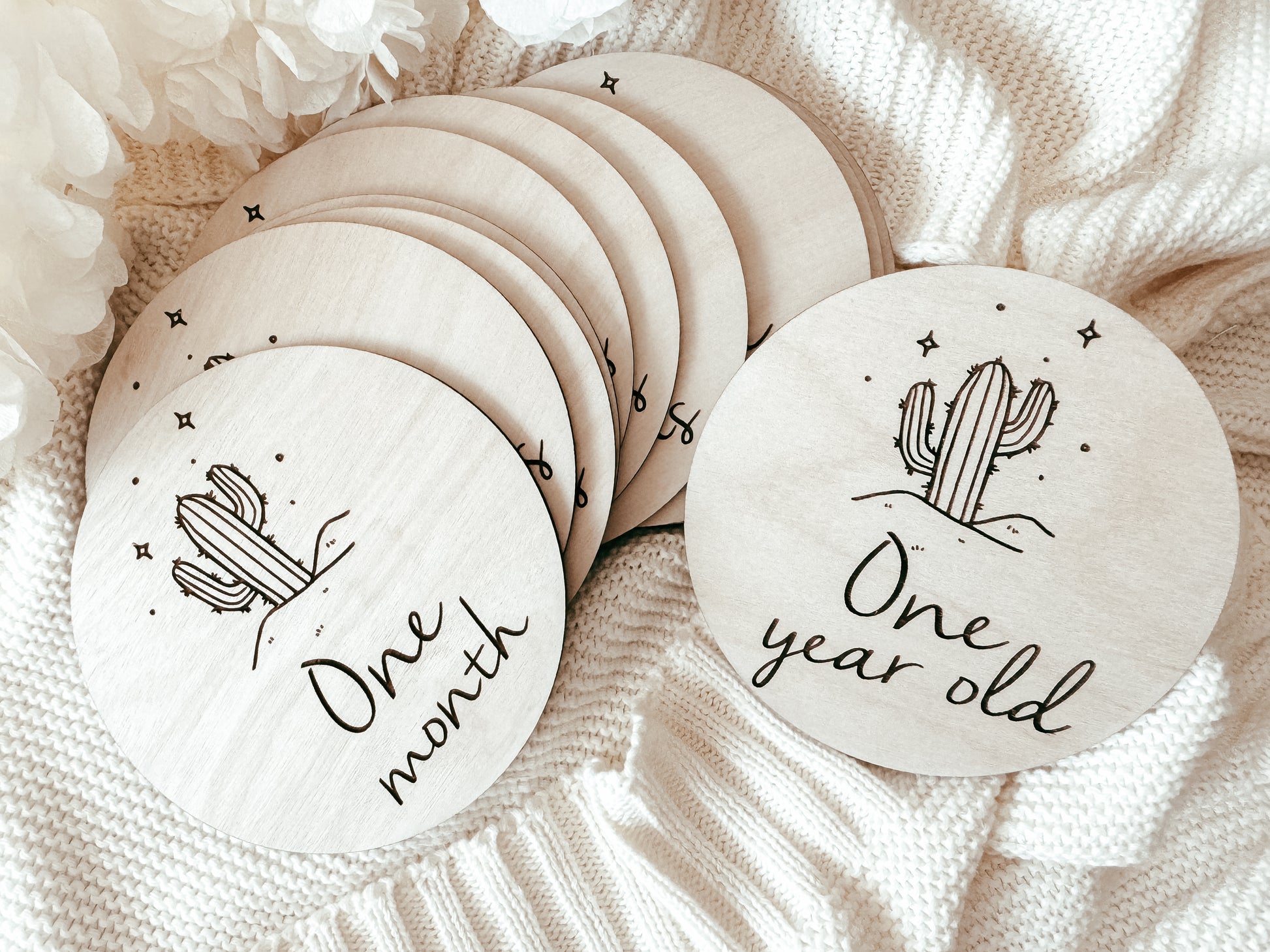 Chose from a round 11cm shape or an arch shape of milestones! Each pack comes with one month to one year old!