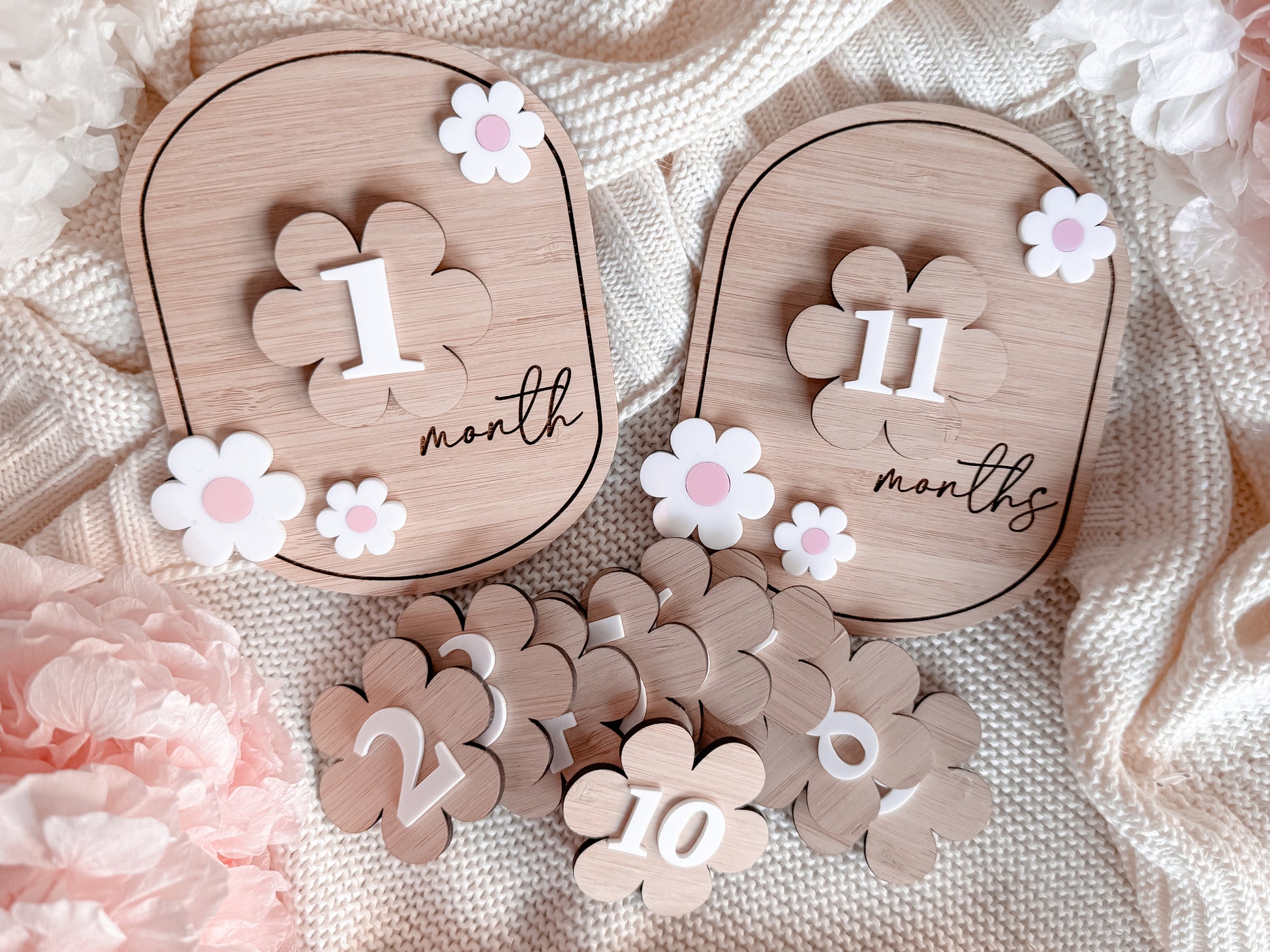 Aren’t these so sweet! Made on bamboo they come with a “month” and “months” plaques one month and then 2-12 months with Velcro on the back you simply peel them off and use the correct ones each month!