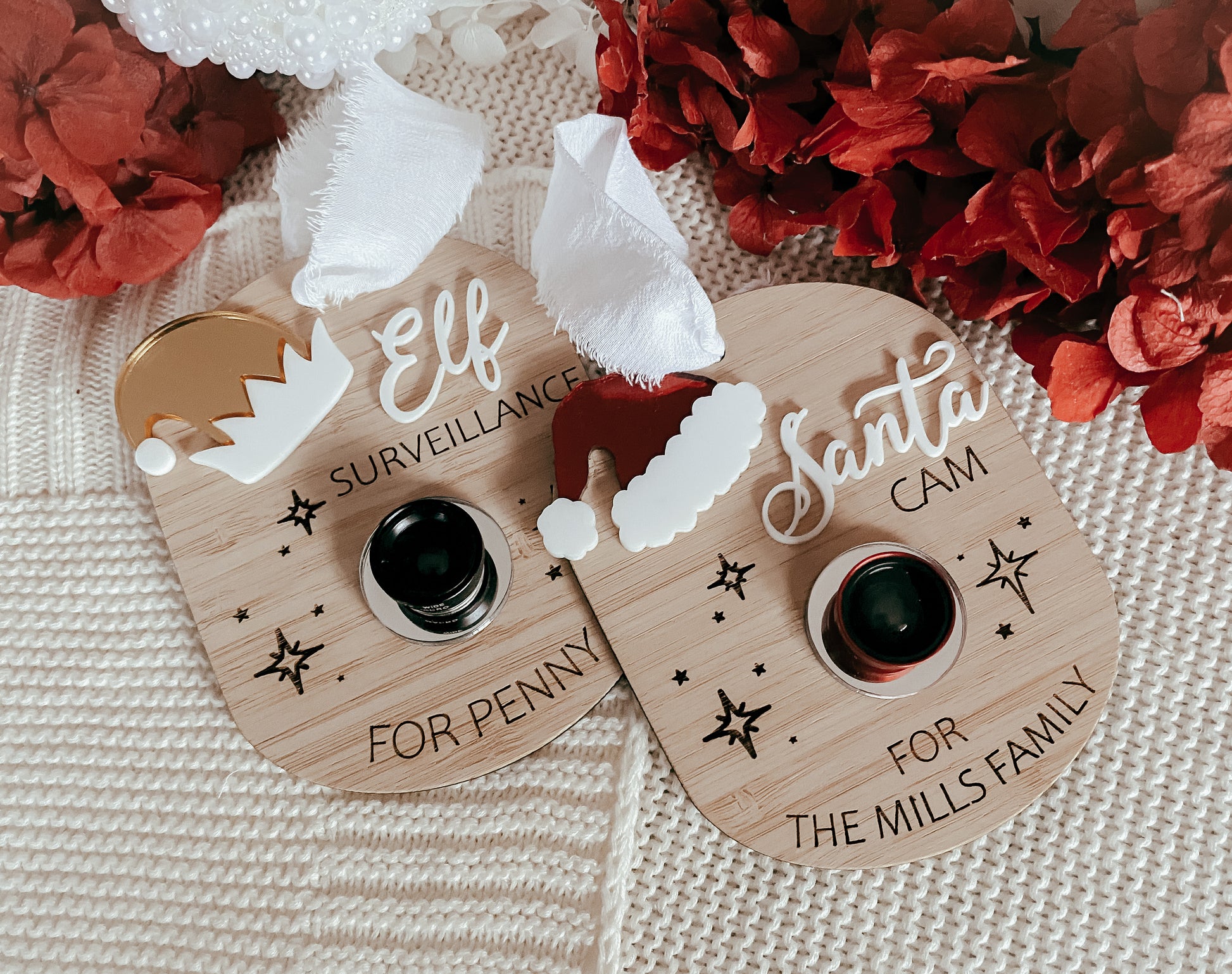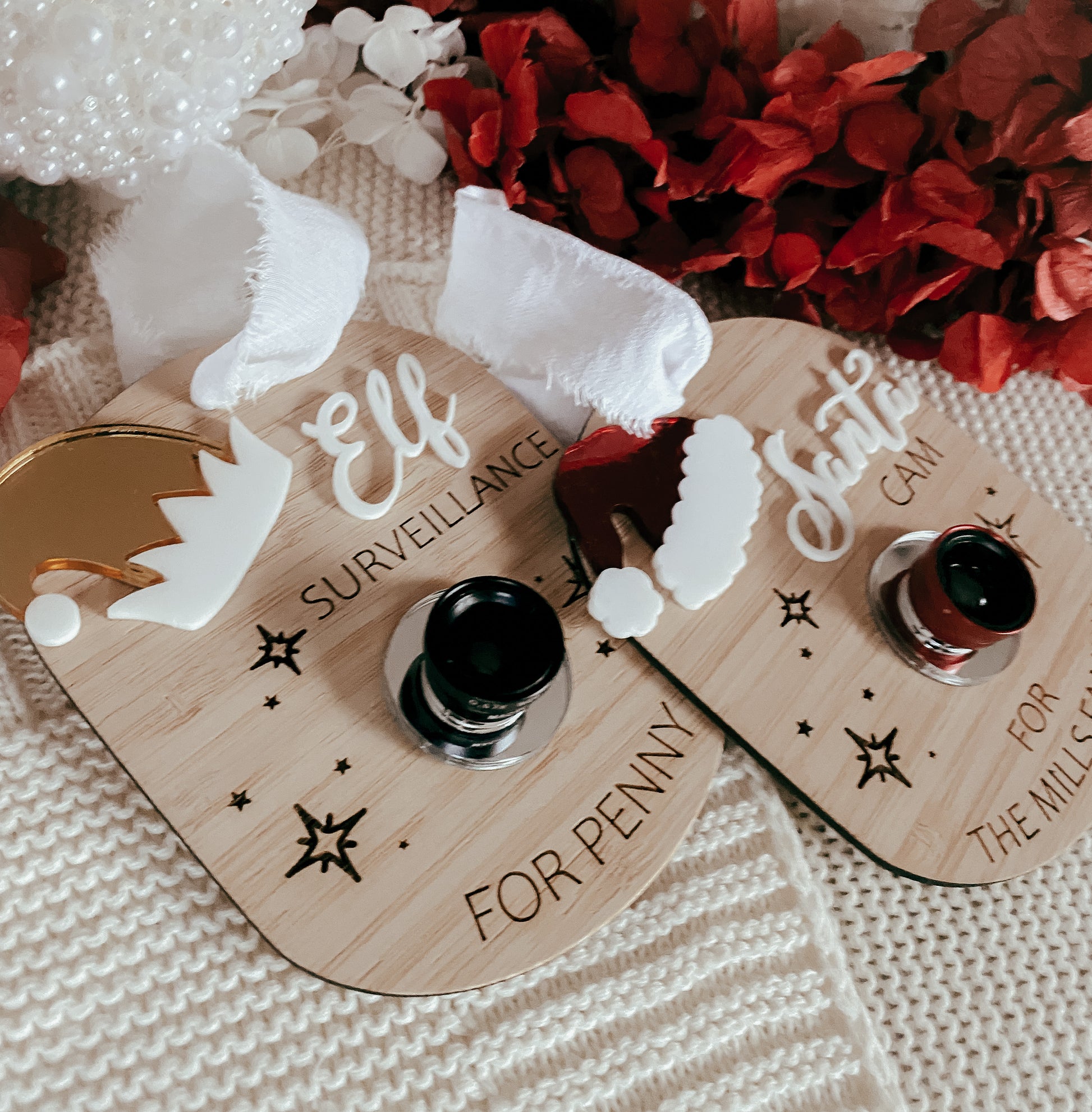 just the same as our other piece these come with a sweet santa/elf hat in mirrored acrylic but this time an actual camera lens (doesn’t work but hey we will try everything to make sure they behave!) to make it look like there may be some surveillance happening! Have your families name or a child’s name and can hang on a tree or in their room! Please make sure family names say “the brown family” not just brown as we cannot tell if it’s a surname or name!