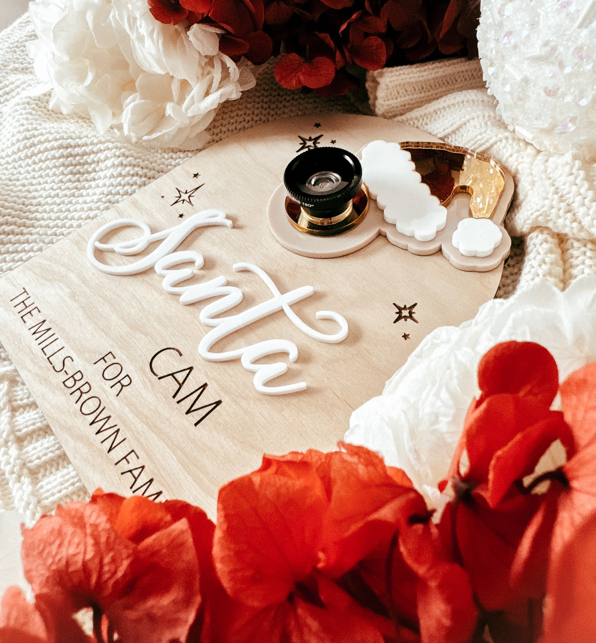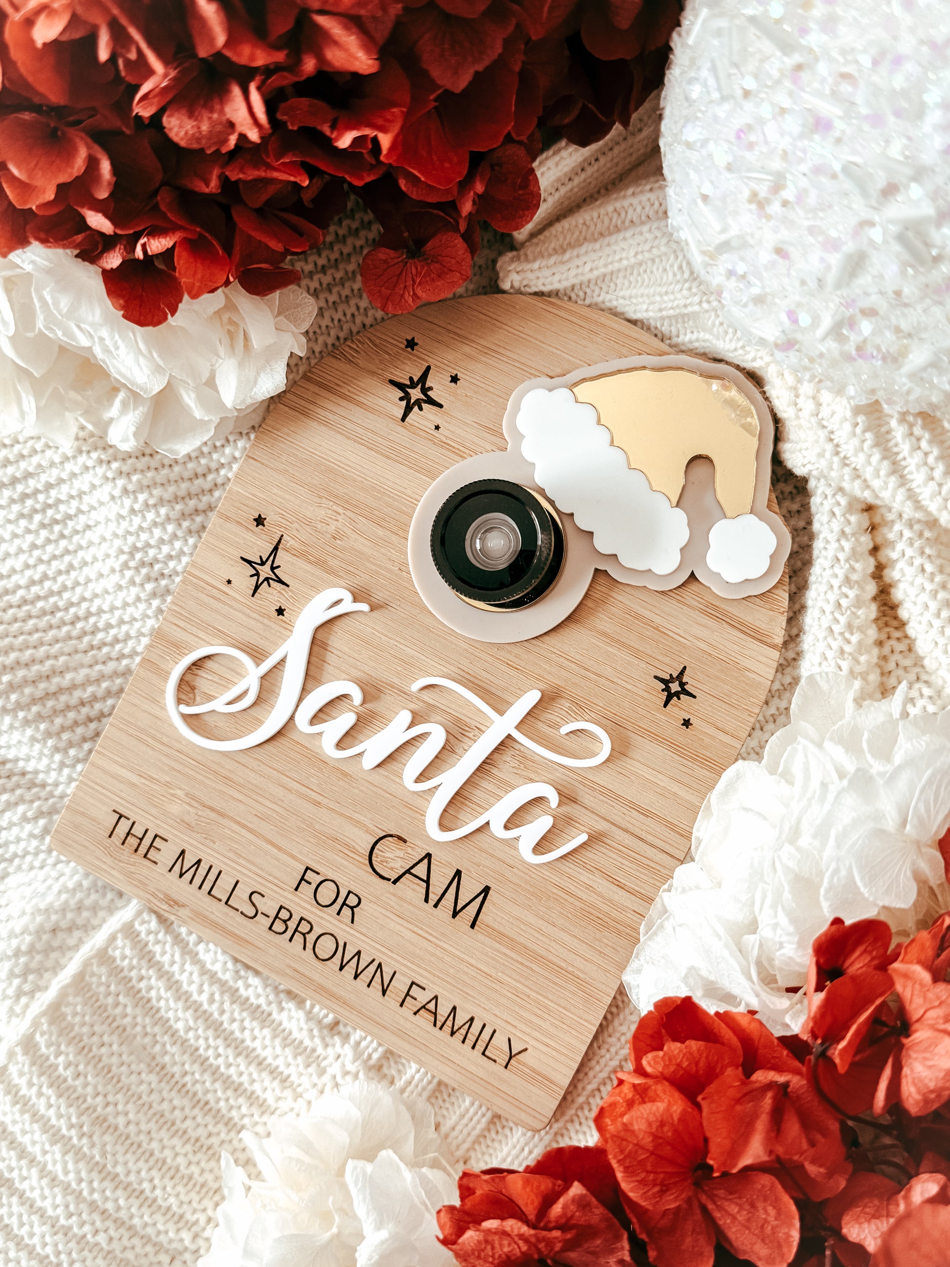 Pick between your choice of birch wood or bamboo (bamboo is slightly darker) for this standing Santa cam! - comes with a stand - with an actual camera lens (doesn’t work but hey they don’t know that!) with beautiful mirrored Santa hat and engraved and acrylic wording this is a great piece to have to attempt to keep the little ones on their best behaviour!