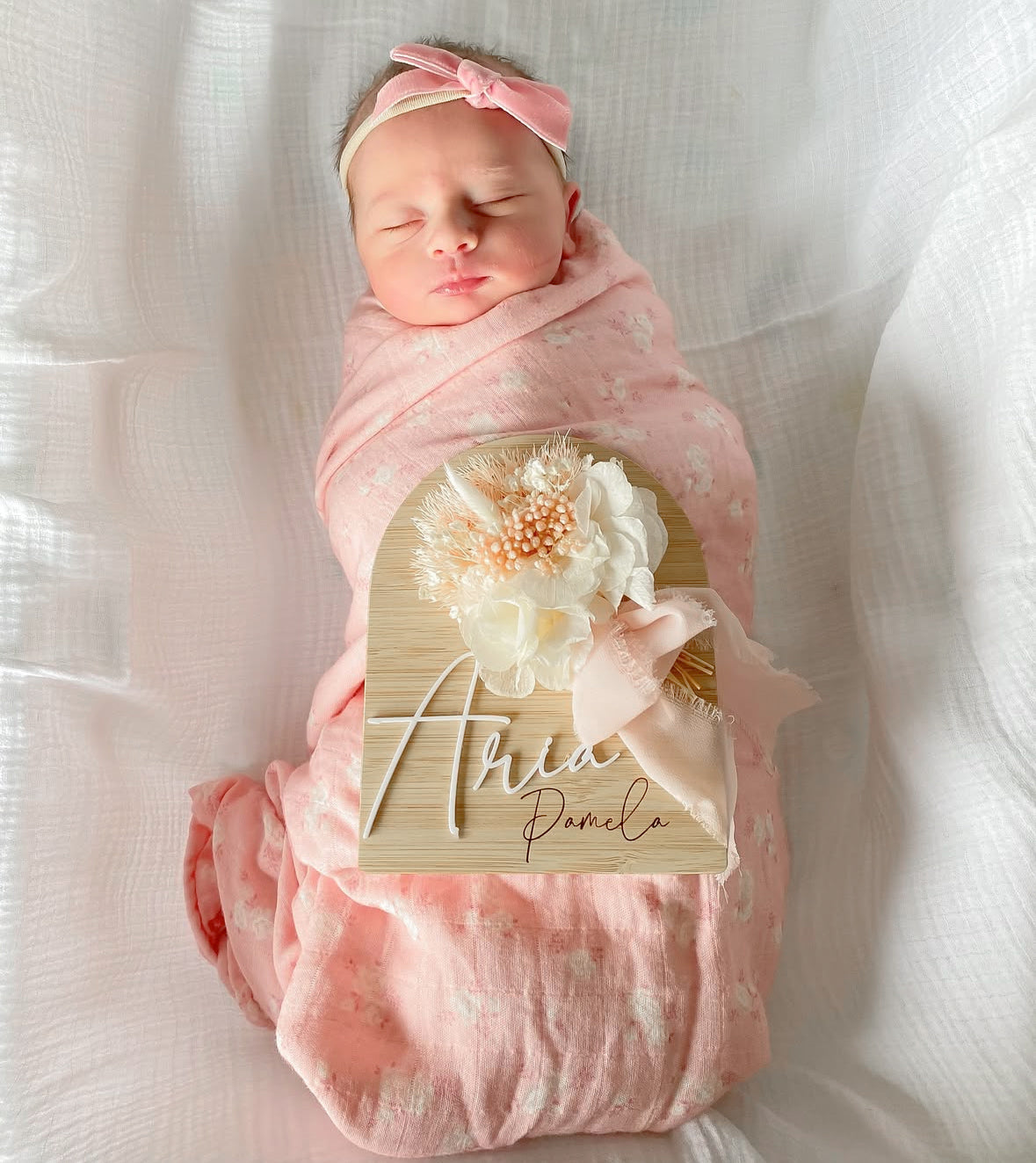 This beautiful arch shape announcement comes with a pink and white mixed bunch of florals and a mauve silk ribbon and is a stunning addition to your birth announcement, and can be nursery decor once used!