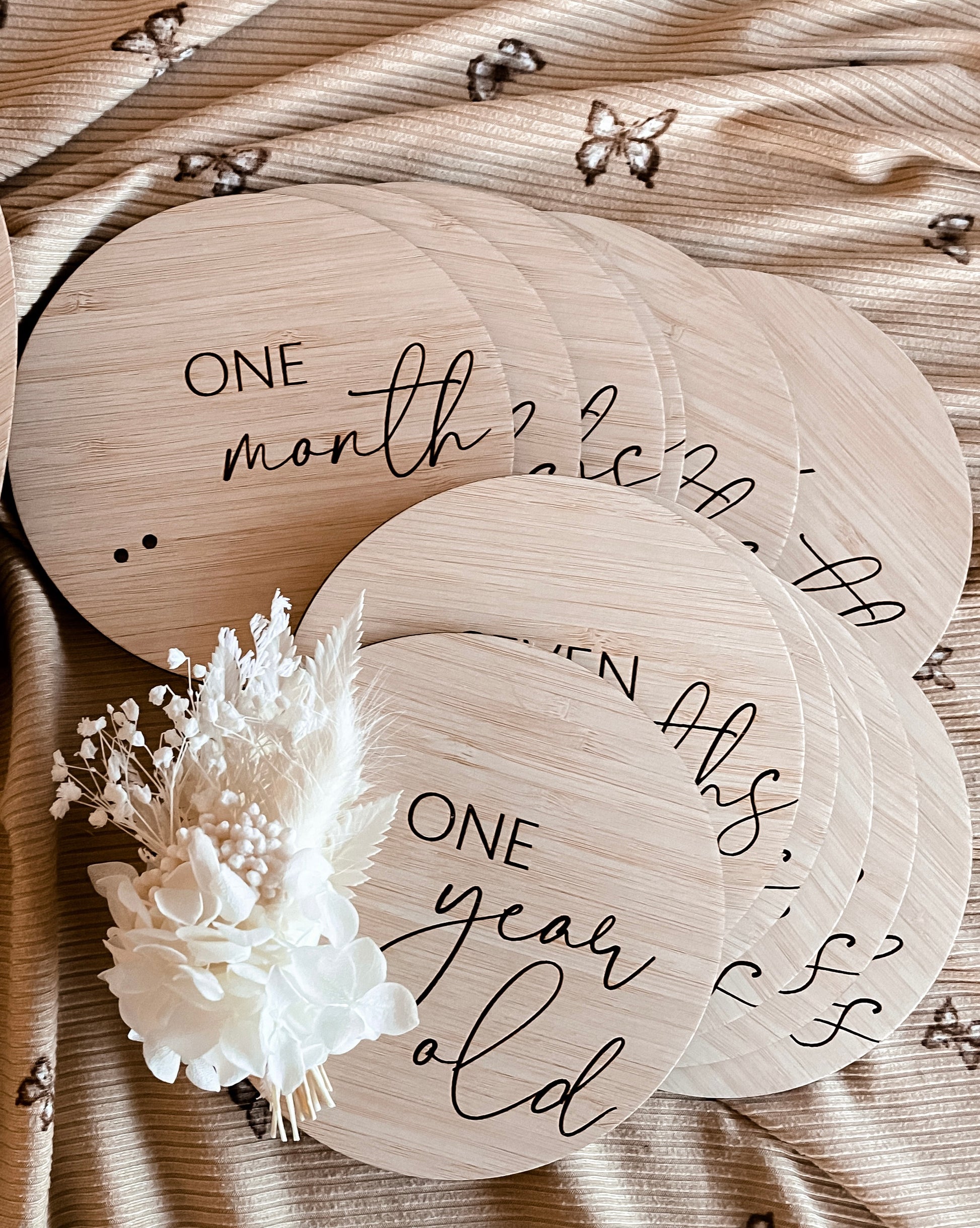 Using string provided to attach the dried floral bunch of your choice, these one month to one year old milestones are a beautiful statement piece for your monthly photos.
