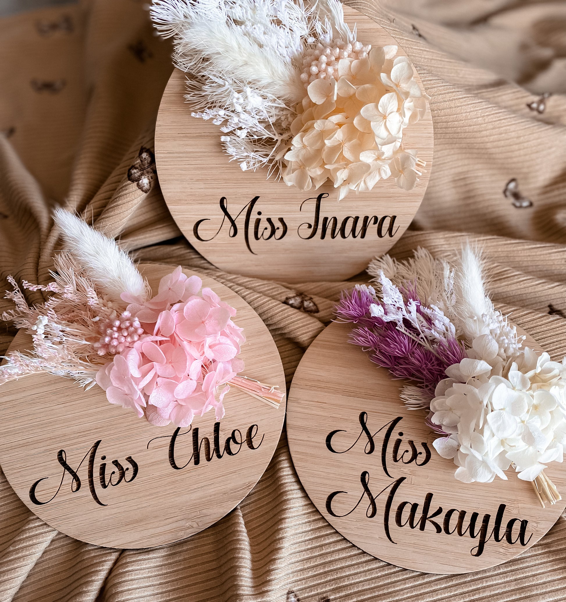 This 13cm disc is a sweet gift for your little ones teacher! Pick from peach and white, pink and white or purple and white floral bunches too add to your piece :)