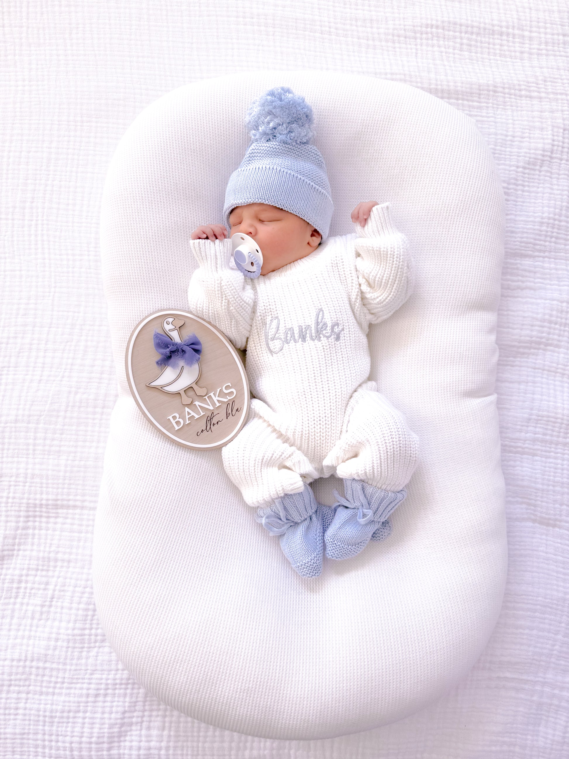 These gorgeous booties are a smaller soft knit with a dusty blue colour tone this colour matches our blue pom pom hat! With little pom-poms for the extra touch!