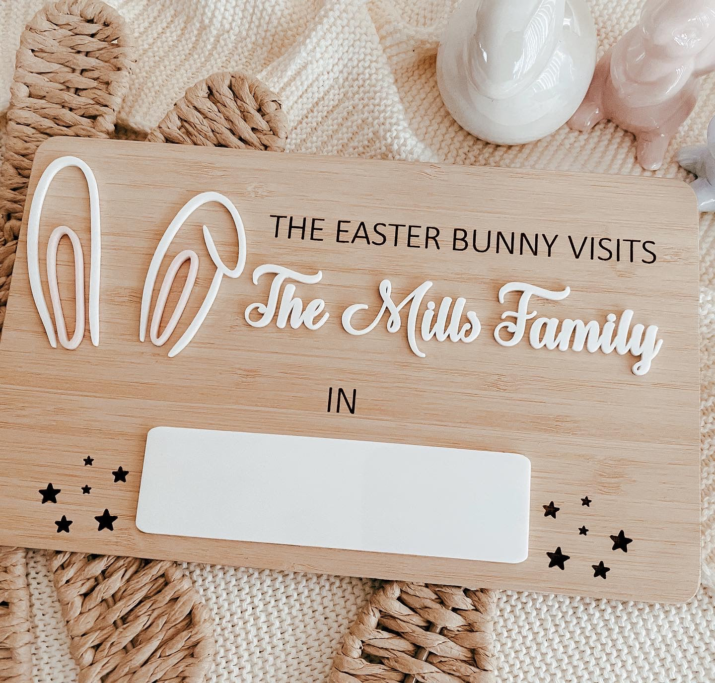 Made on bamboo and 20cms wide with an acrylic piece to write the days! The bunny ears you can pick between pink blue or neutral inserts and add your family or children’s names! If picking a family name please write the mills family not mills as we won’t know if it’s a child’s or family name, if you don’t want any names you can put “our home”