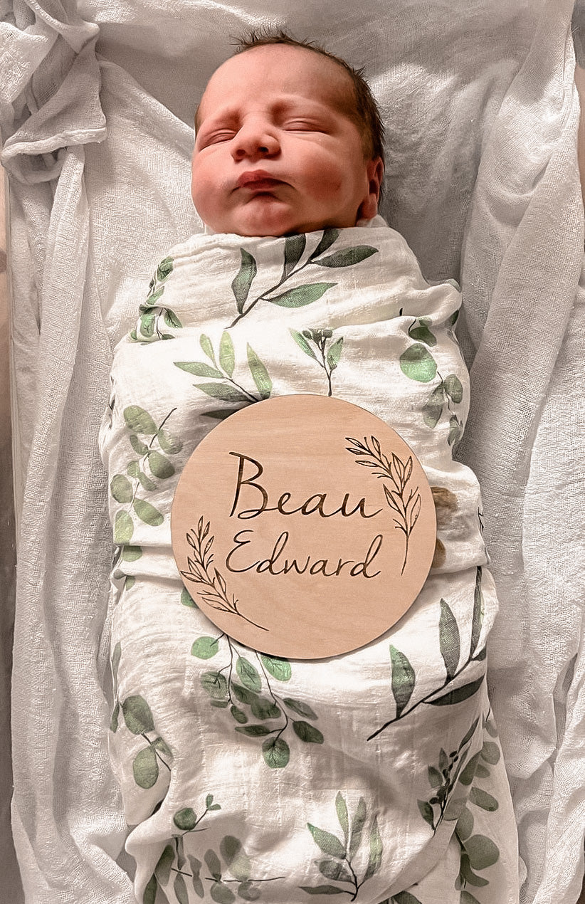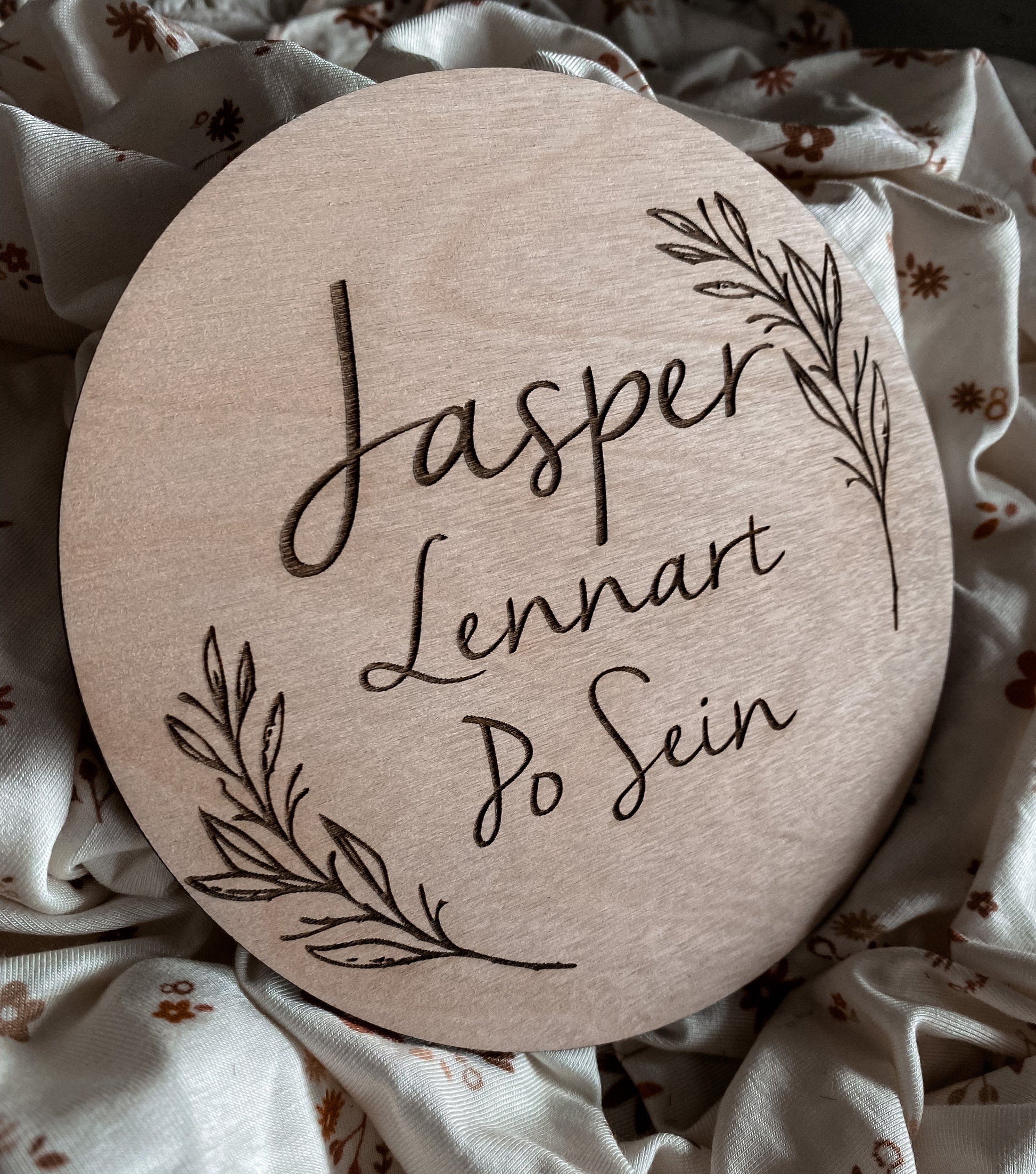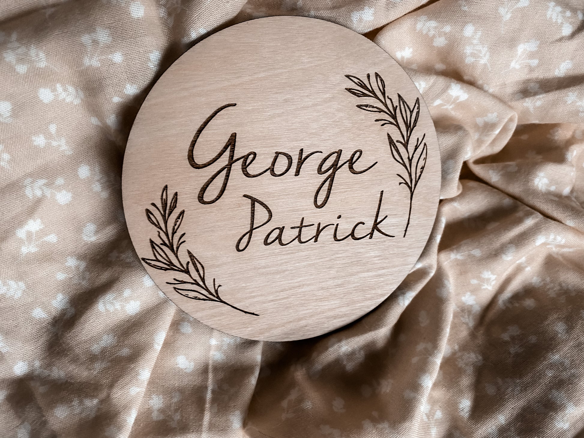 These engraved birth announcements are made on 14cm birch wood, chose from a range of font options, and different ways to display the name like acrylic, engraved or a mix of both.
