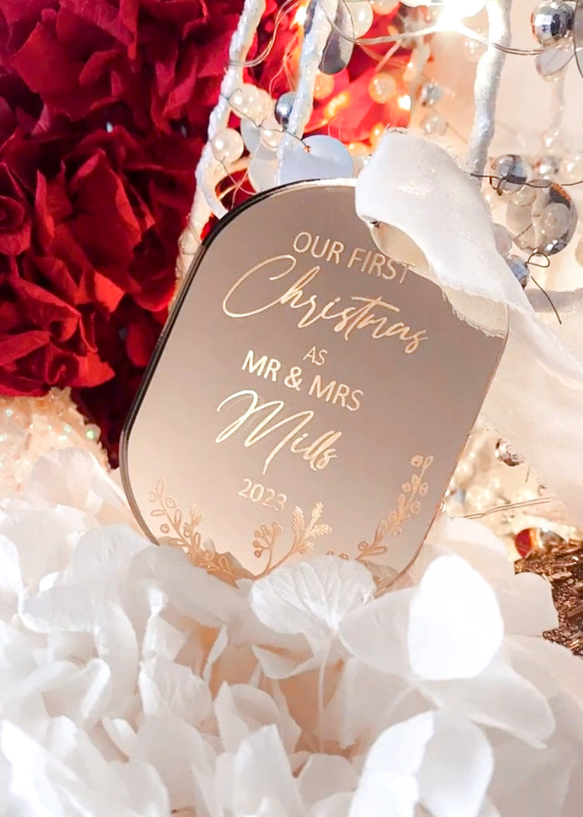 Celebrating the first Christmas as a married couple! This tree decoration is the perfect piece to use and keep to remember such a special occasion! Made on mirrored acrylic just select the colour you’d like and tell us the surname!
