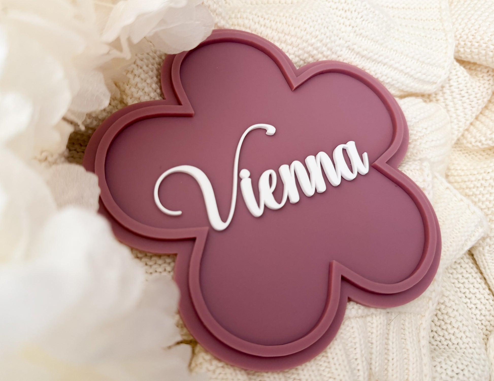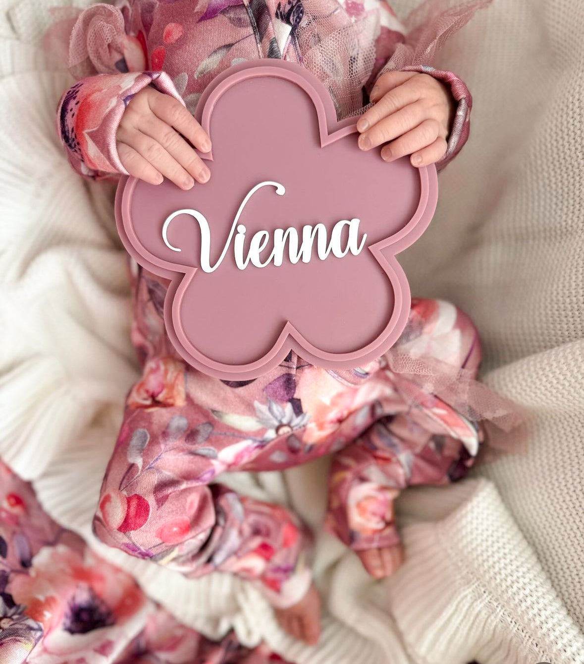 Made on dusty pink acrylic this beautiful flower shaped birth announcement is gorgeous! With a tone on tone background and border with a white name that makes it pop it’ll be a beautiful keepsake and photo prop!