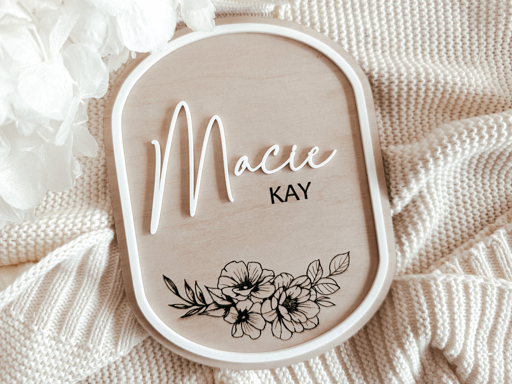 A beautiful floral patterned birth announcement sign! If you don’t have a name picked you can put hello world or she’s here, hello beautiful… so many options etc you don’t need a name! This lovely piece is made on birch wood with an acrylic white border which adds a lovely extra element! The floral design is engraved into the wood, and the first name will be white acrylic any other names etc will be underneath in upper case plain writing.