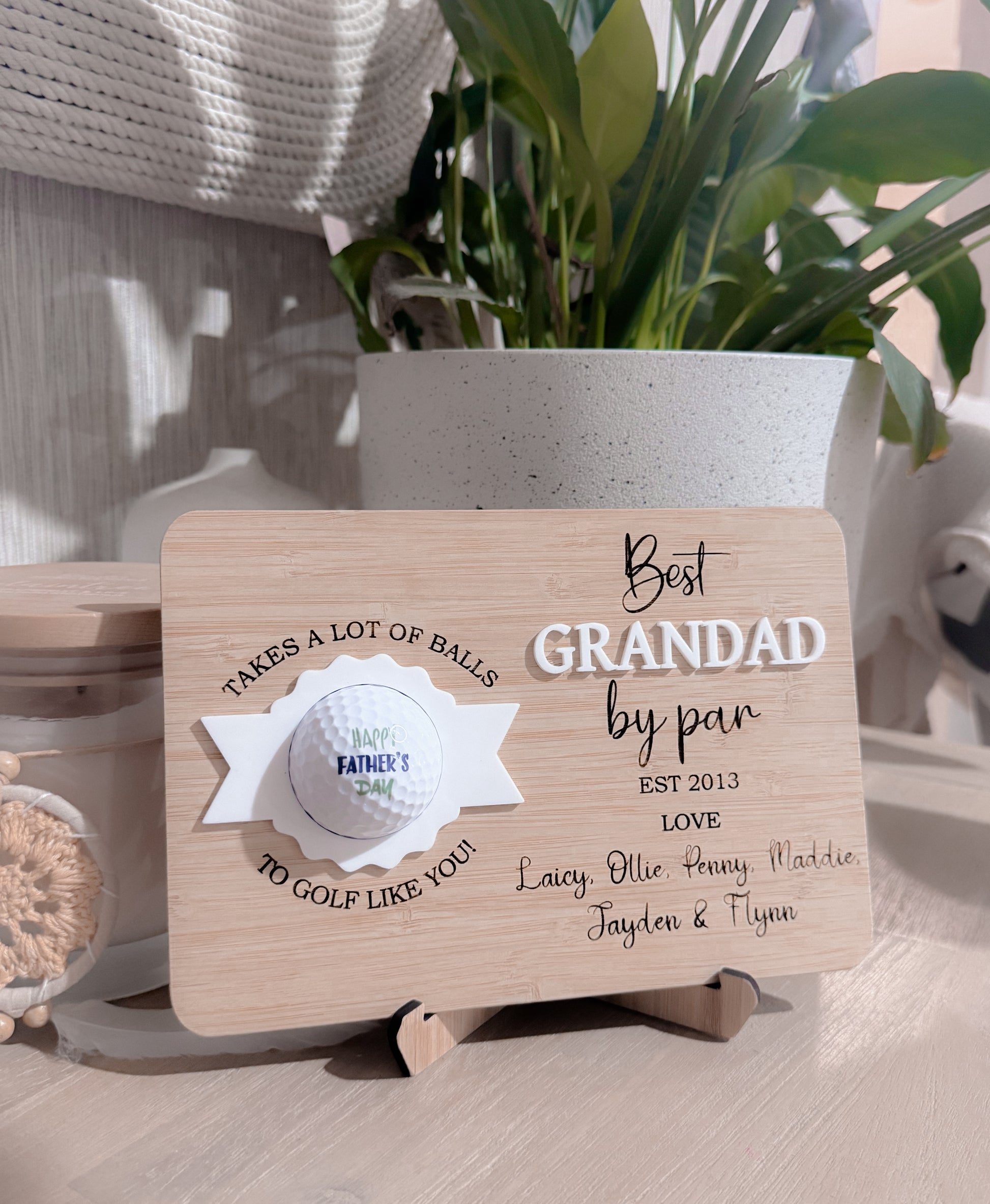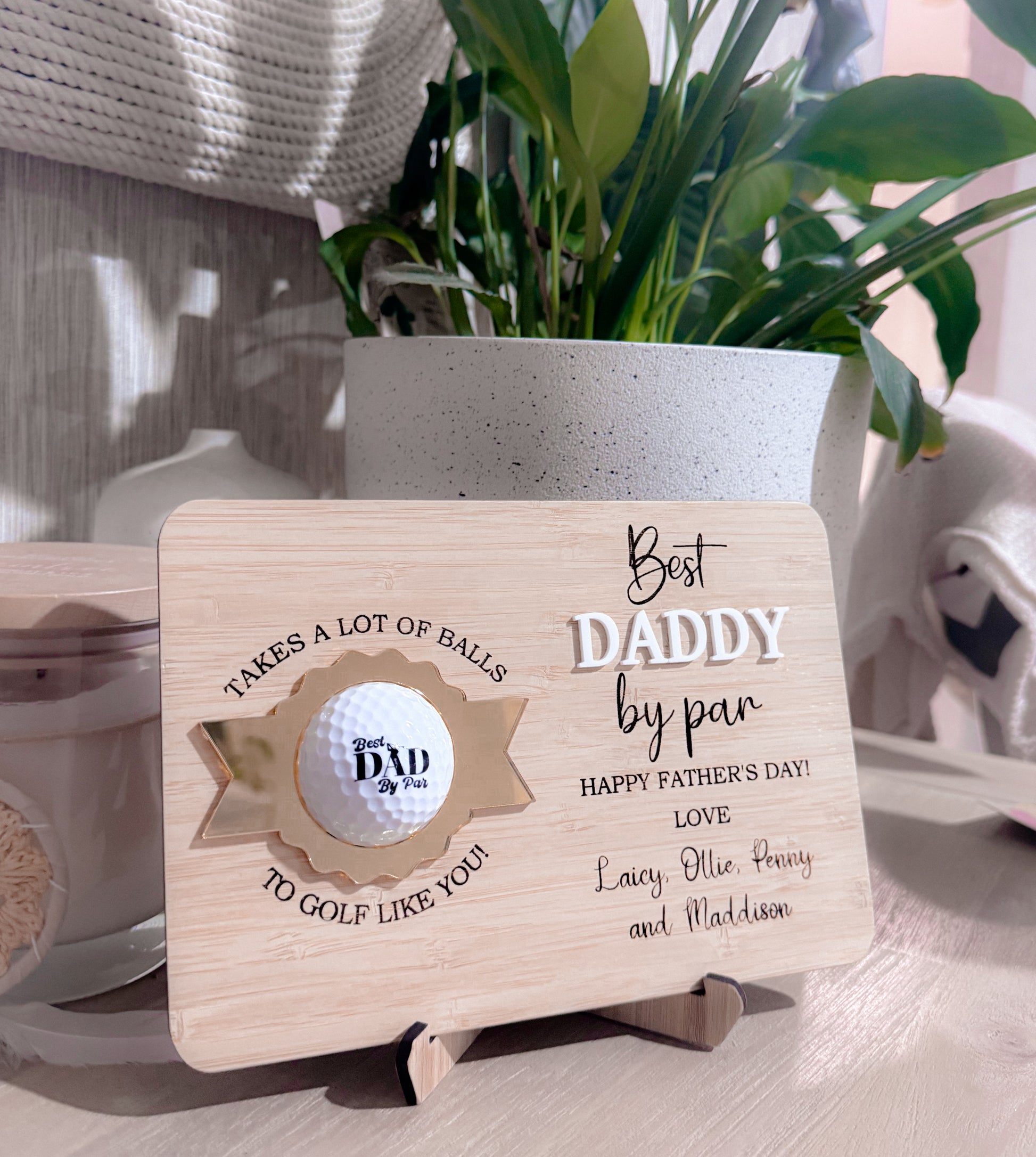 A golf ball which will say “happy Father’s Day” will be attached to the piece, which your choice of gold mirror acrylic or white acrylic frame around it!