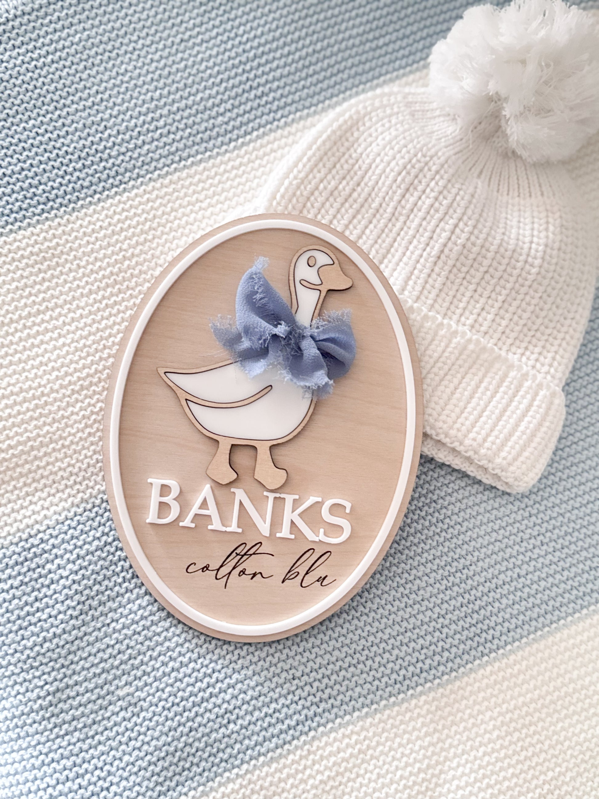 Shop the newest product to our store! A gorgeous goose birth announcement sign with a ribbon colour of your choice!