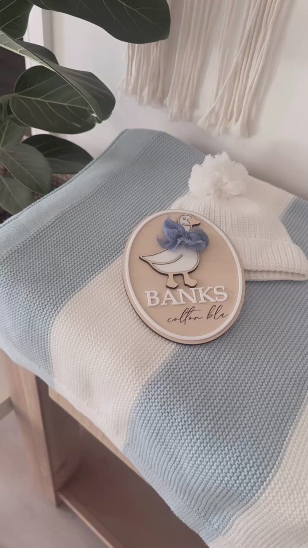 Made on birch wood with an acrylic border then featuring a sweet goose made of white acrylic with a birch wood border, underneath first name will be a white capital acrylic plain font and underneath is a cursive all lower case font engraved into the wood!