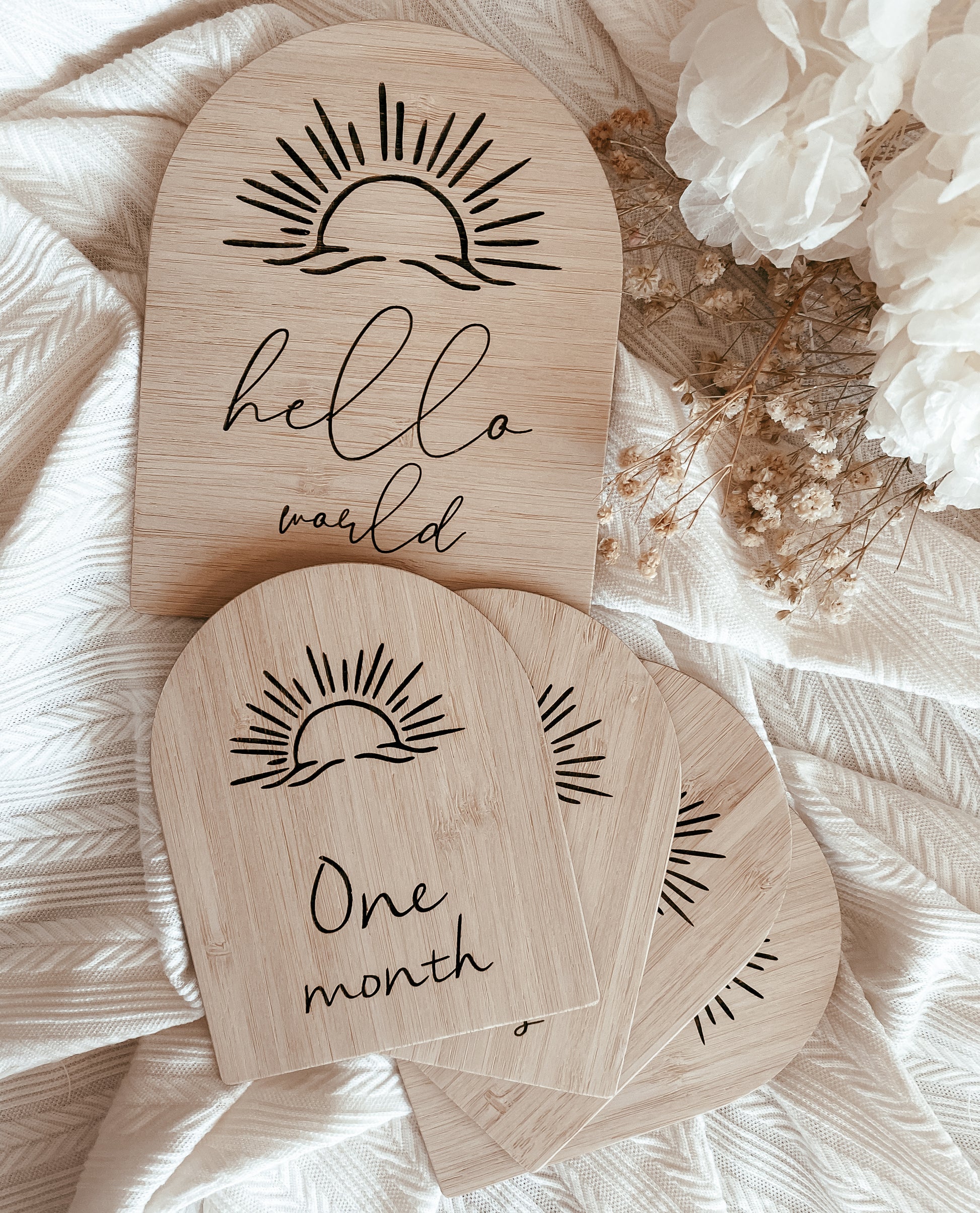 Hello world boho Sun wooden birth announcement and a one month to one year old milestone pack with engraved leaves on the discs! We are all for saving you money so we’ve made this bundle cheaper for you all to purchase both items!