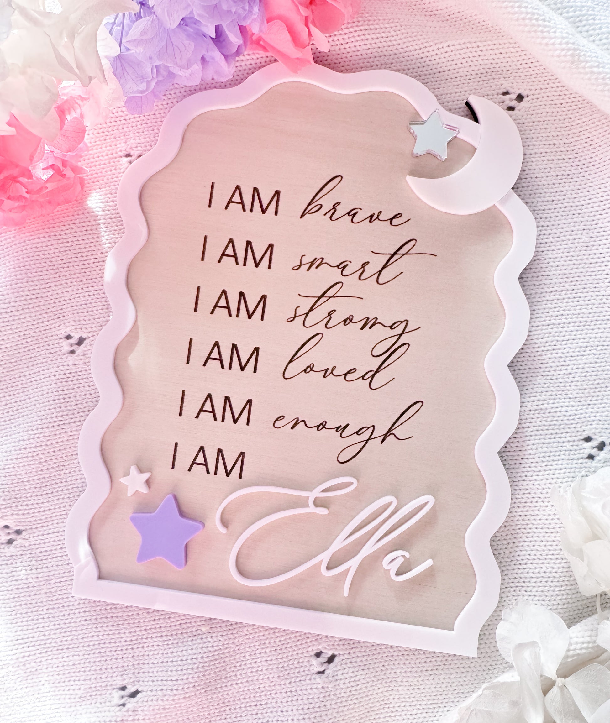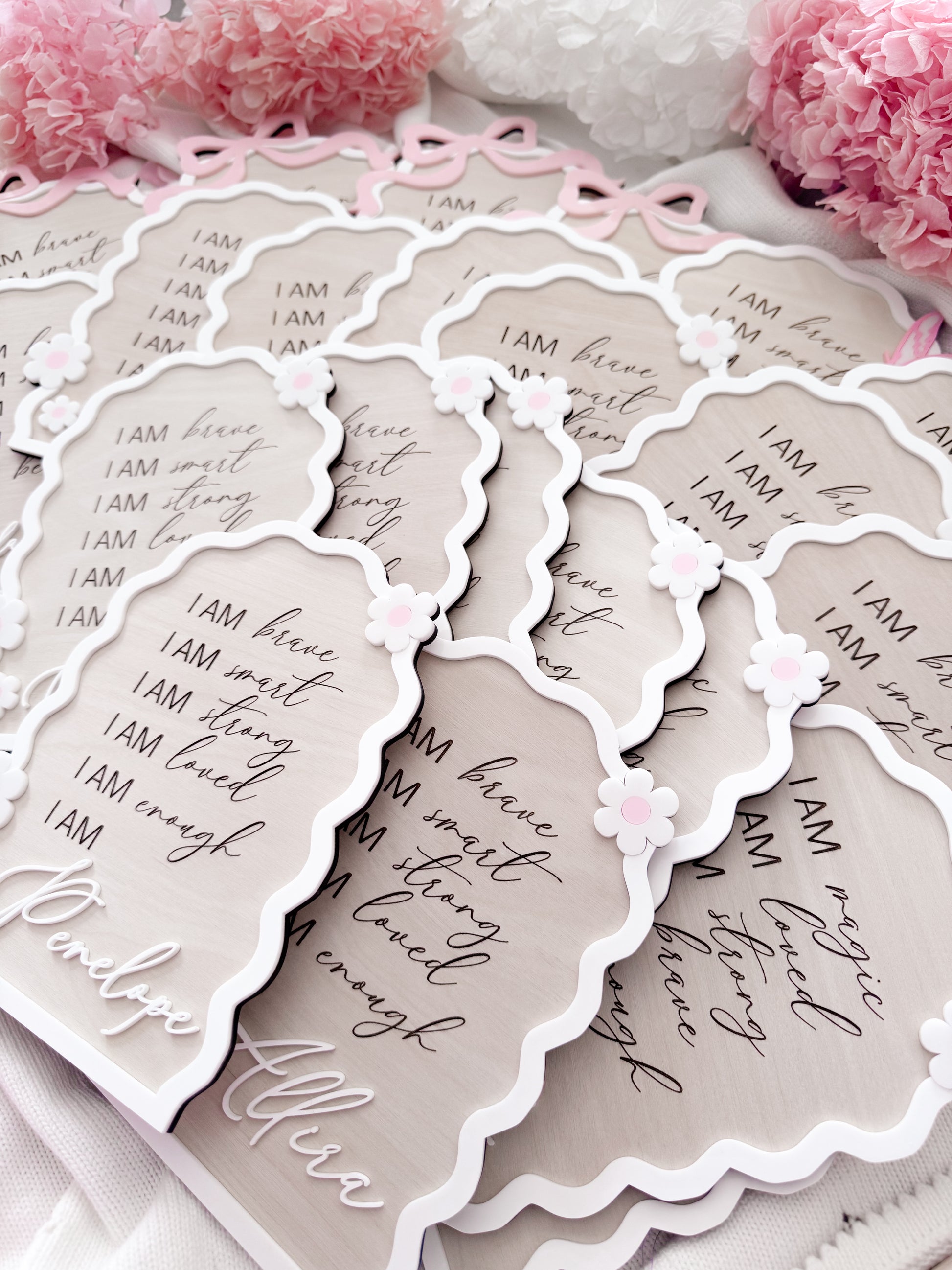 Made on our birch wood with a white acrylic border, engraved wording however the name will be in white acrylic!