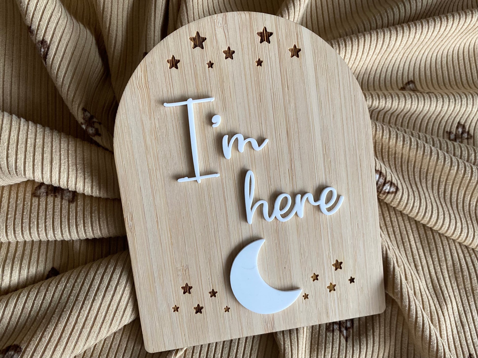 I’m here! Announce the special arrival of your little one with this arch shaped birth announcement. Made on bamboo and 14cm in height, you can also find a matching milestone set for this announcement!