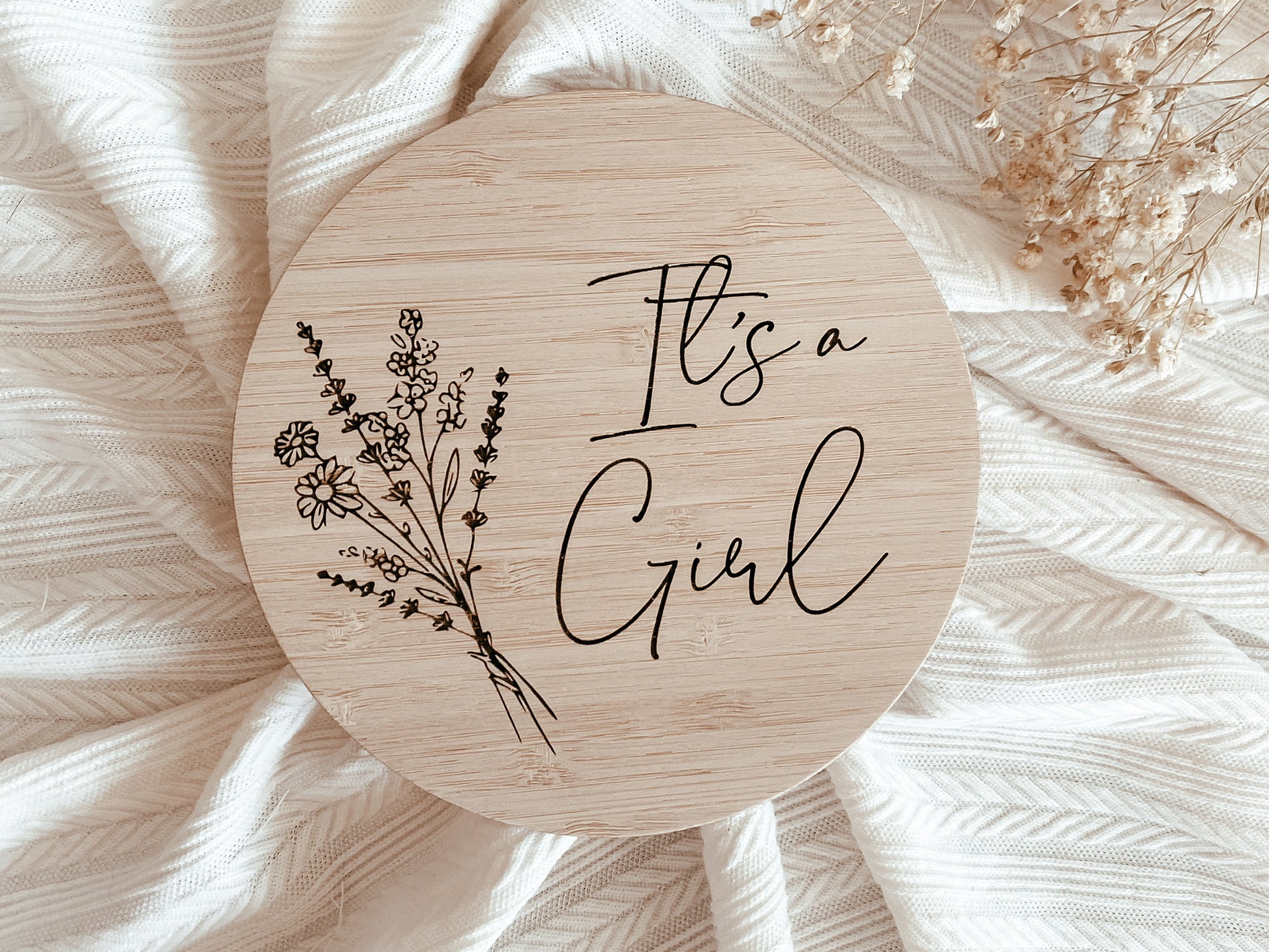 A perfect sign for a sweet announcement! Made on bamboo and 15cm with all wording and floral pattern engraved this is a perfect photo prop for your photos!