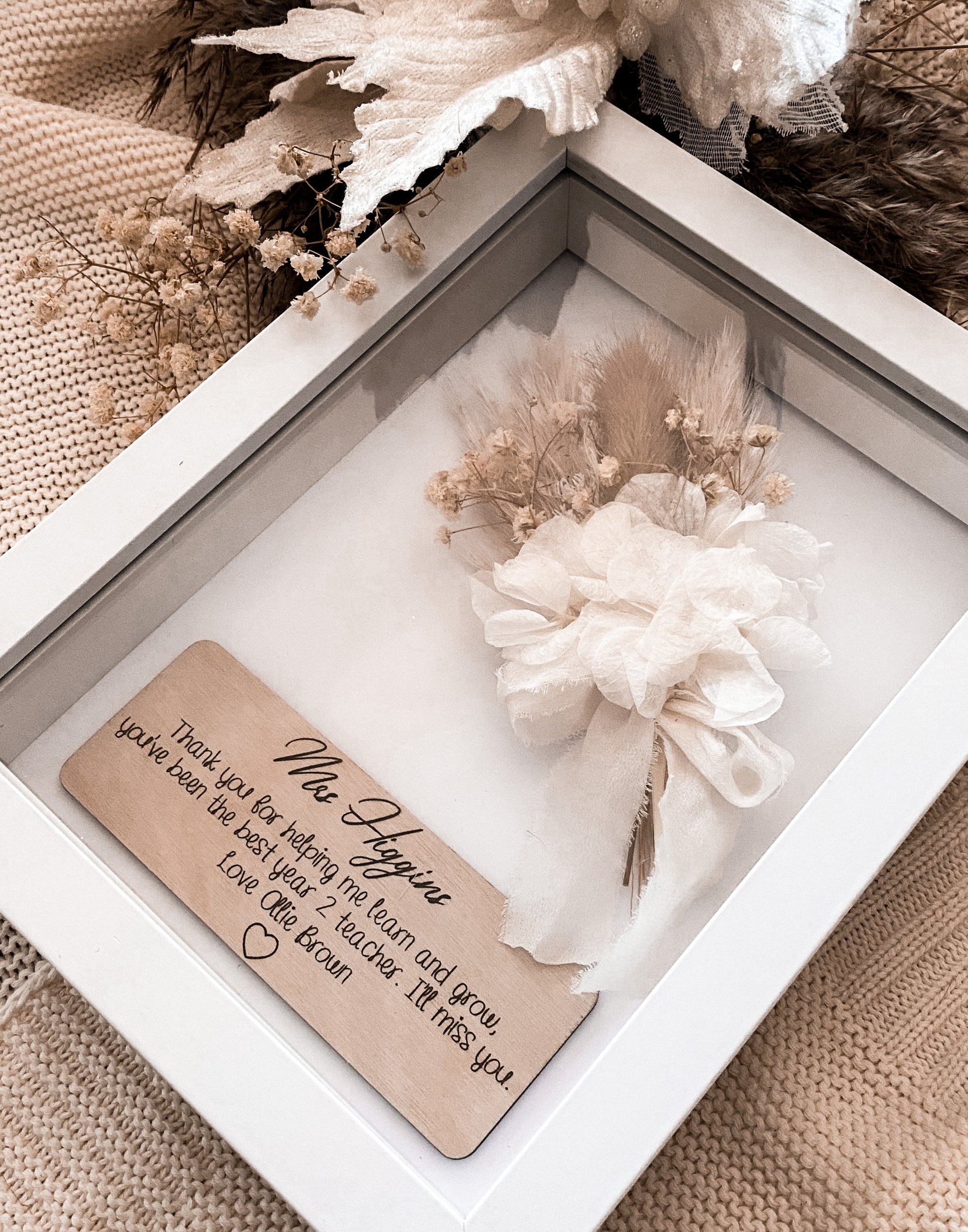 with a dried floral bunch and a wooden plaque with your custom wording on it!