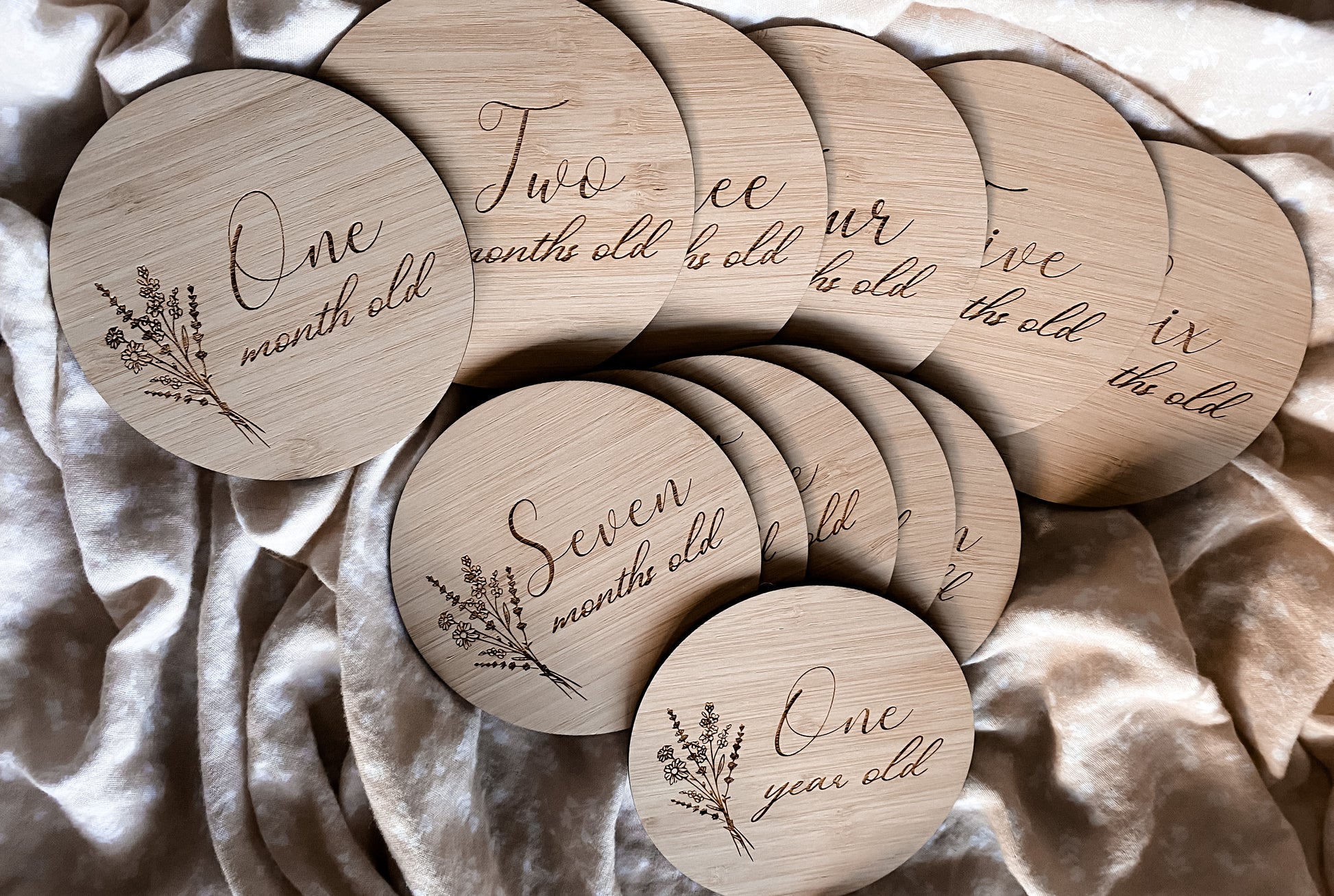 This pretty design comes on birch wood or bamboo, and in an arch shape or round disc!