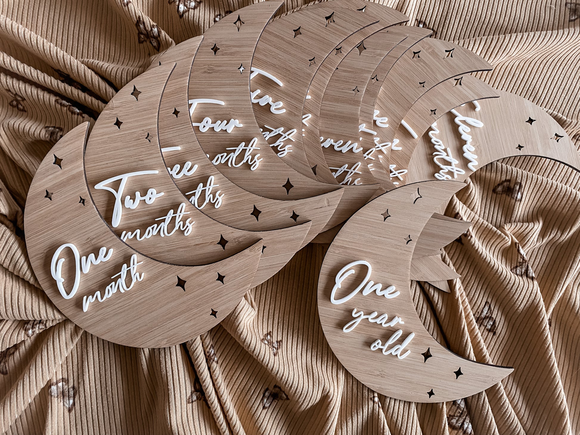One month to one year, made on bamboo wood with all acrylic wording, these monthly moons are a perfect photo prop for your little ones monthly photos!