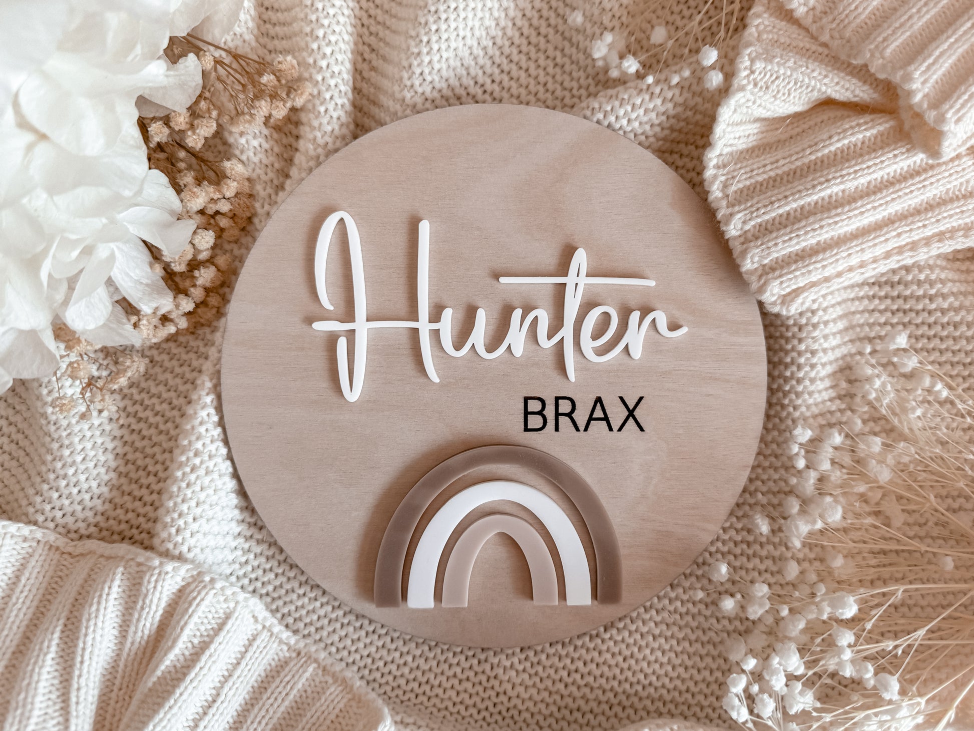 This sweet birth announcement plaque is made on birch wood, with a mixture of white acrylic first name and any other names engraved in capital plain font underneath with a beautiful neutral rainbow in acrylic to make it into the piece it is!