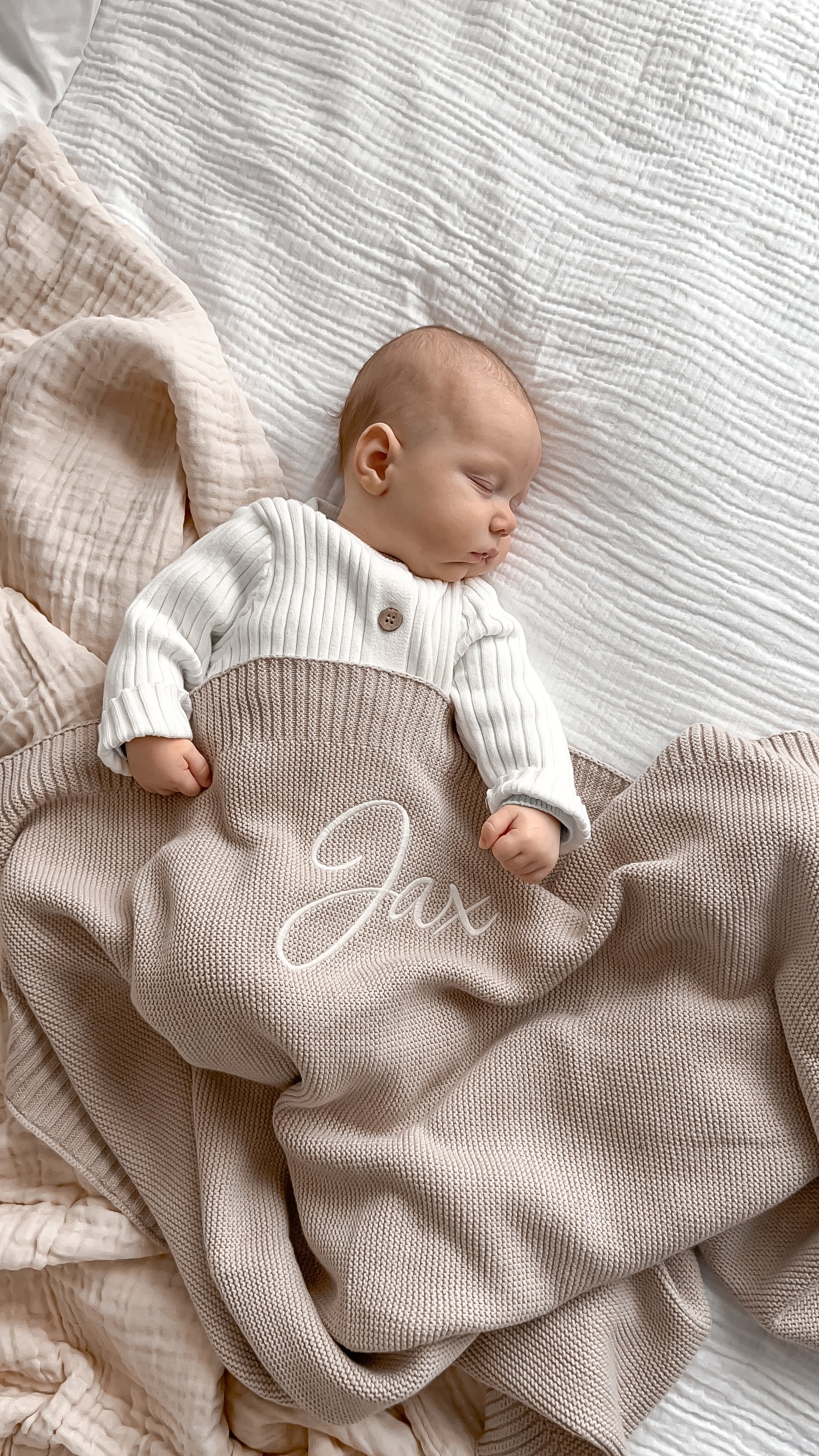 A gorgeous new version of our blankets now come personalised! Or stone coloured blanket is the perfect keepsake!