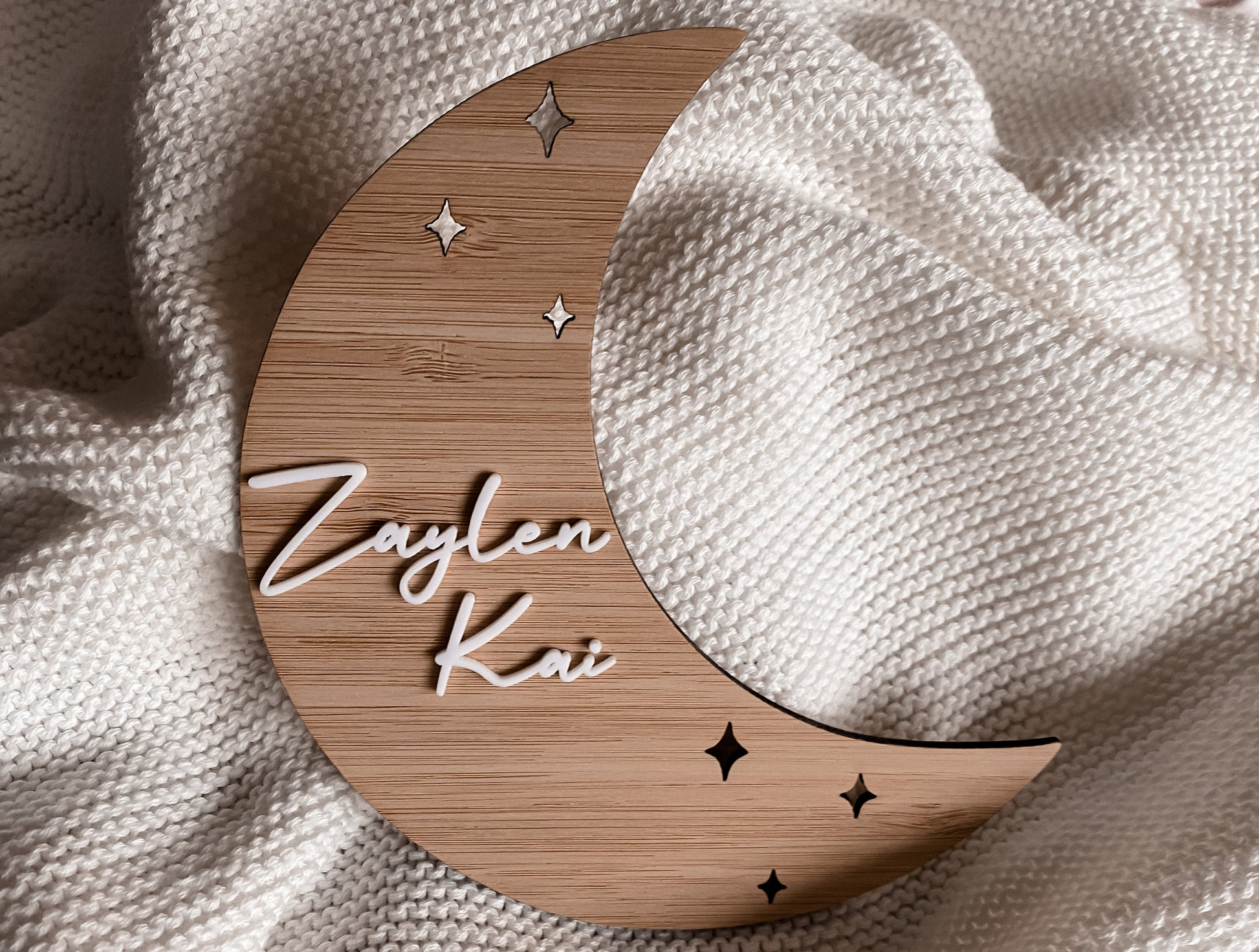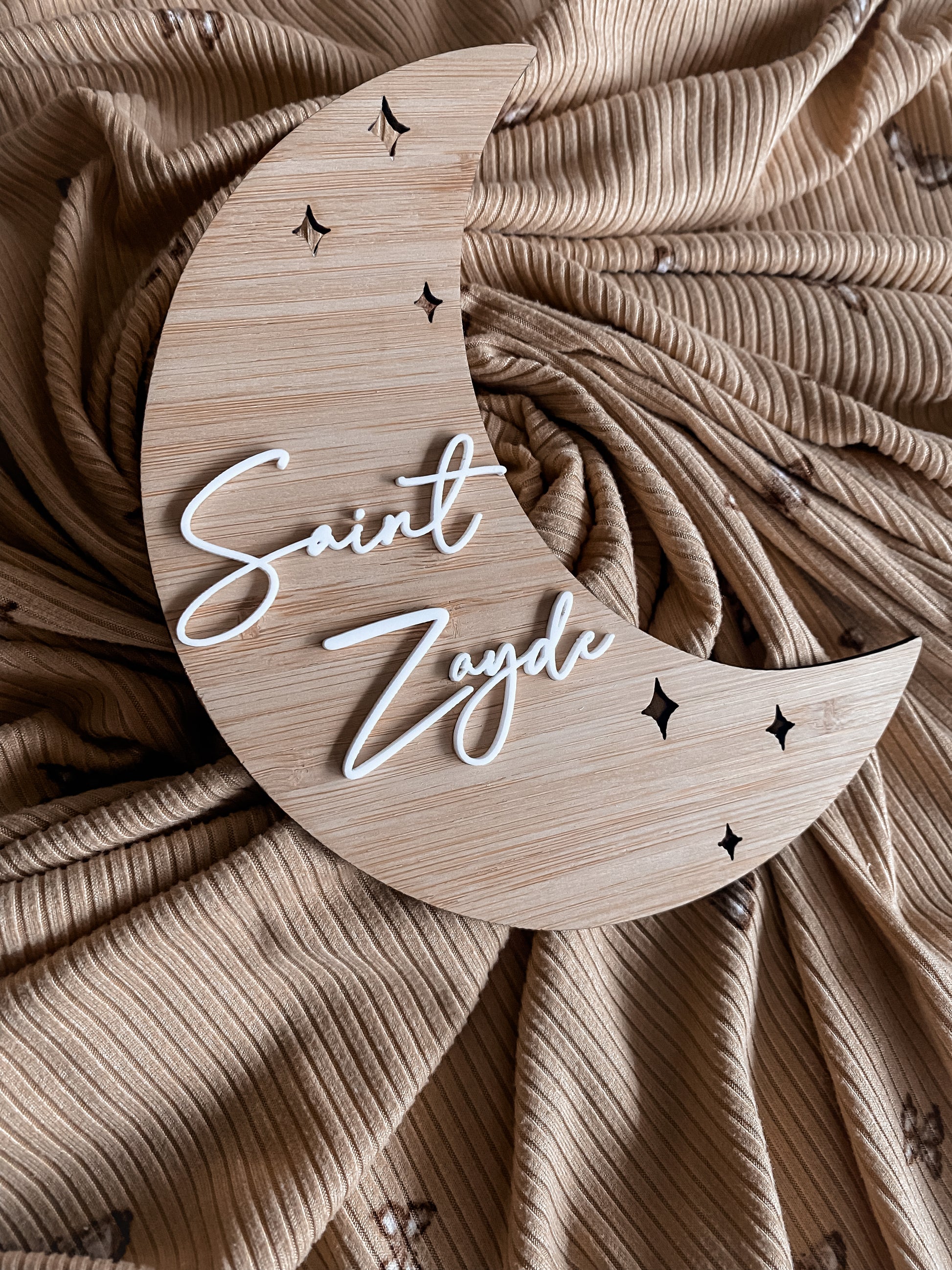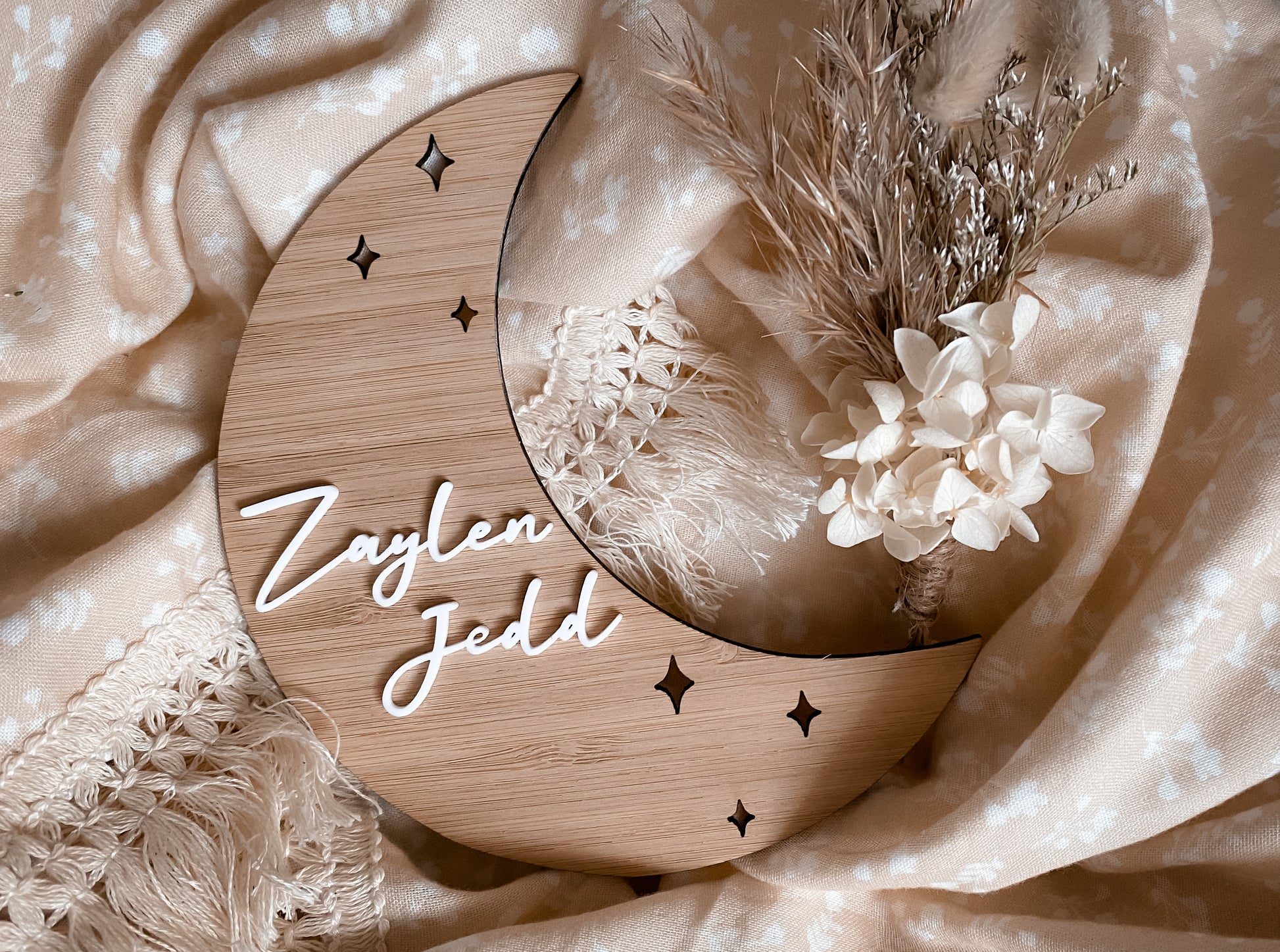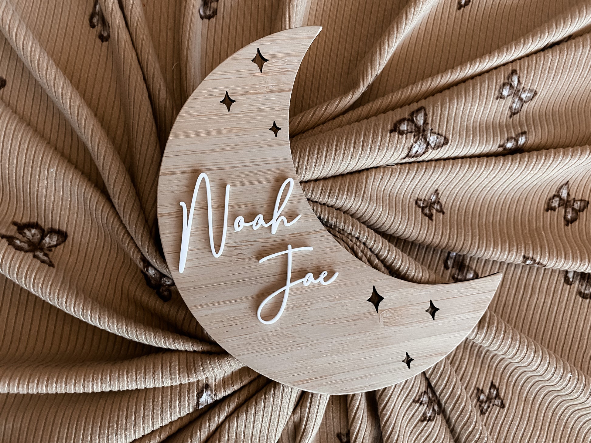 Made on bamboo, with white acrylic name/s pair this personalised birth announcement with our matching monthly milestones range!