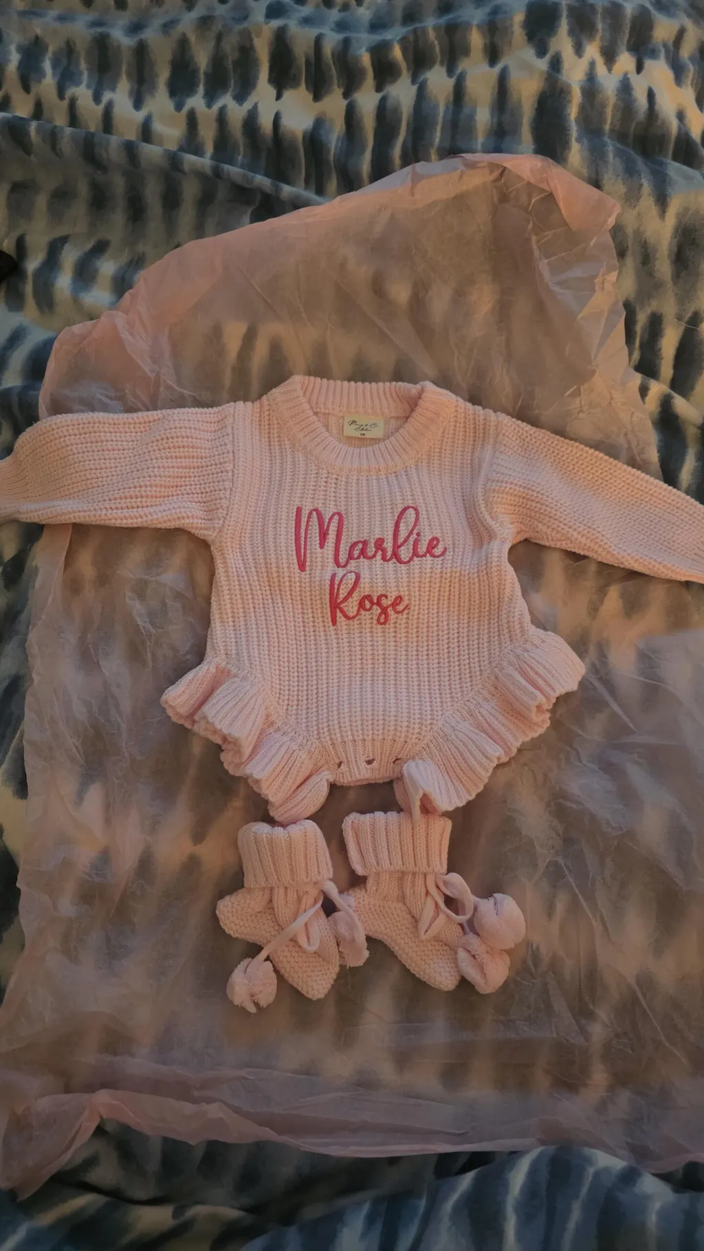 shoulder to crotch length is 32cm The font used for this is the "Elora" font in dark/bright pink thread which we recommend on the pink knit as its more readable compared to a light pink/white. PLEASE note all images look different on screens and phones, however all our blue pieces match but the thread we use to embroider isn’t the same as the ones made to use on our knit items so they’ll never be the exact same colour.