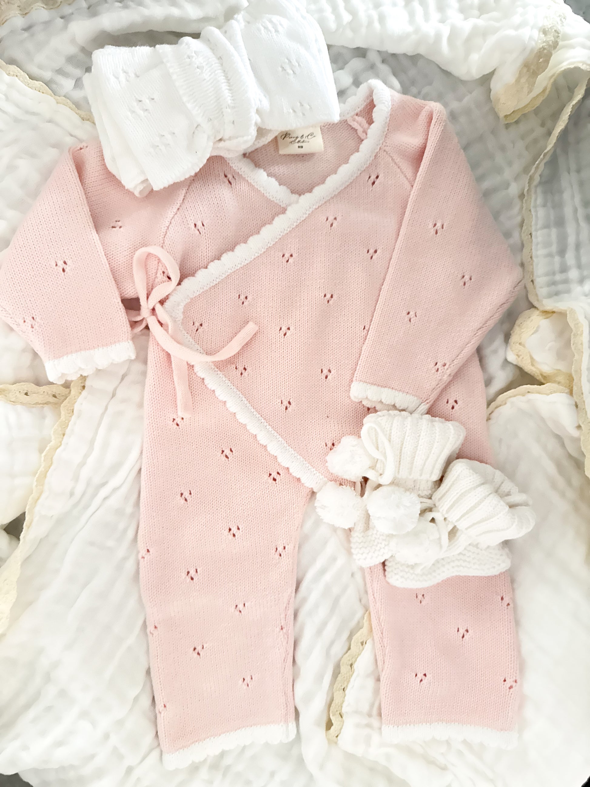 The sweetest newest edition to our site! One that pairs with the details of our ever so popular short frill leg version! Made on a softer pink than our chunky knit items - so please note the pointelle bow in pink is a different shade and brighter- this sweet romper can be personalised or left blank!