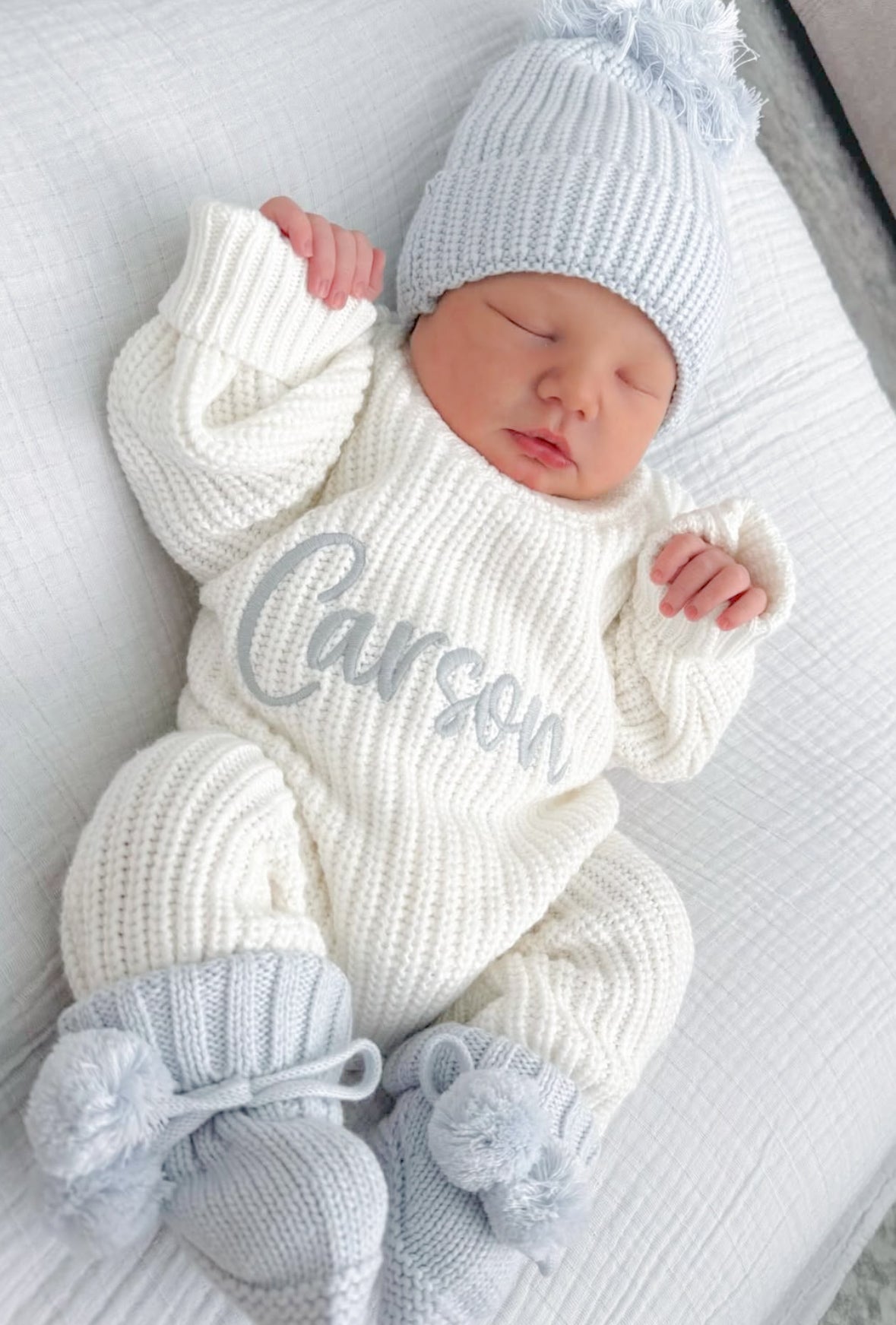 Made on beautiful 100% cotton our knit rompers are the highest quality with a chunky knit finish. This size is our newborn size perfect for announcement photos and their first outfit!