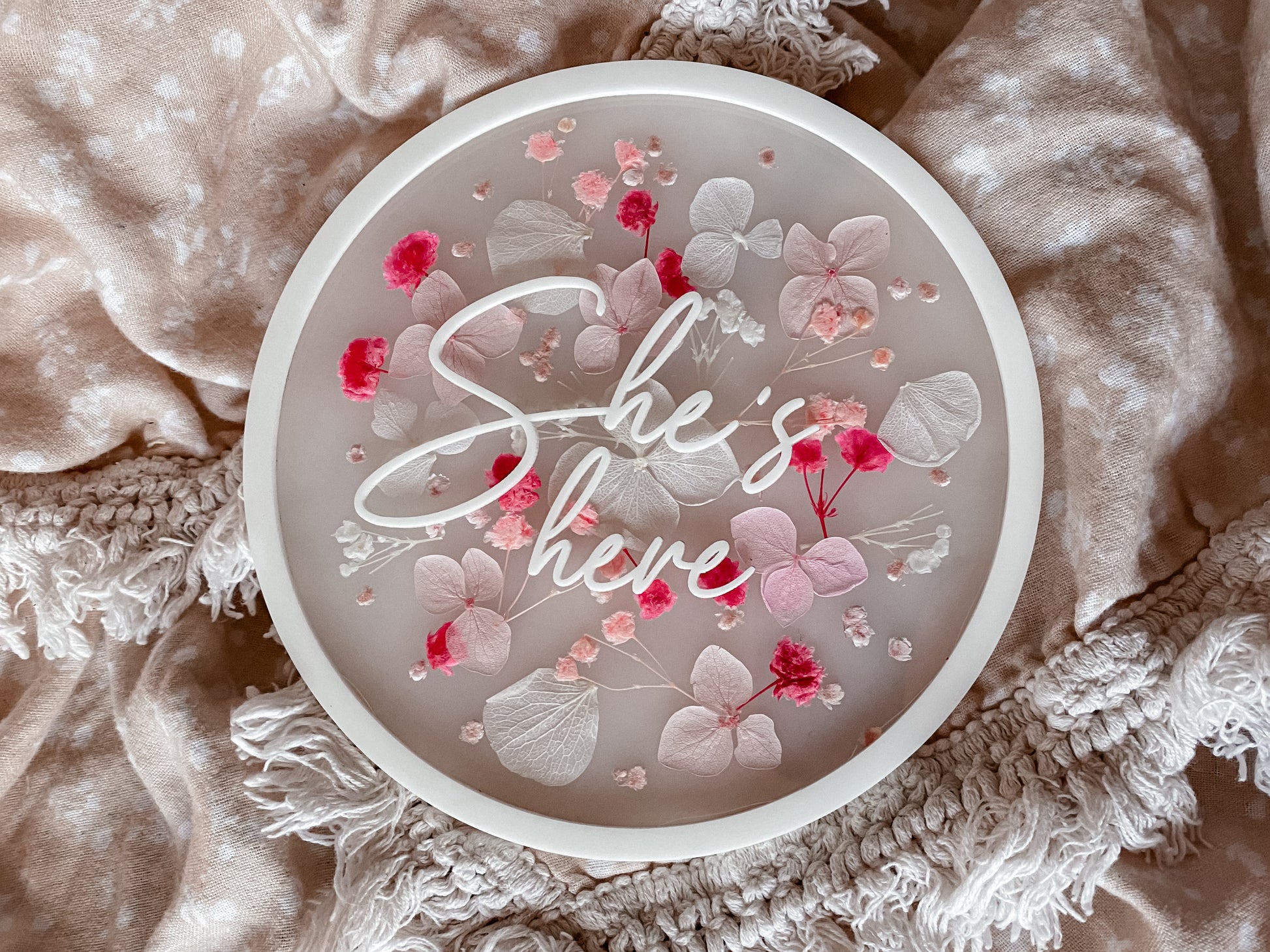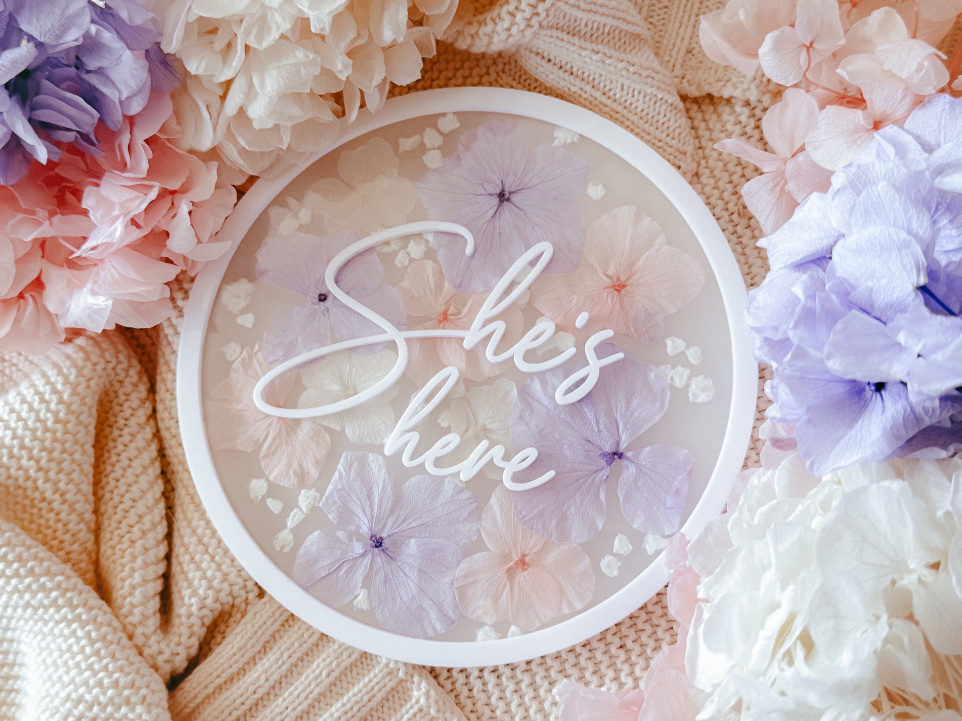 Made with layered acrylic, the back will be frosted and the front clear, with a white border around the edge, with babies name or phrase “she’s here” “hello world” etc in the middle!