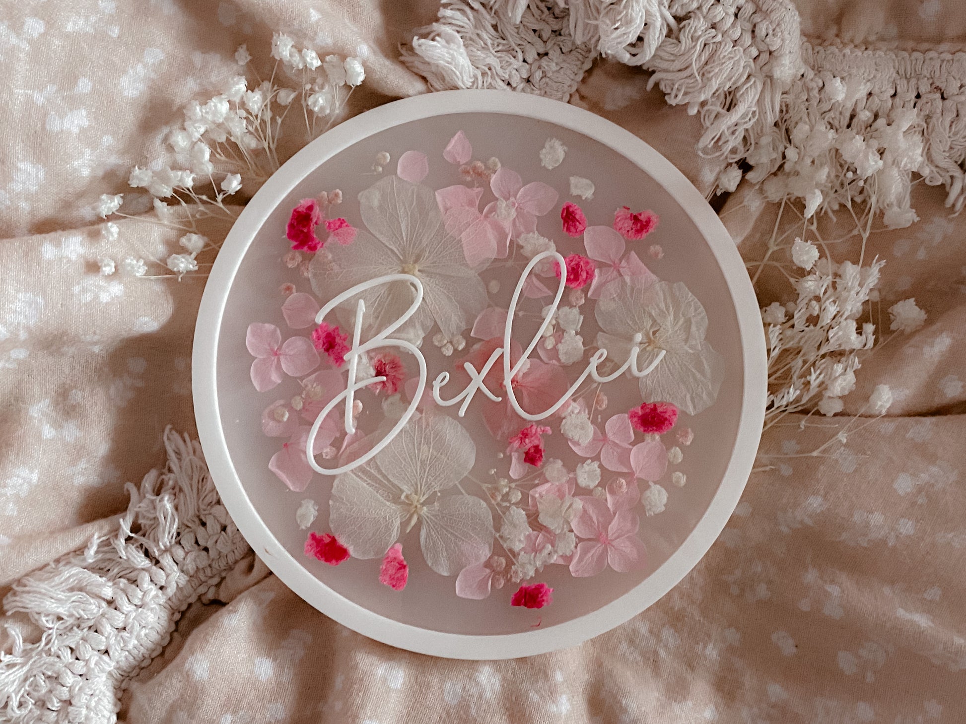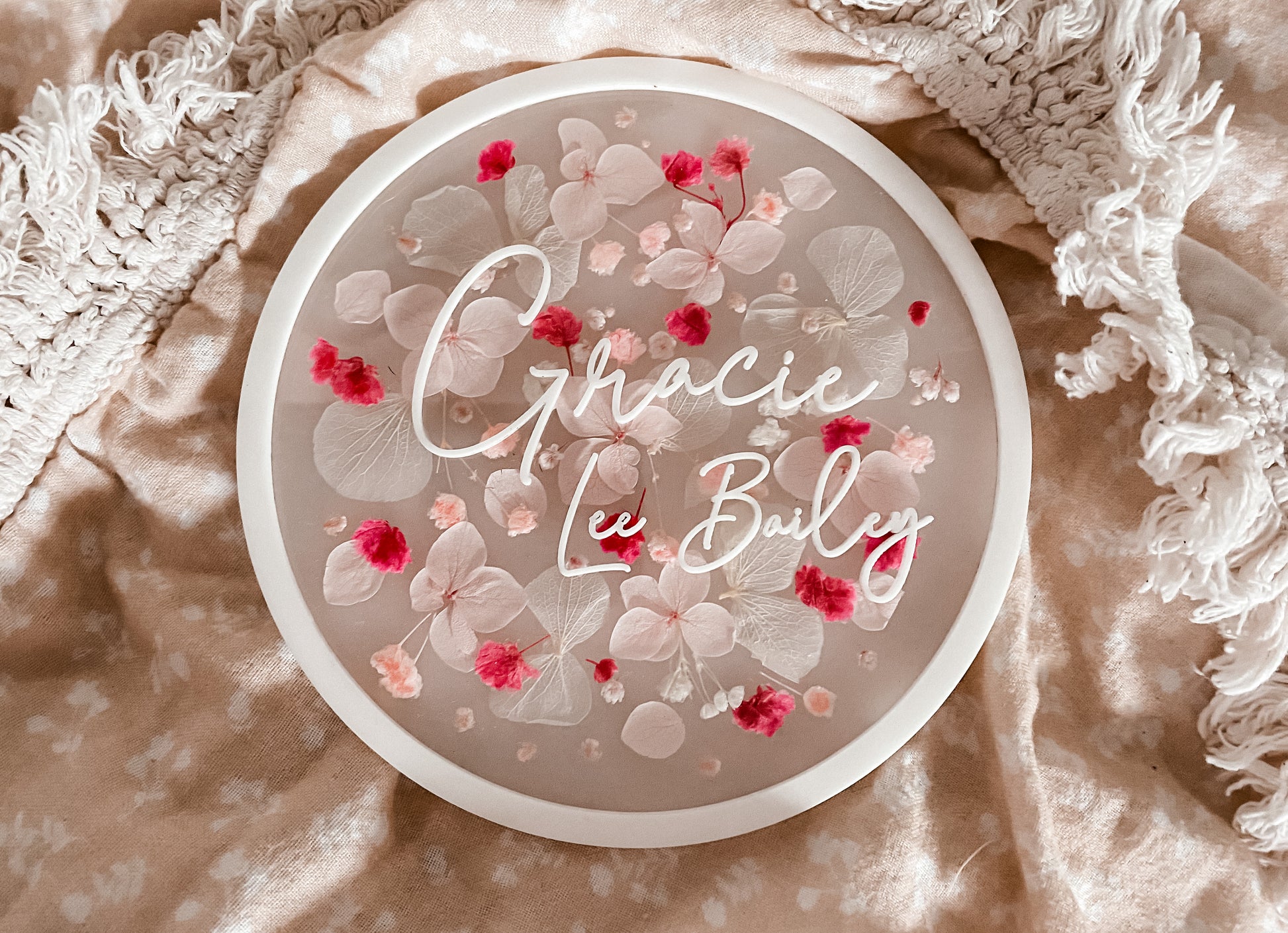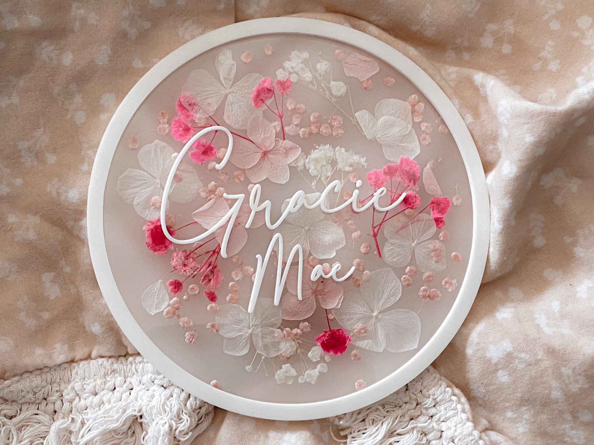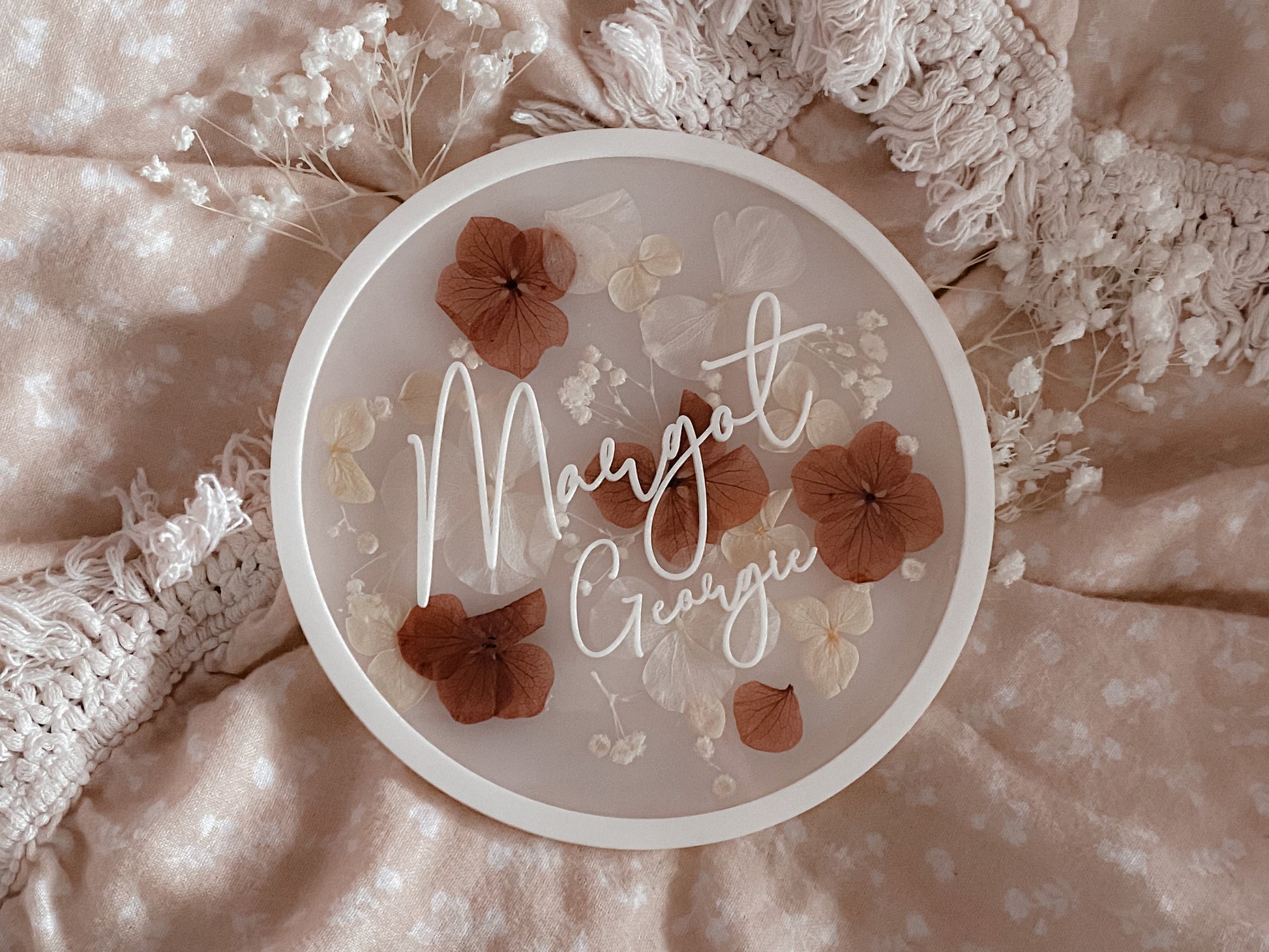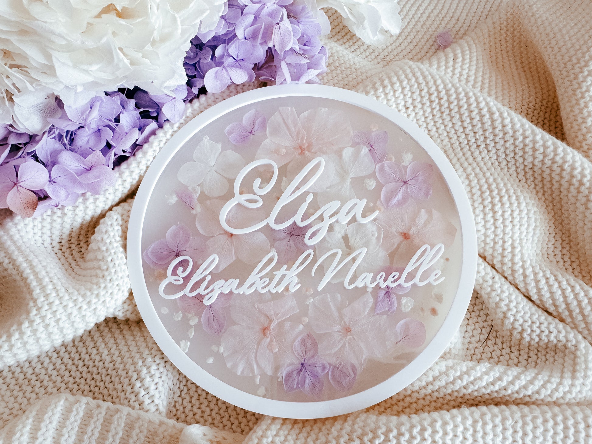 This stunning 15cm round pressed floral disc is a perfect keepsake and announcement prop!