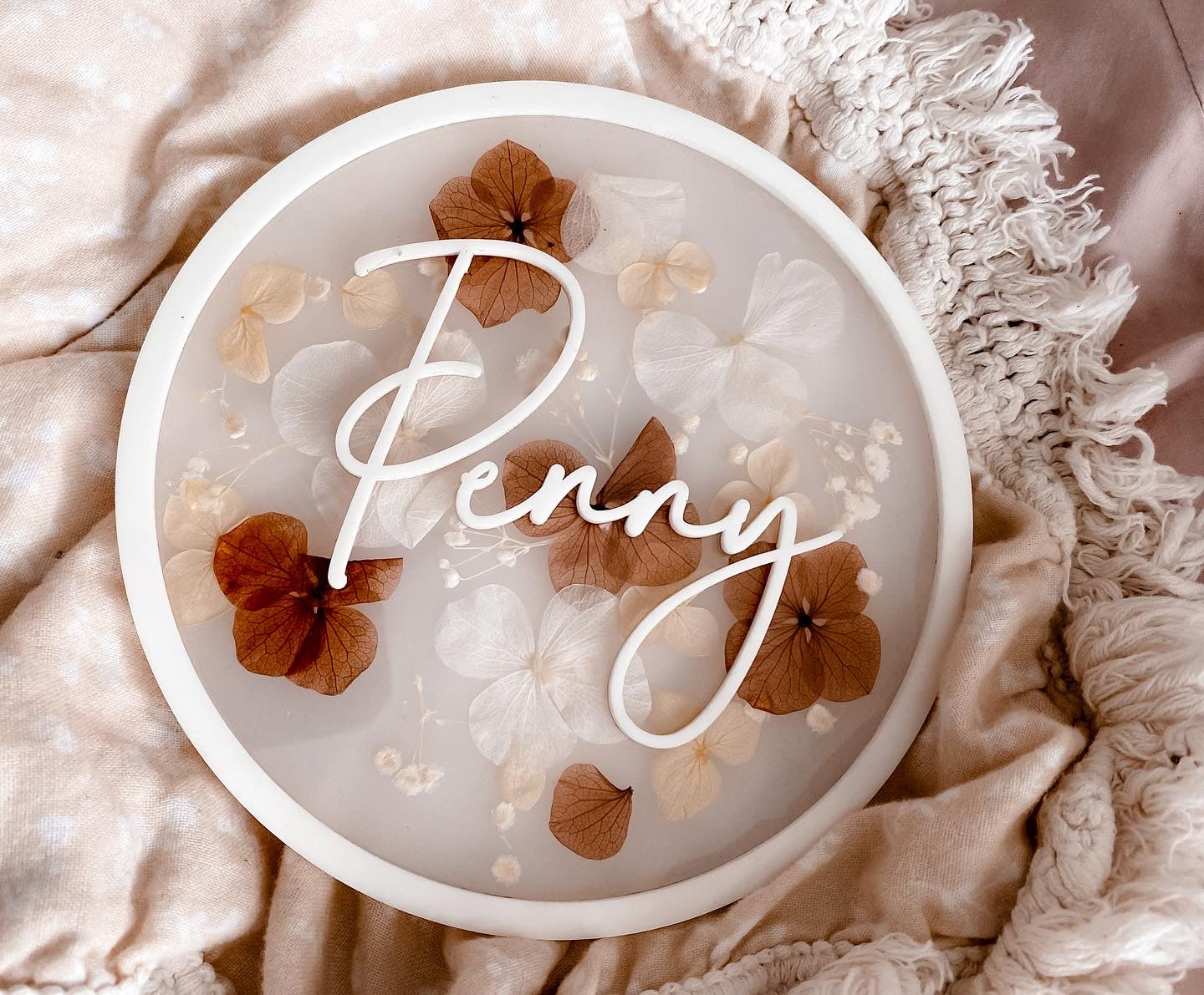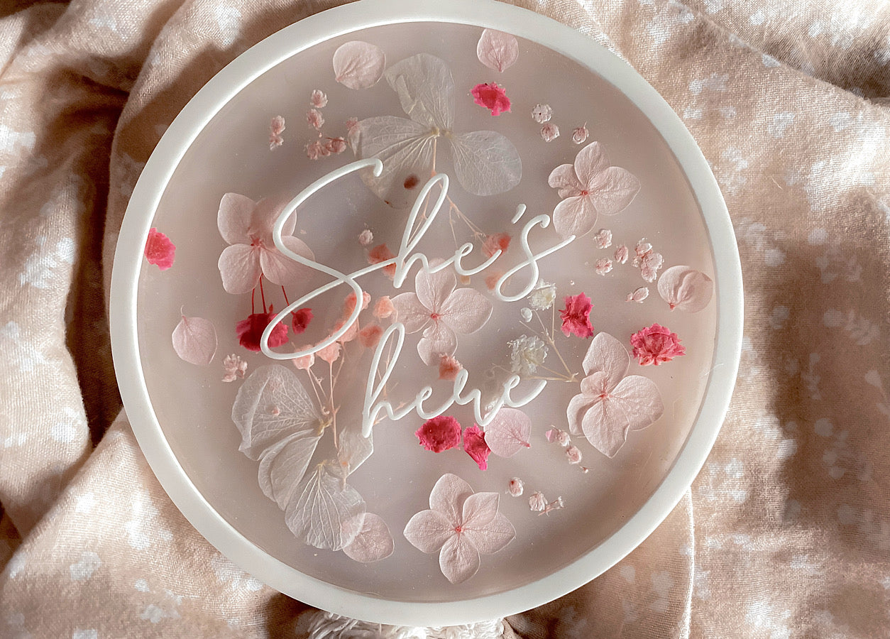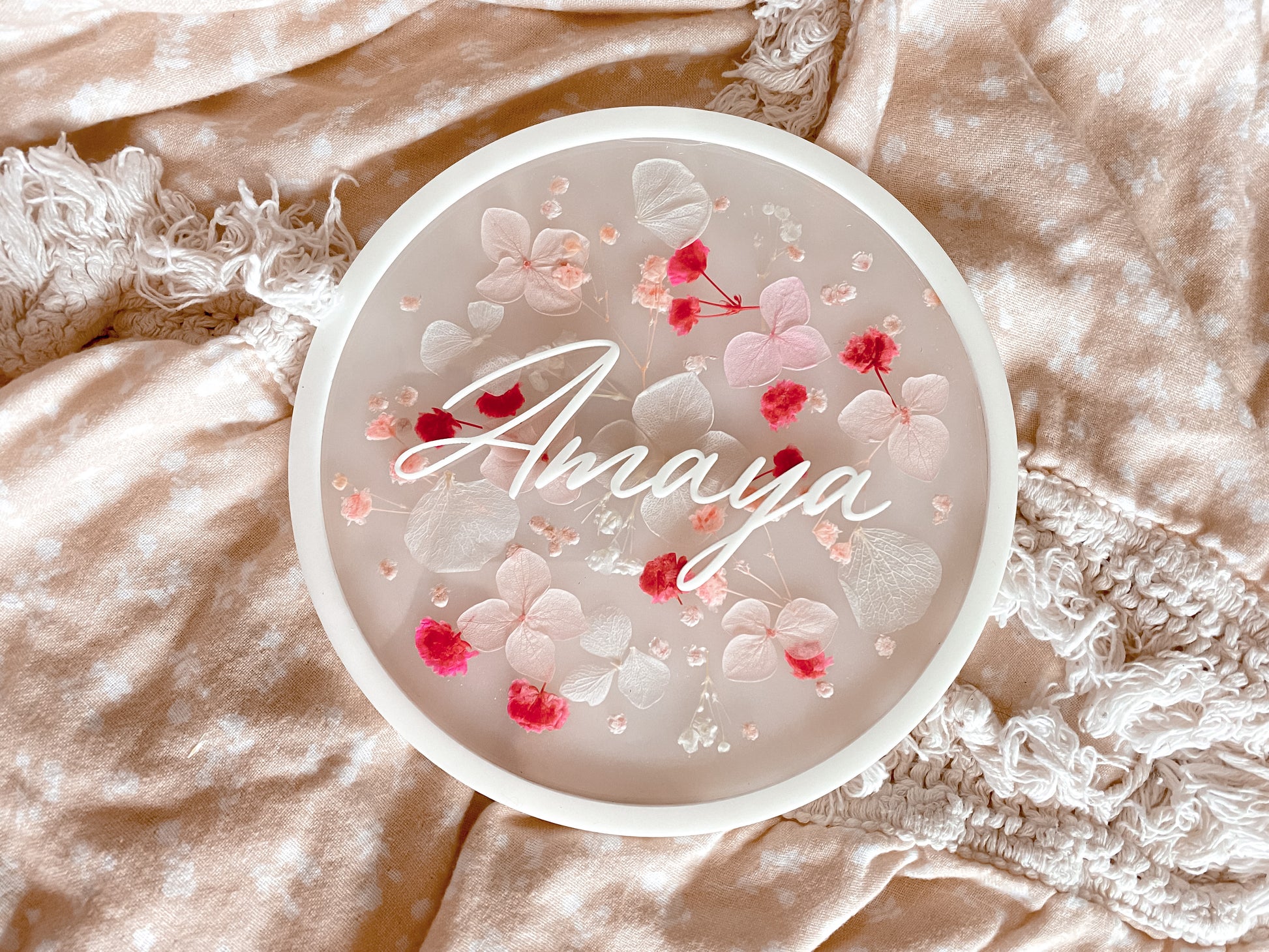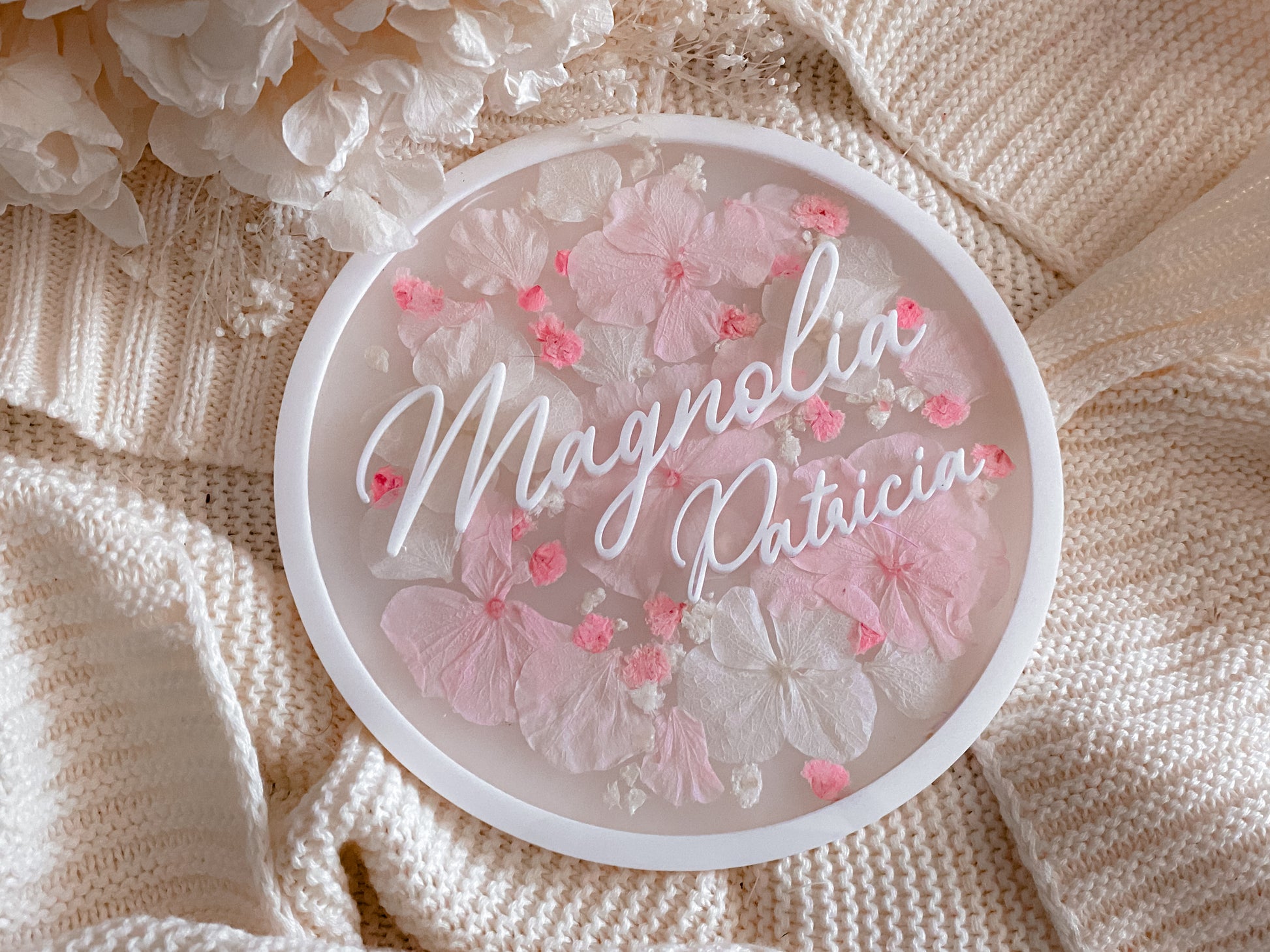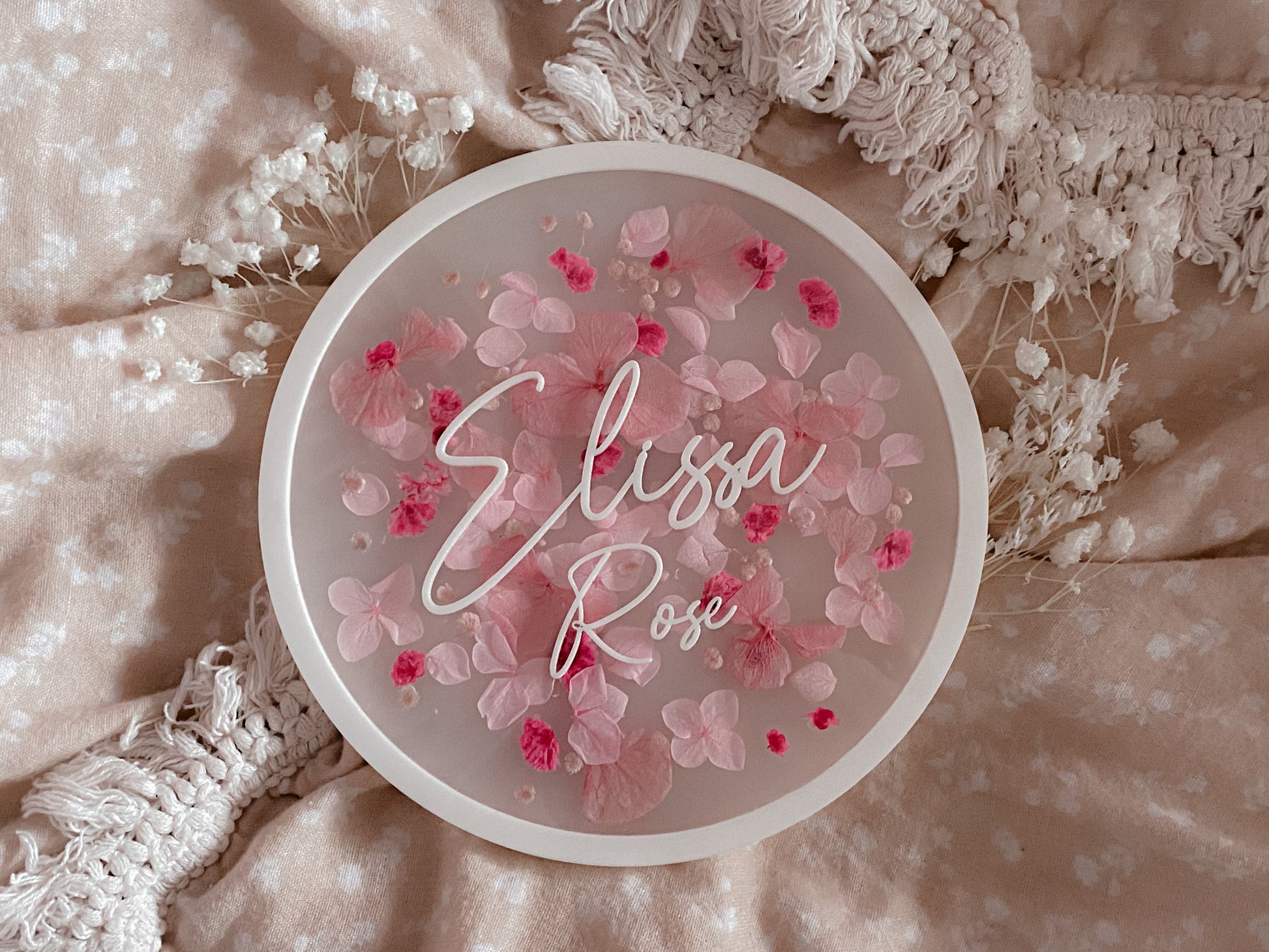 This stunning 15cm round pressed floral disc is a perfect keepsake and announcement prop!