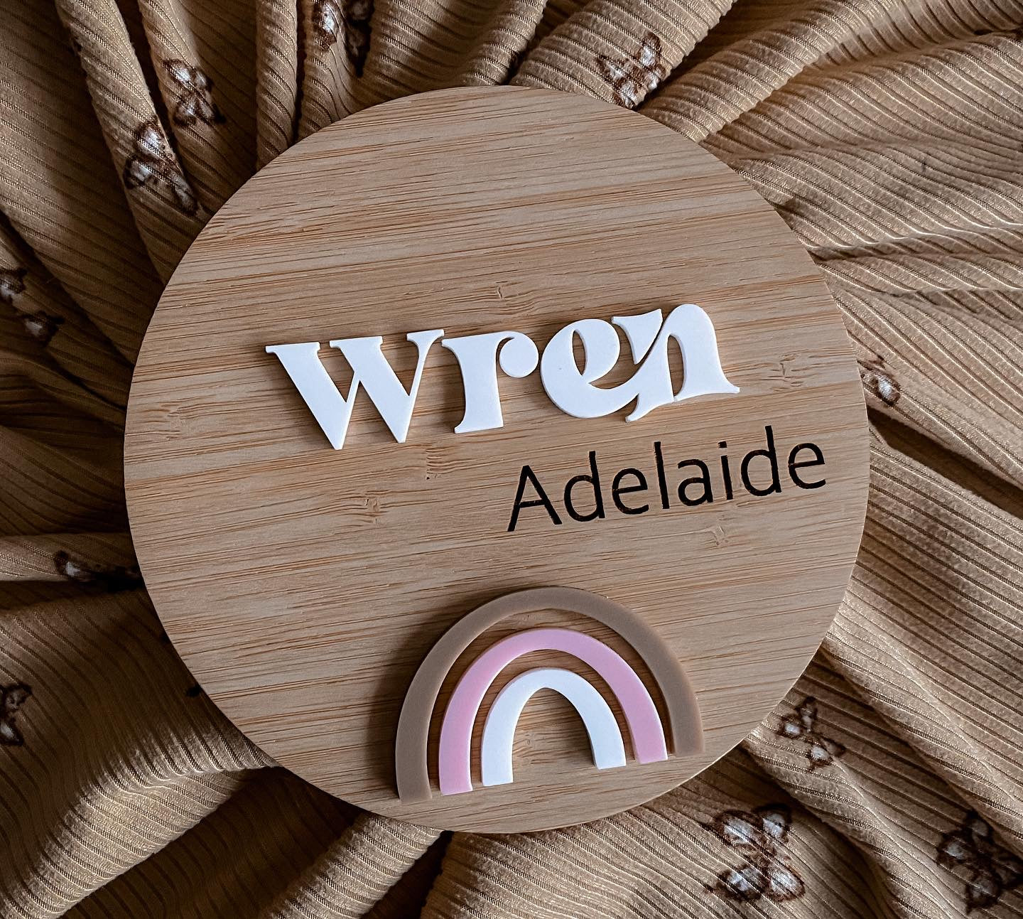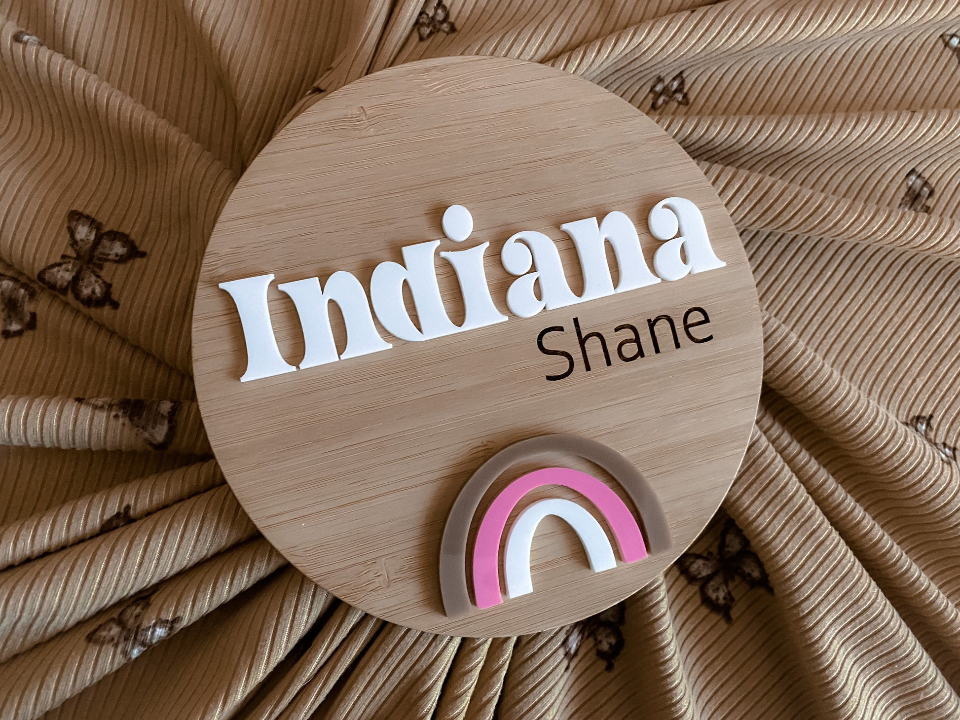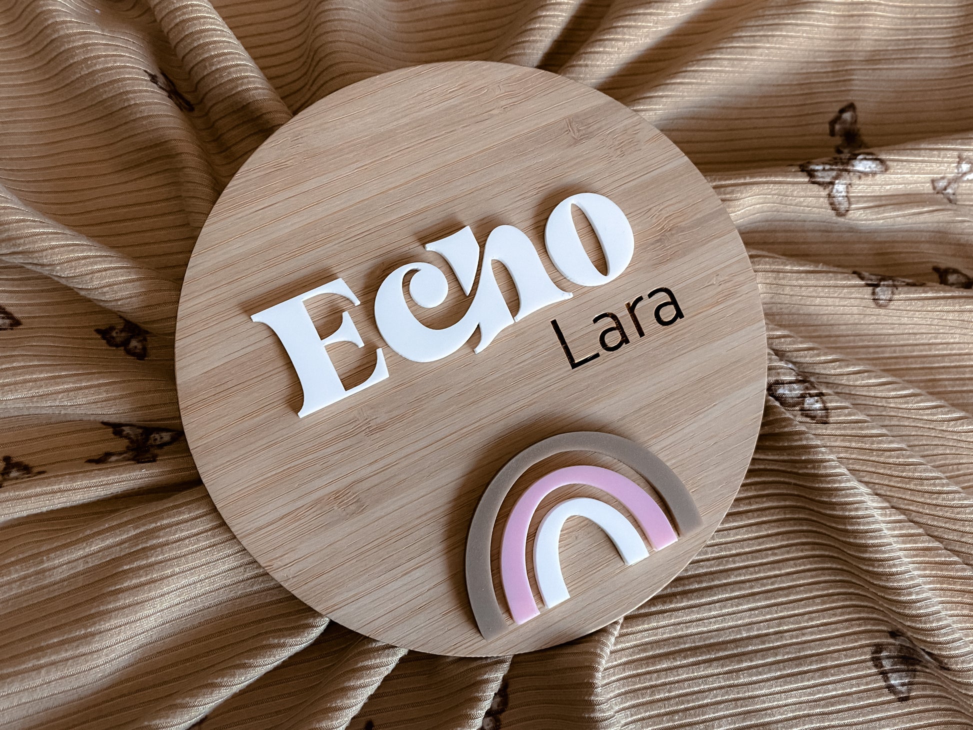 This rainbow has a neutral, baby pink and white arches, the disc is 15cm made on bamboo. First name will be in white acrylic second name engraved in the fonts pictured.