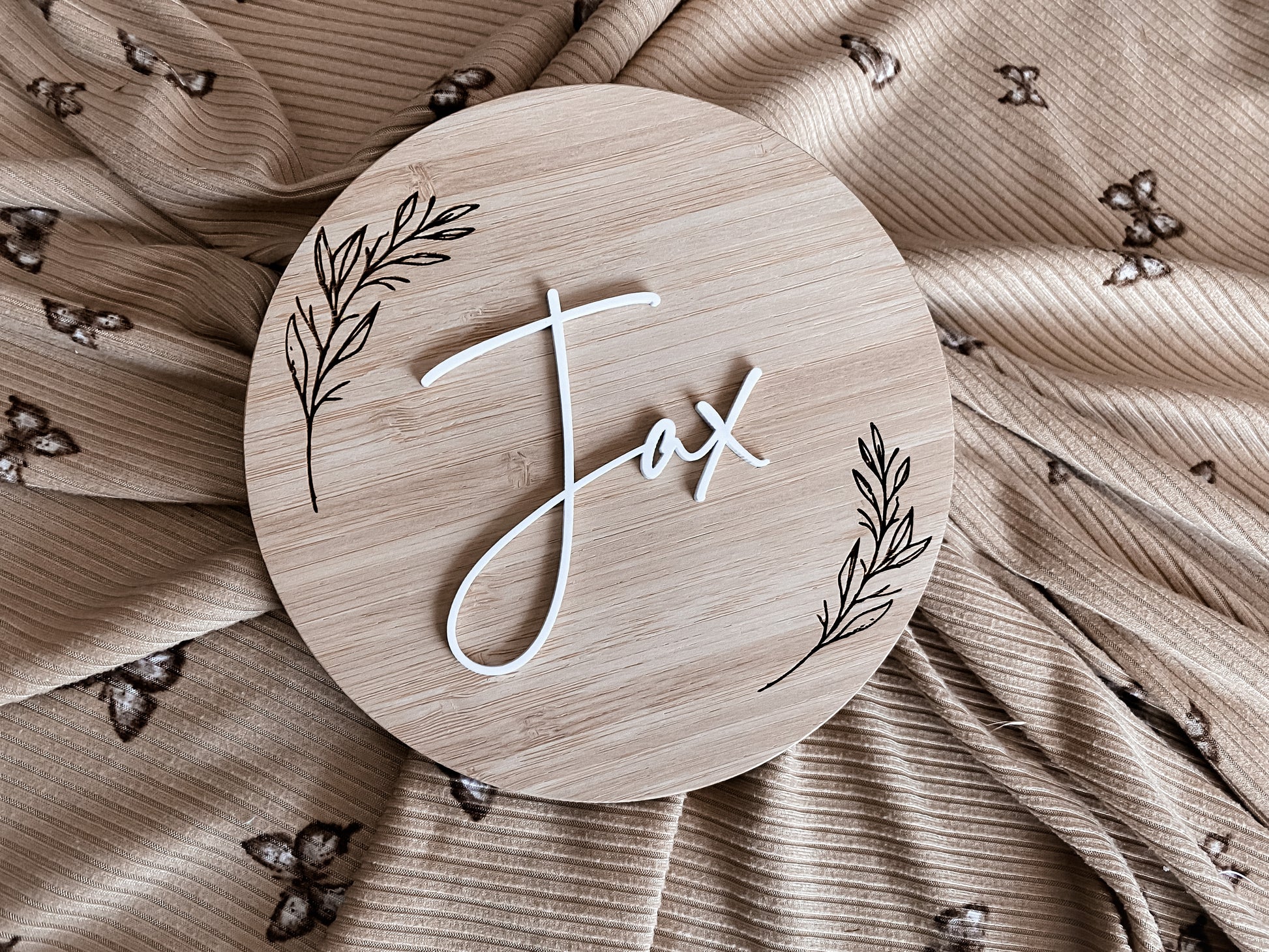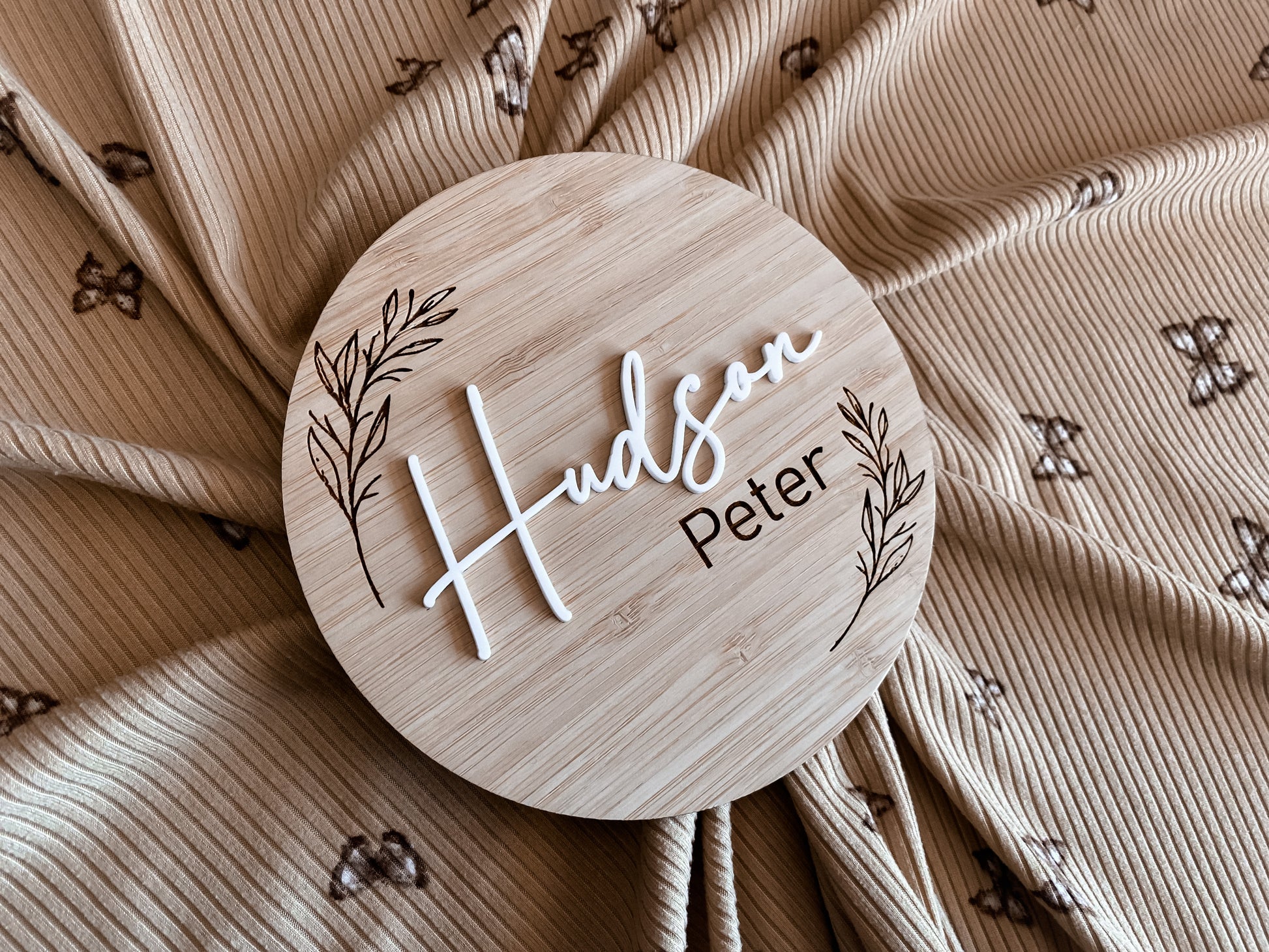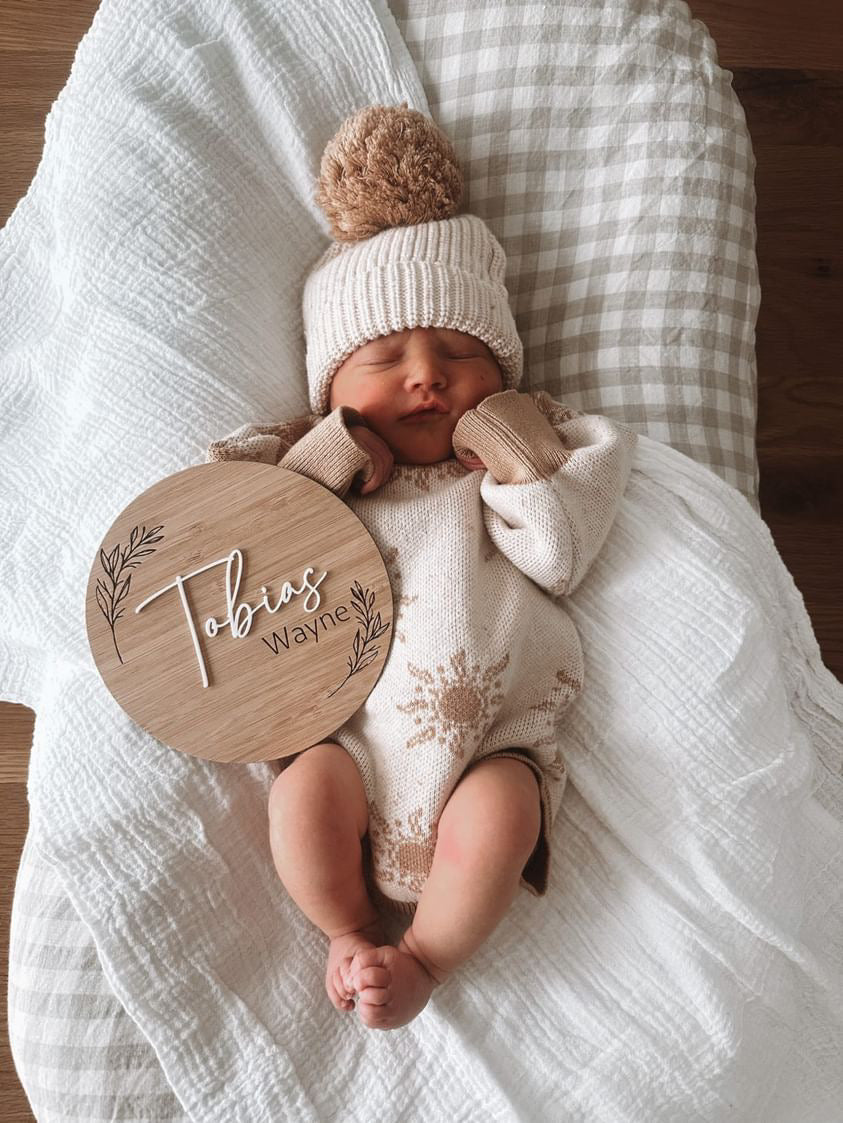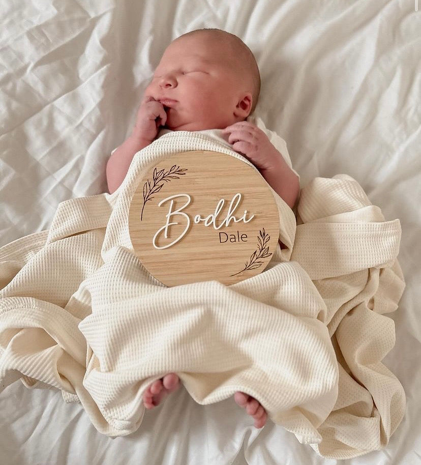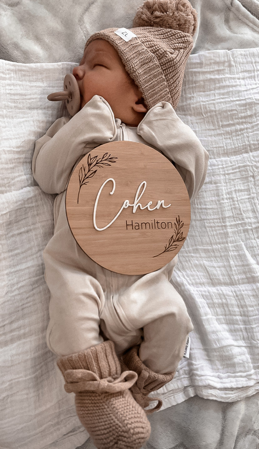 Round birth announcement leaf pattern