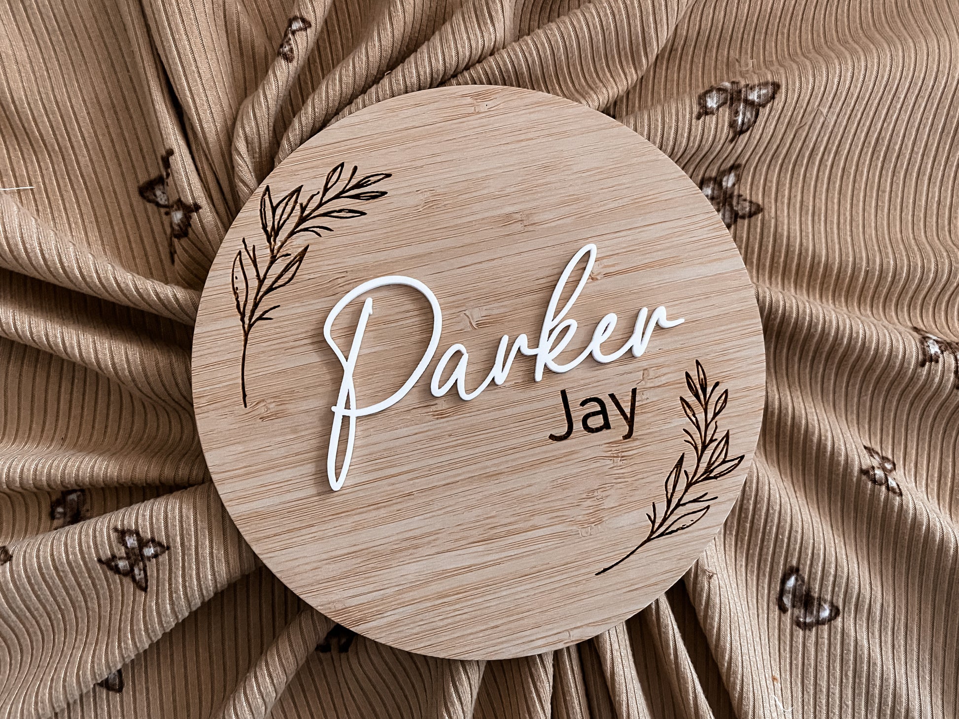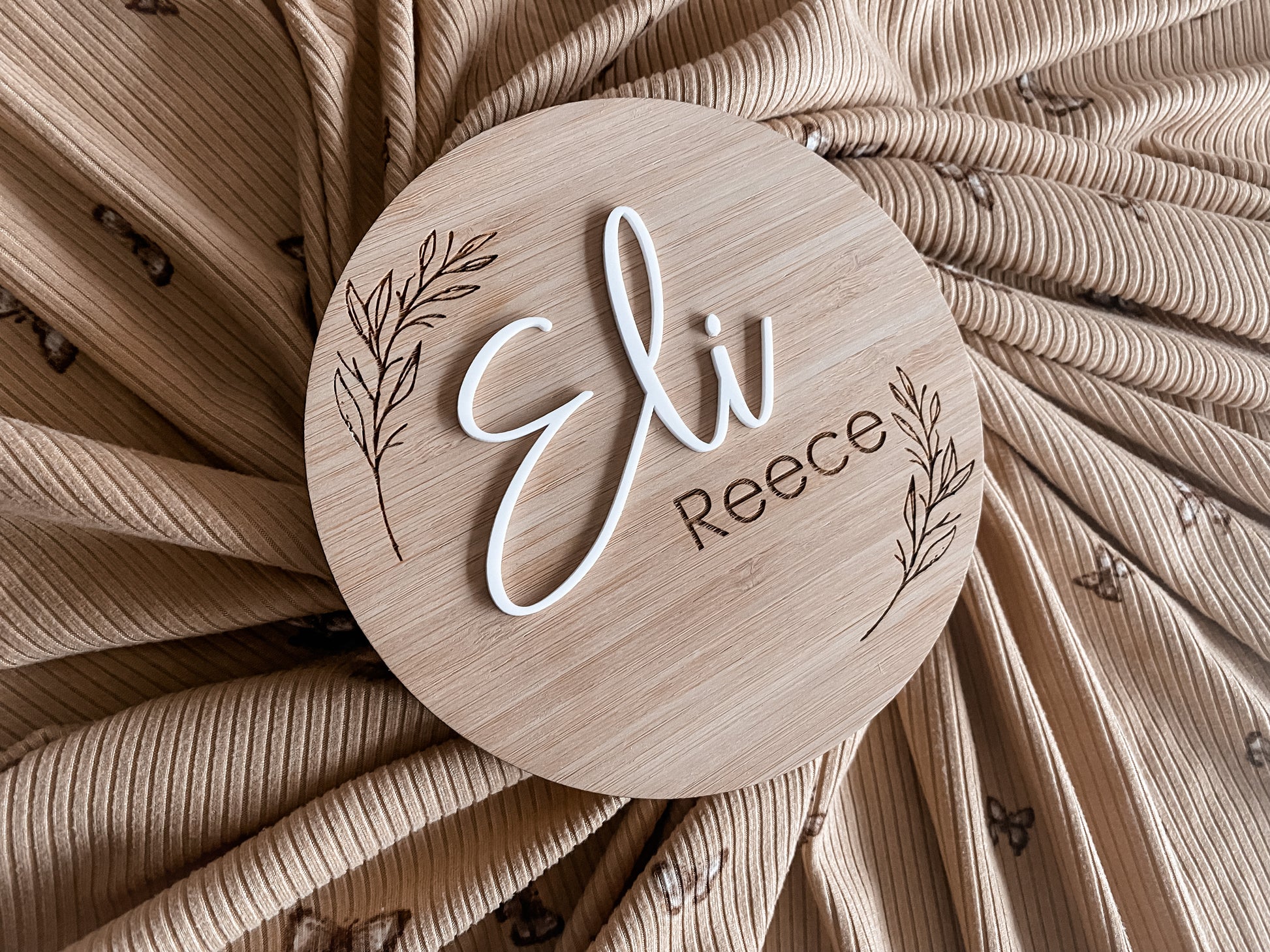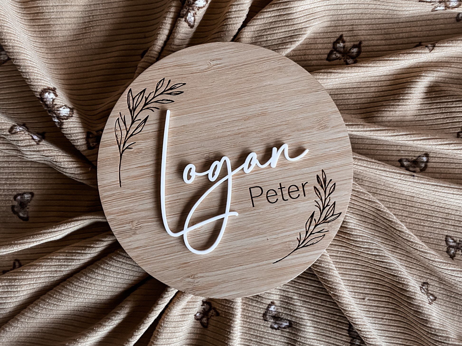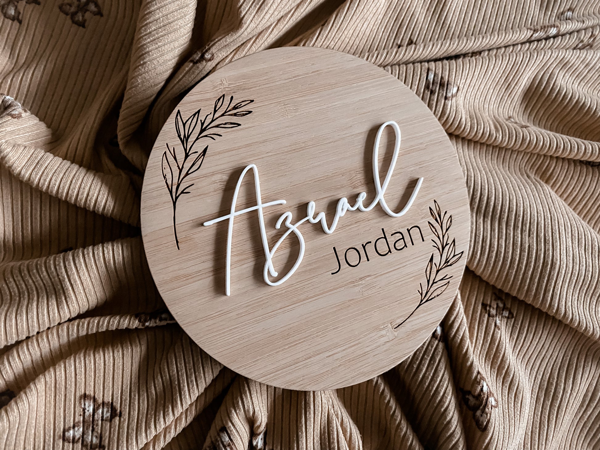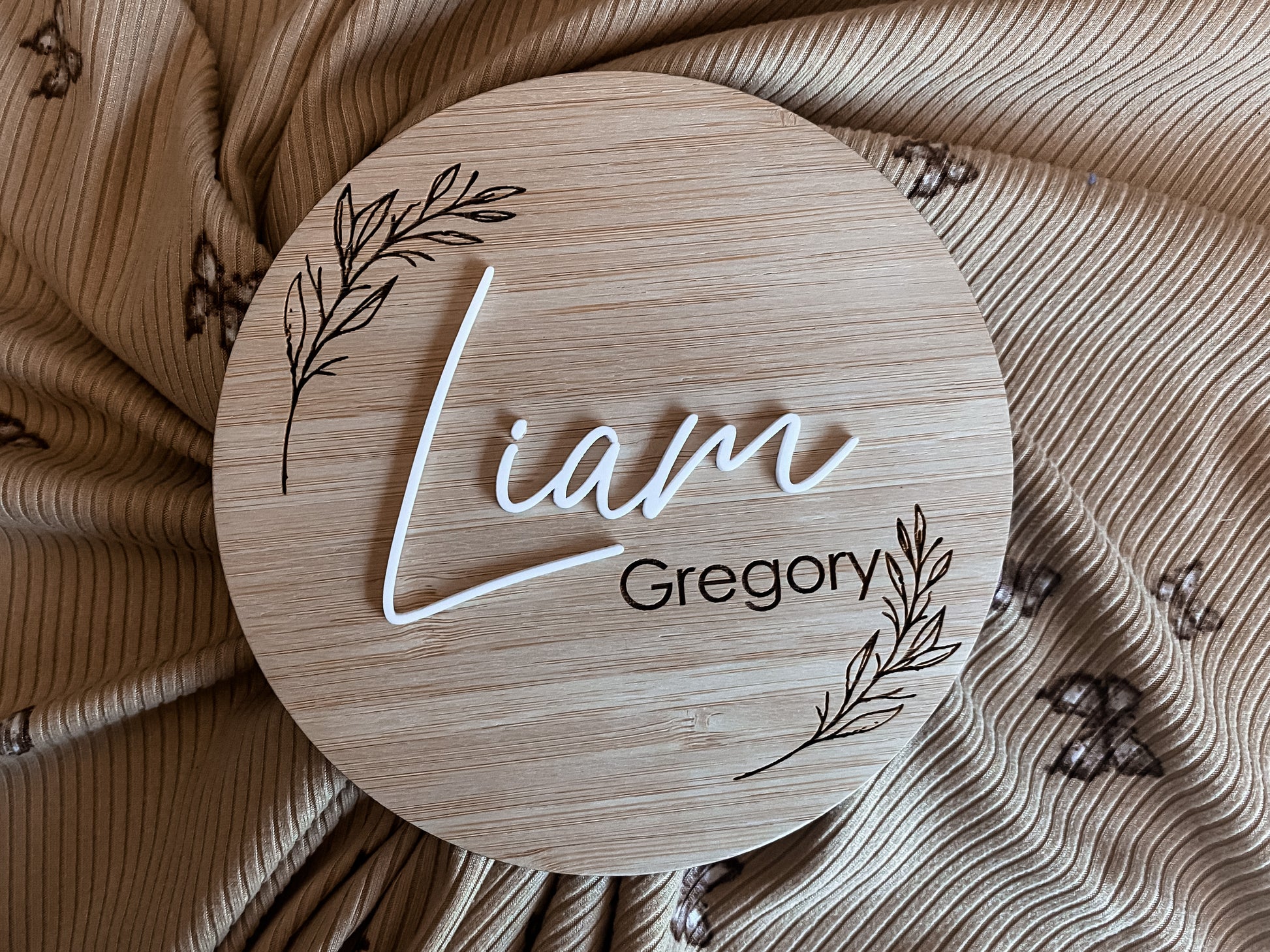Round birth announcement leaf pattern