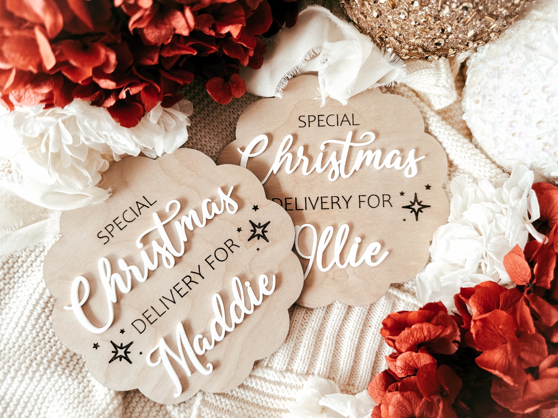 Made on birch wood these Christmas delivery tags go onto your children’s Santa sacks that lay under the tree! So easy to add them on!