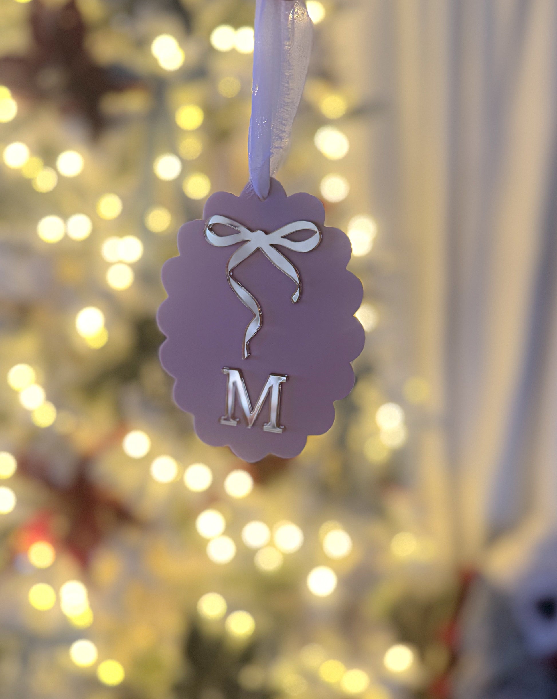 Made on acrylic with a lovely little bow and an initial underneath! Perfect for your Christmas tree!