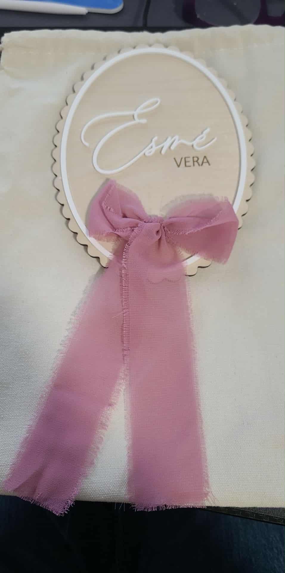This gorgeous name sign is a lovely piece with an acrylic border on birch wood, finished with a sweet ribbon - you can pick your colour- with crisp clean engraving for the names. First name will be in cursive and any others will be underneath in a plain capital font.