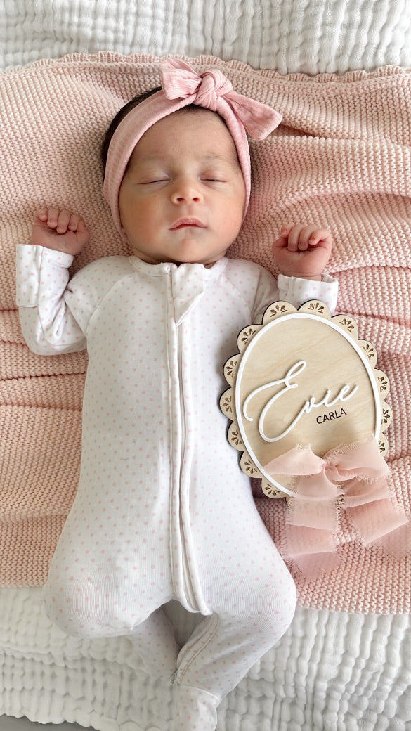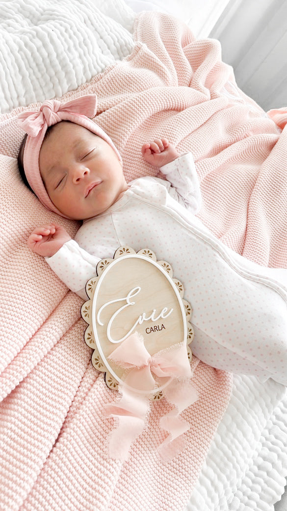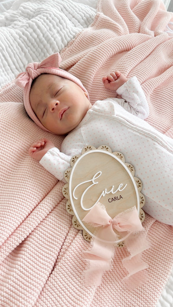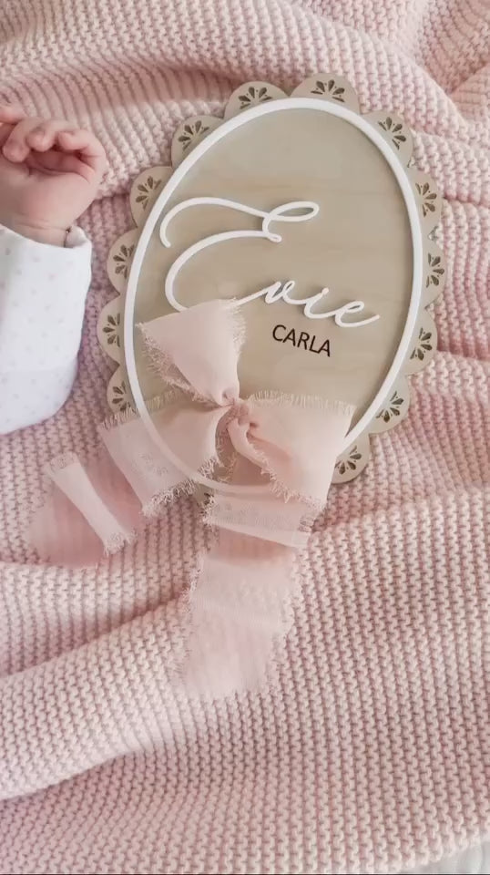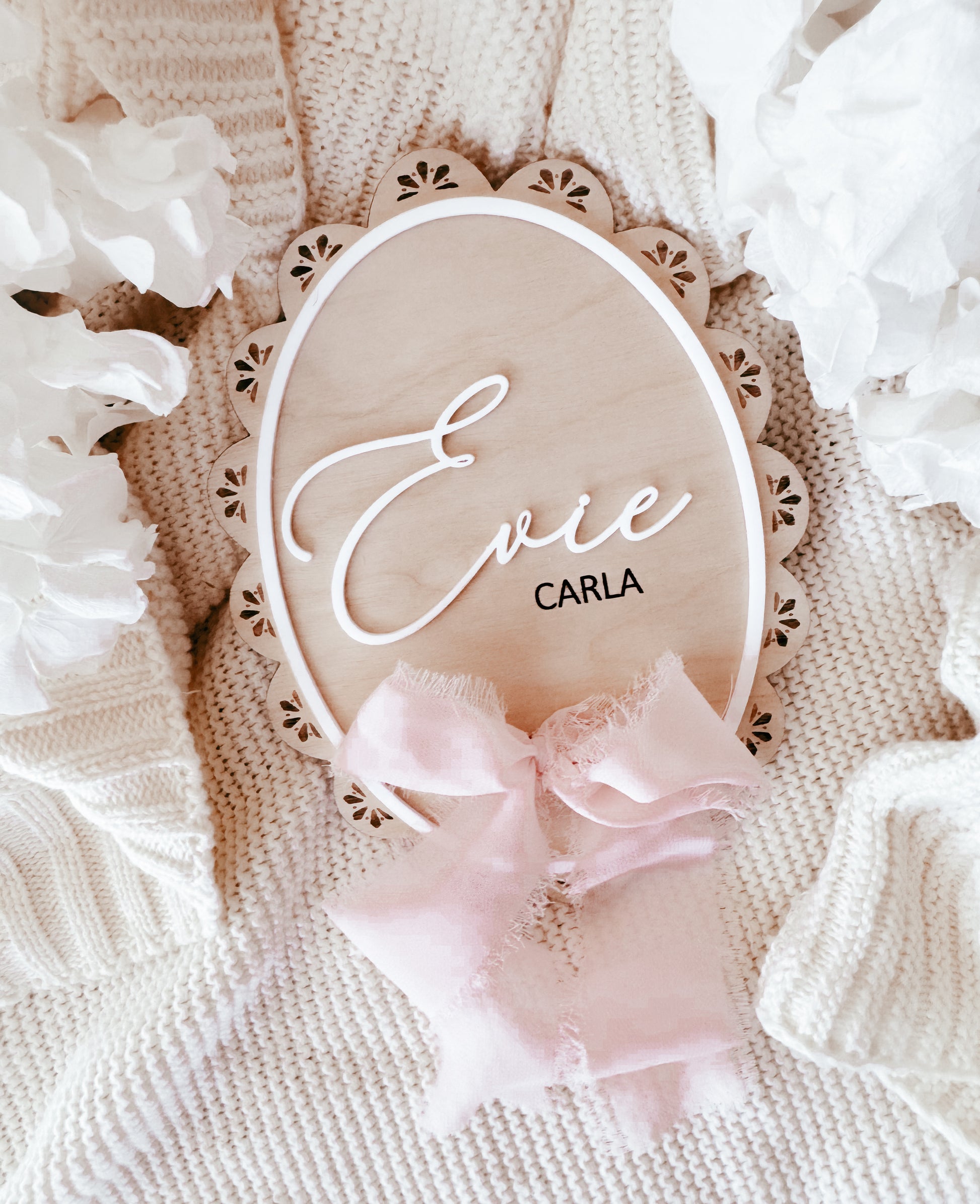 This gorgeous name sign is a lovely piece with an acrylic border and engraved pattern above it on birch wood, finished with a sweet ribbon - you can pick your colour- with crisp clean engraving for the names. First name will be in cursive and any others will be underneath in a plain capital font.