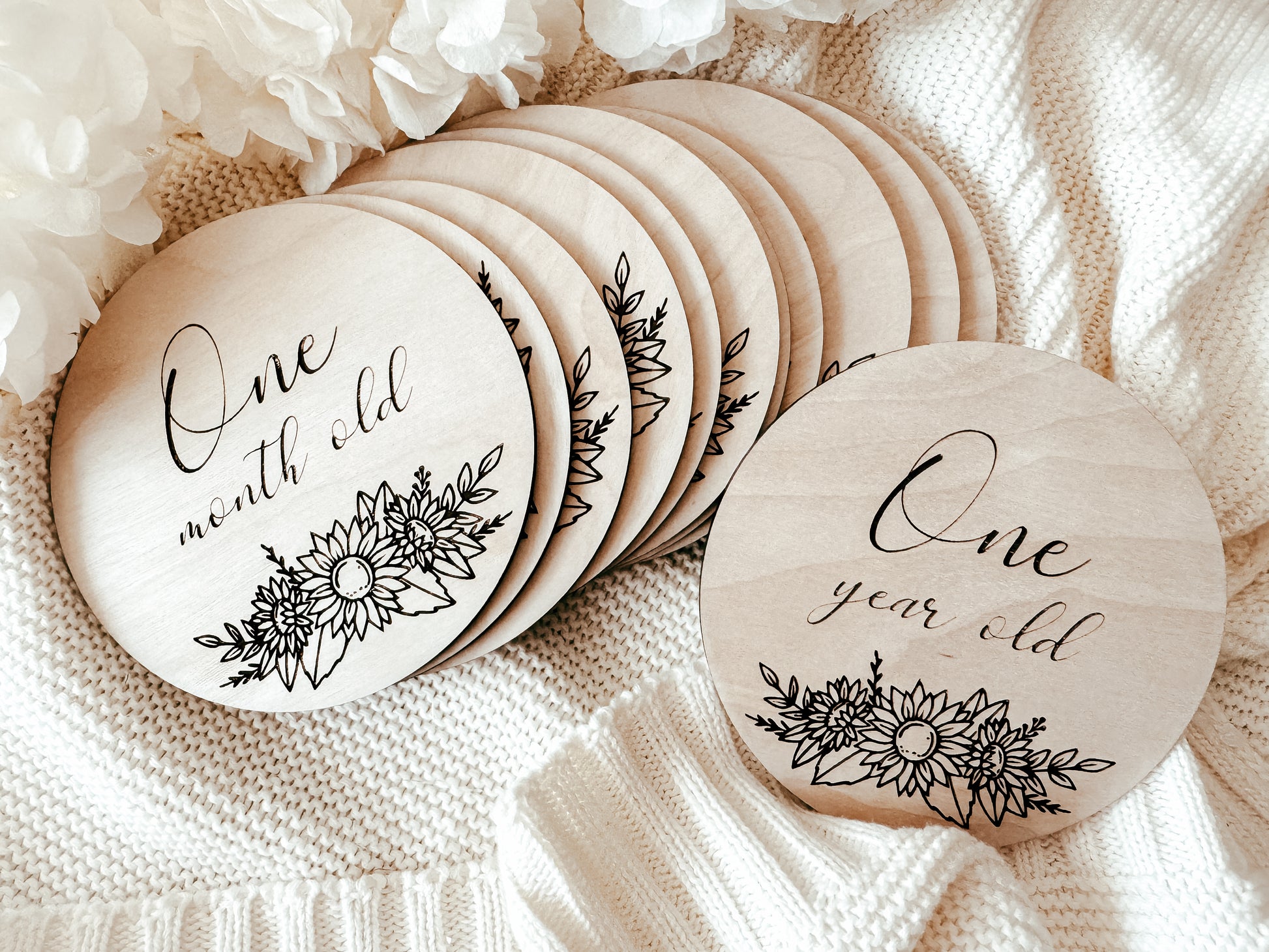 this beautiful sunflower pack has one month to one year old, made in bamboo and measuring 11cm, mark the monthly milestone in your babies life with this set!