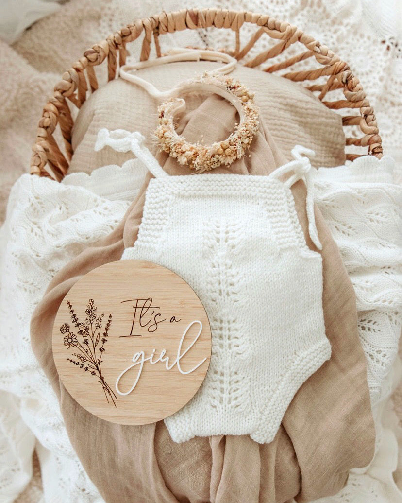 A beautiful disc 15cm made on bamboo with acrylic “girl” and “it’s a” engraved