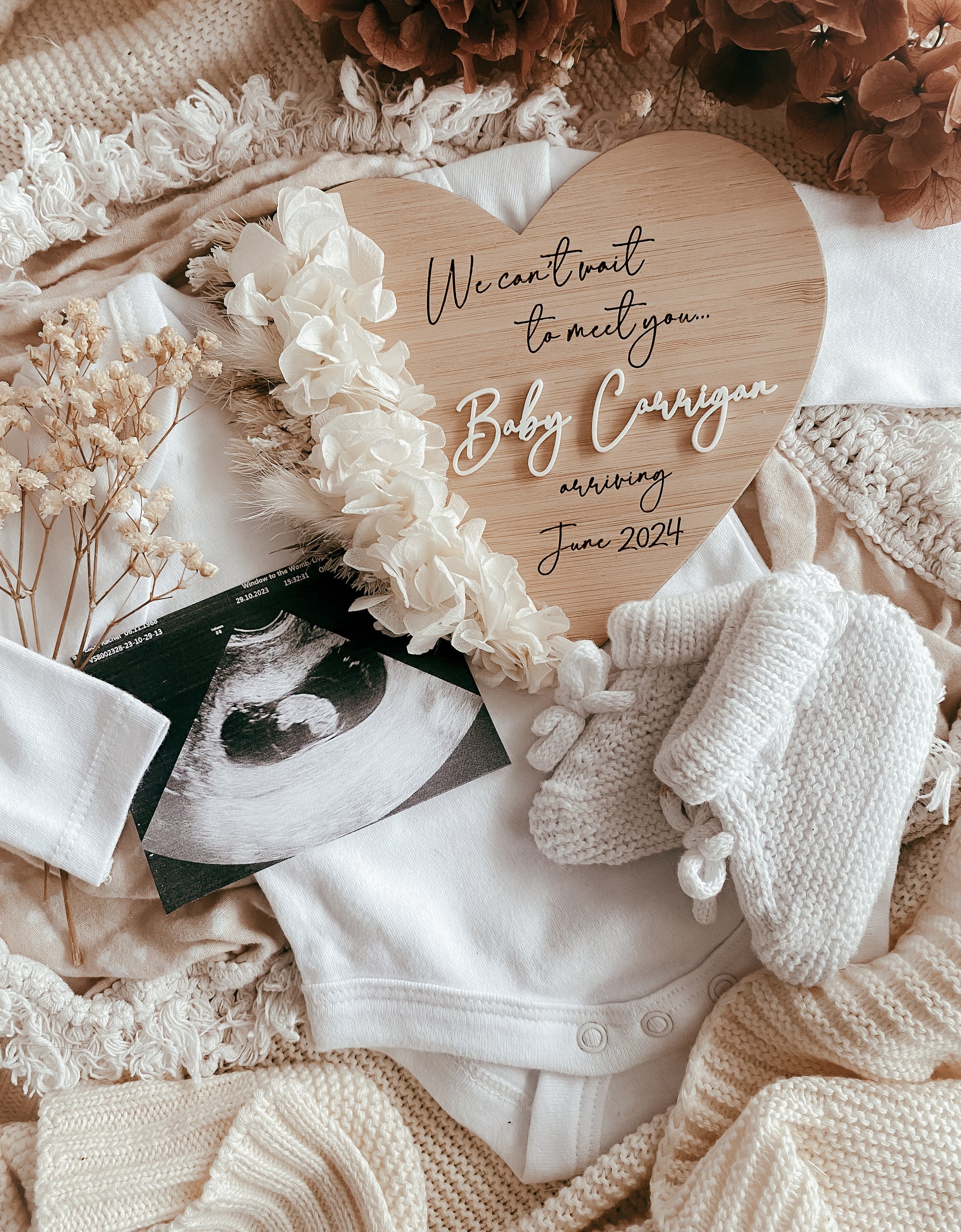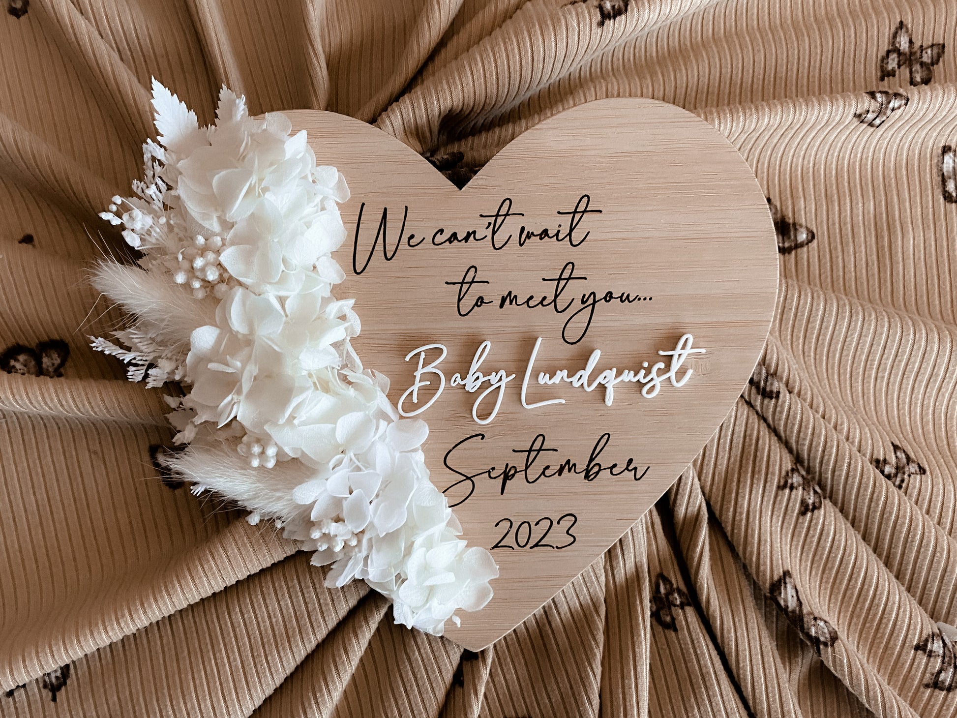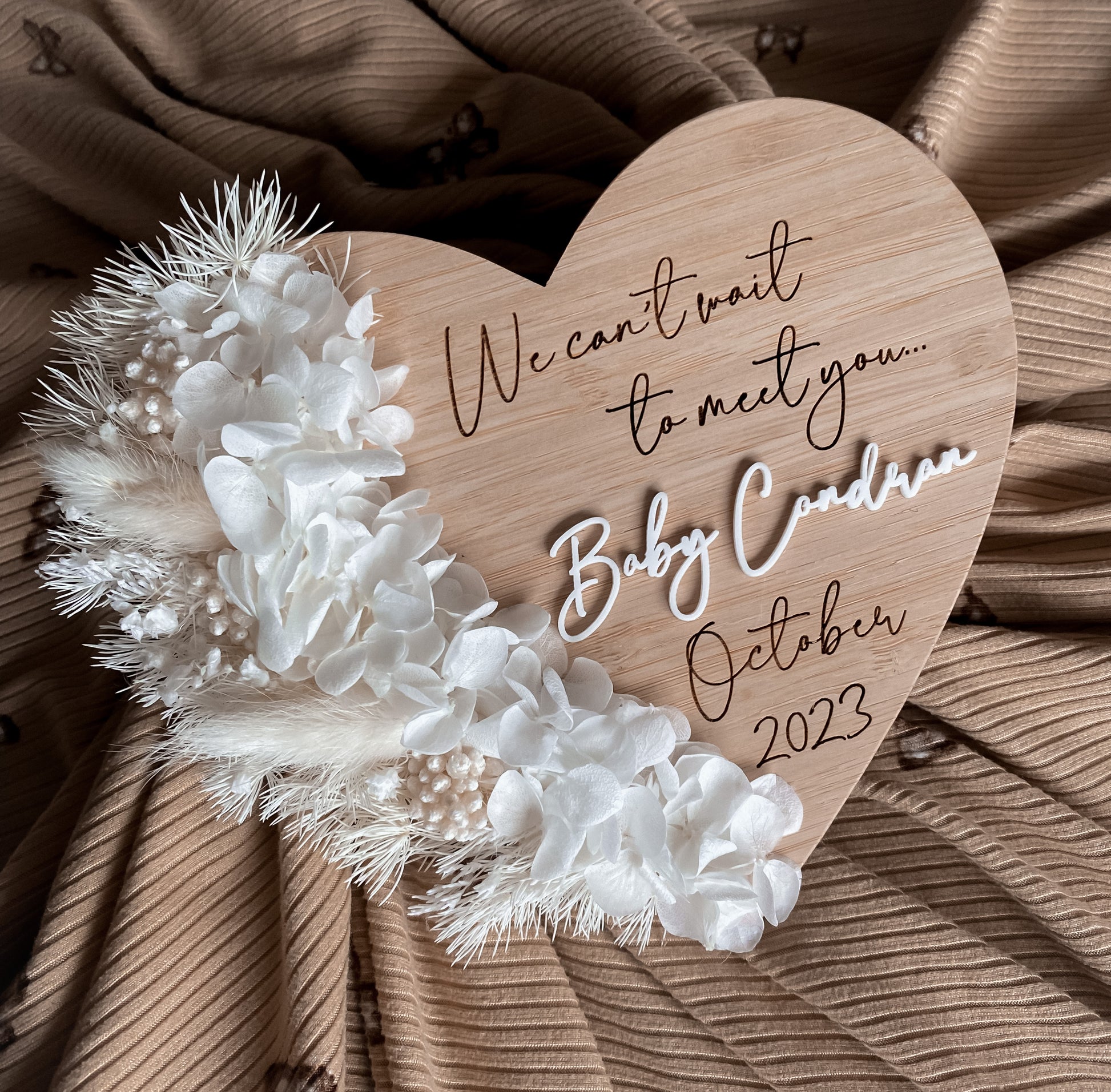 We can’t wait to meet you dried floral heart pregnancy announcement
