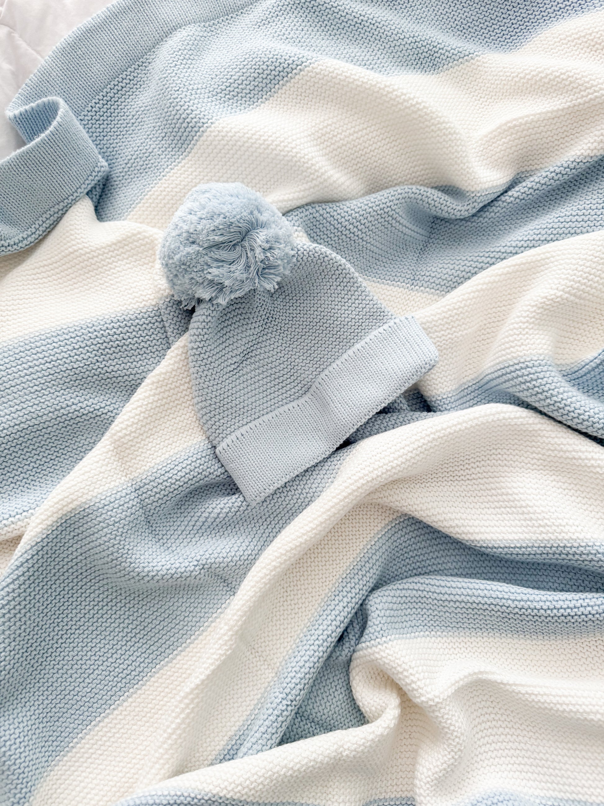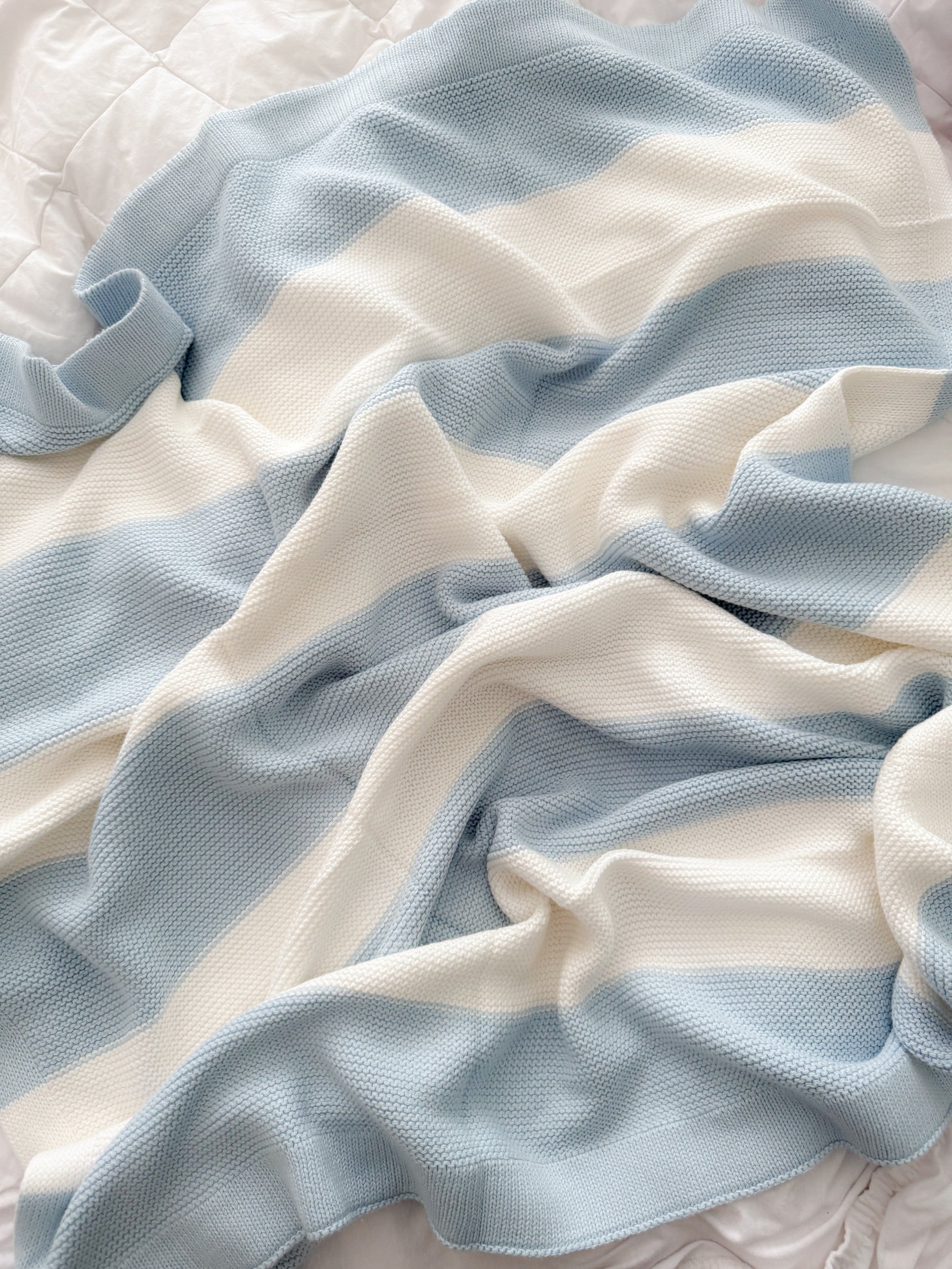 Our gorgeous white and baby blue knit stripe blanket made on soft cotton - not too thick so can still be used in summer months which helps when you live in Australia!