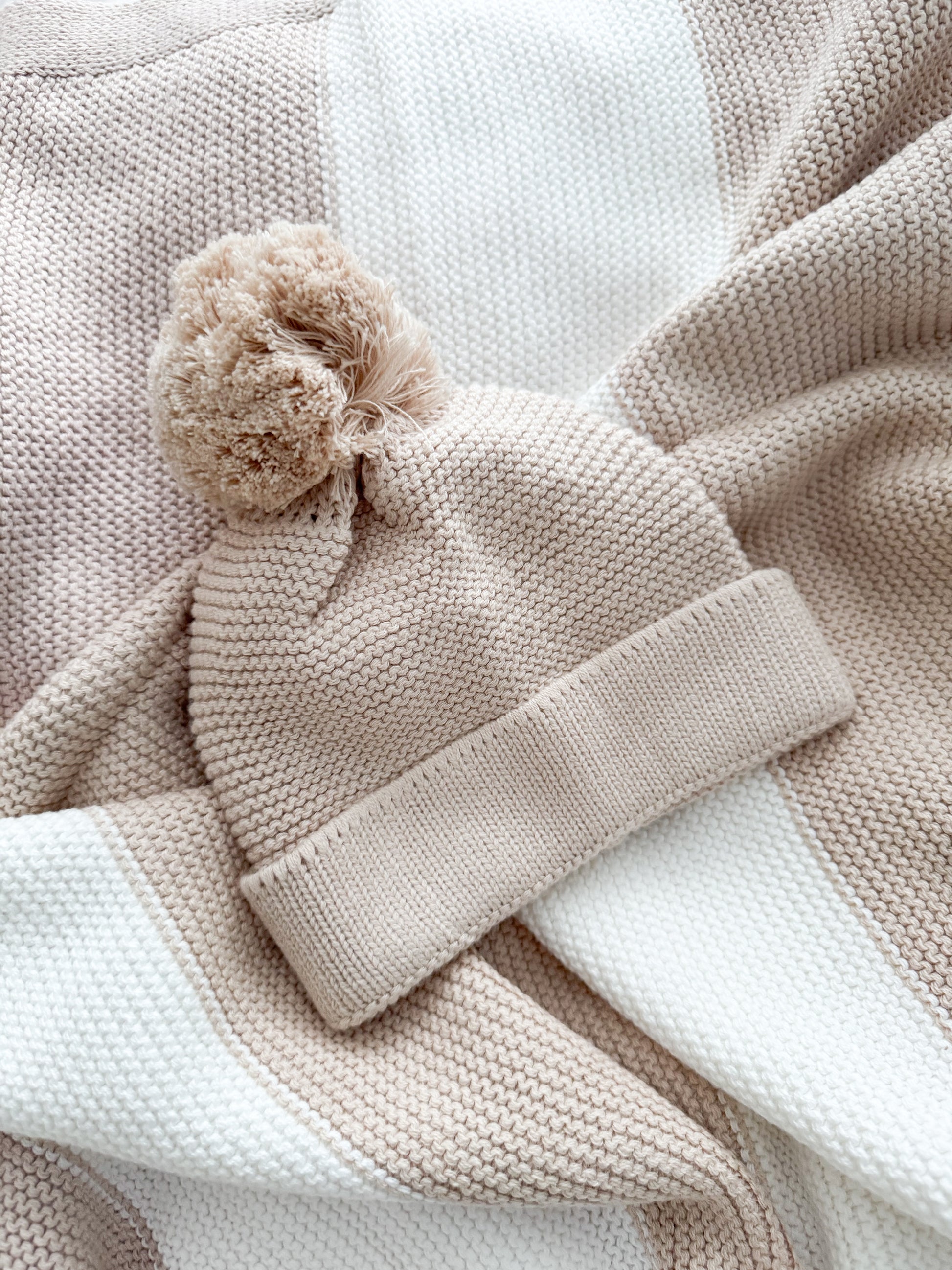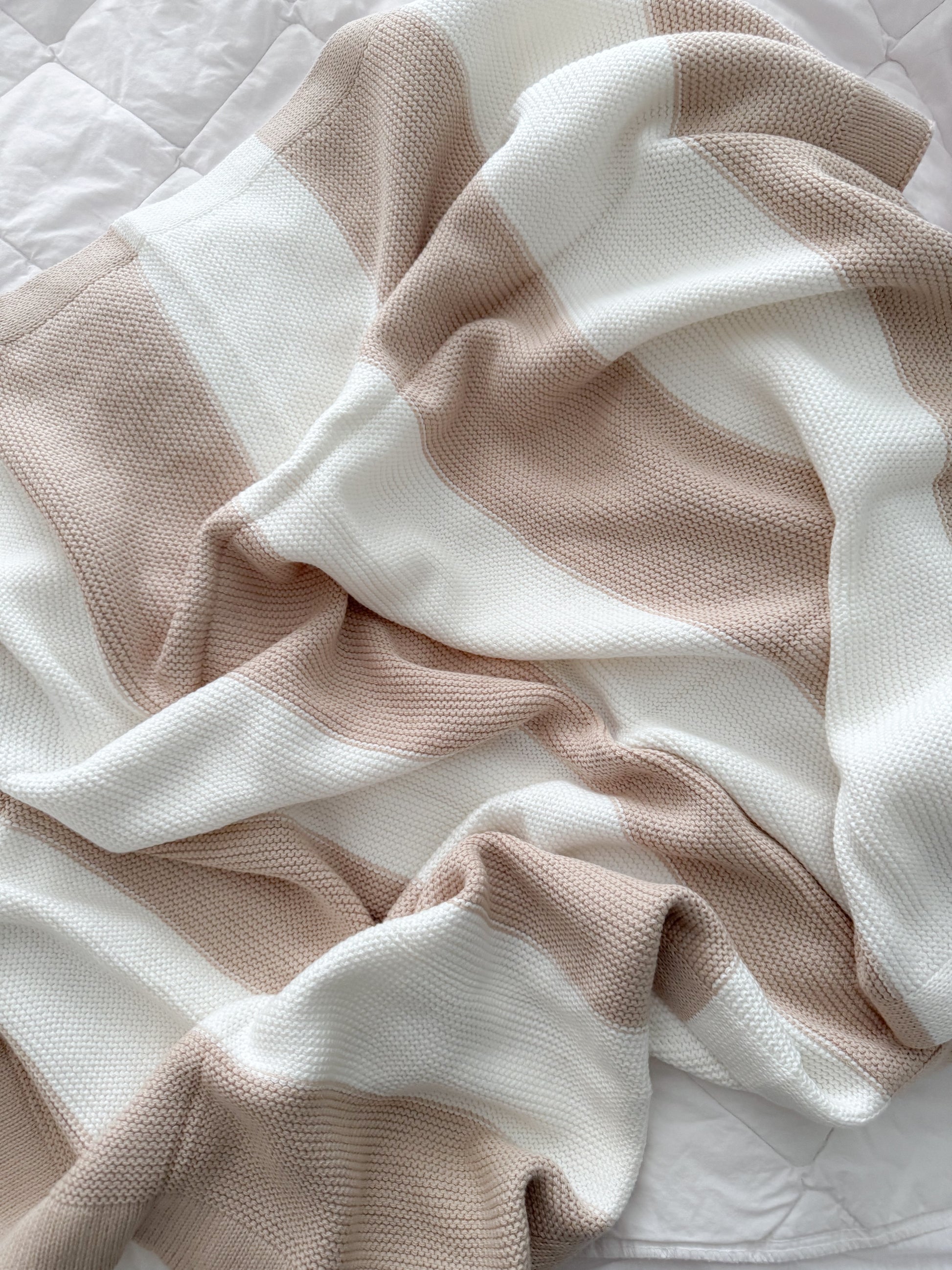 Our gorgeous white and oatmeal knit stripe blanket made on soft cotton - not too thick so can still be used in summer months which helps when you live in Australia!